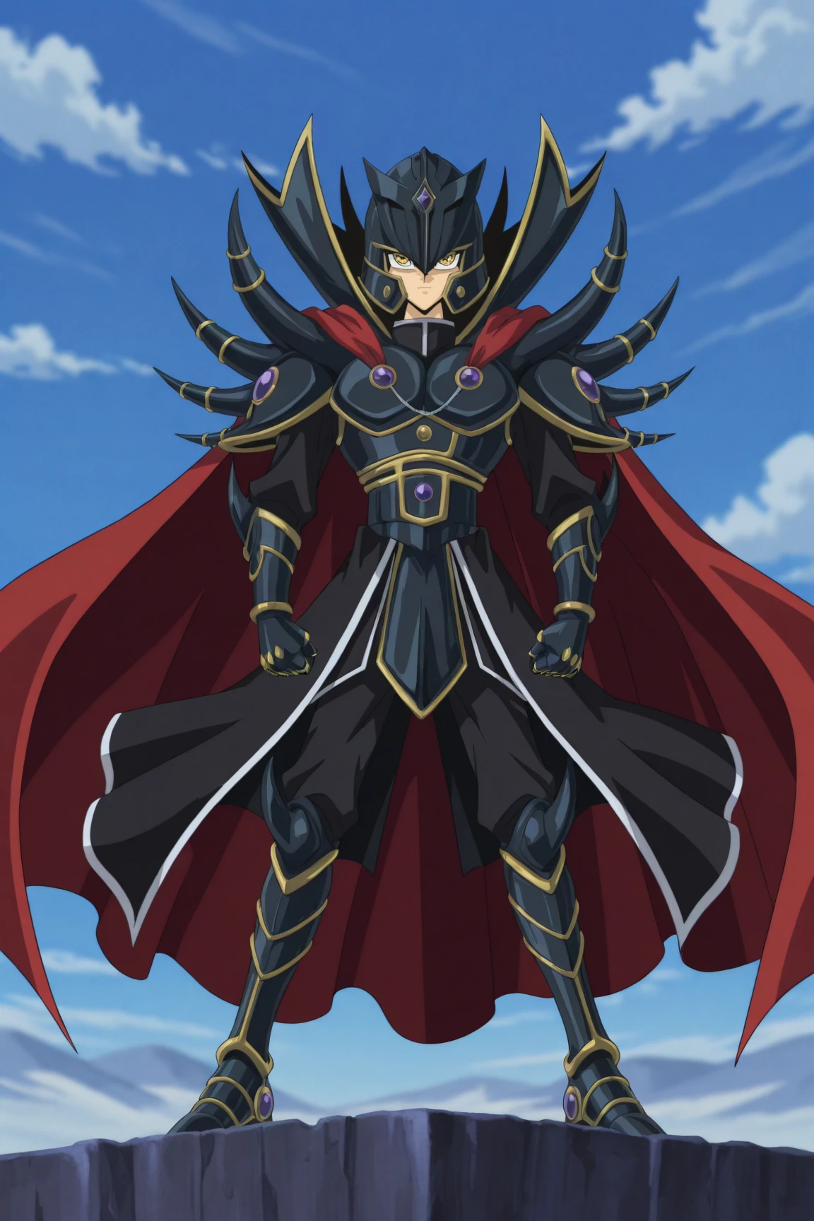 black, shoulder armor, red cape, black gauntlets, black waist cape, black pants, black boots