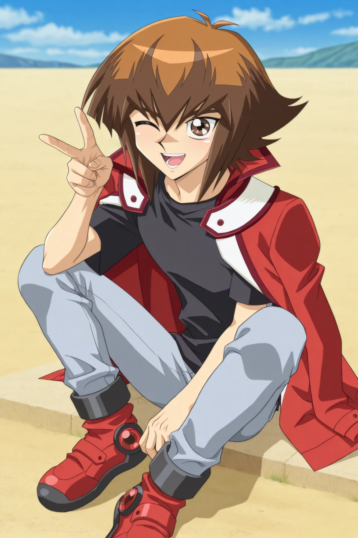 -red jacket, black shirt, duel academy uniform (yu-gi-oh! gx), white pants or blue pants, red sneakers