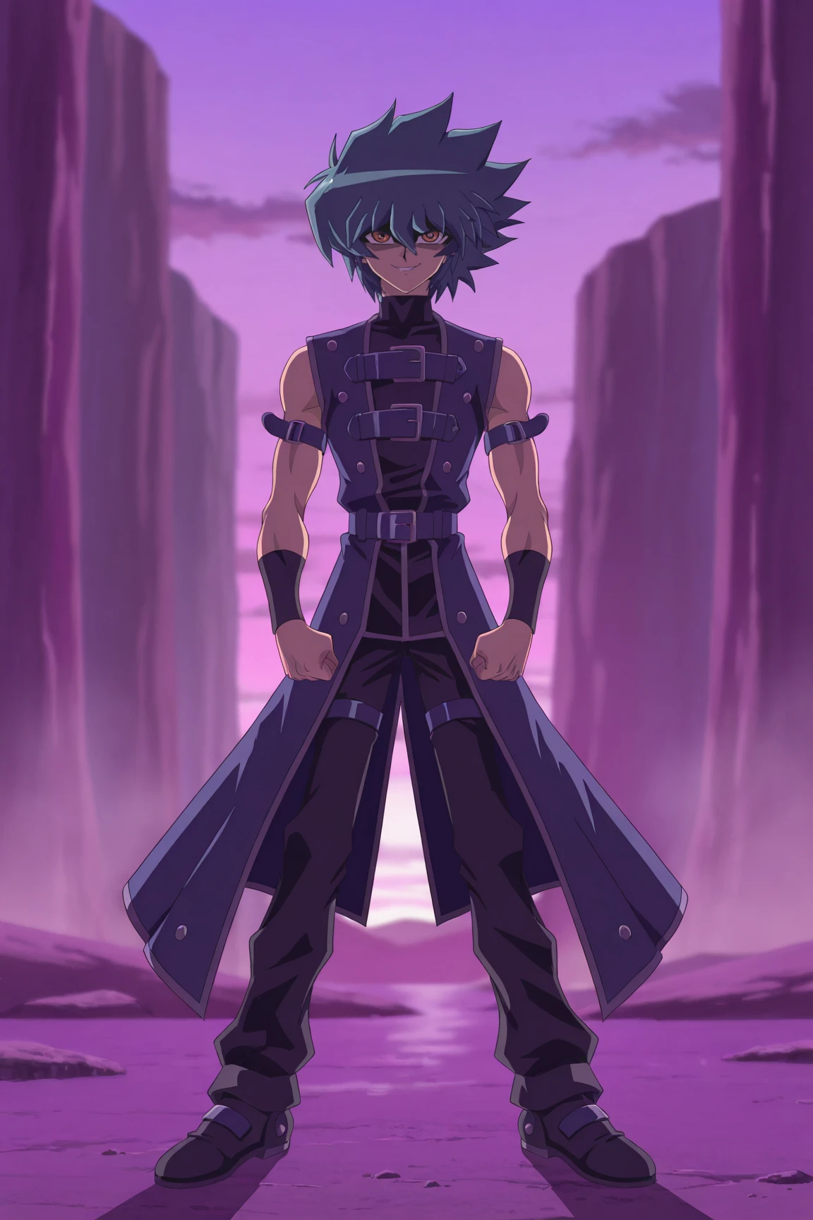 -shaded face, orange eyes, blue coat, black shirt, blue belt, black pants, arm belt, black wristband, thigh belt, black shoes