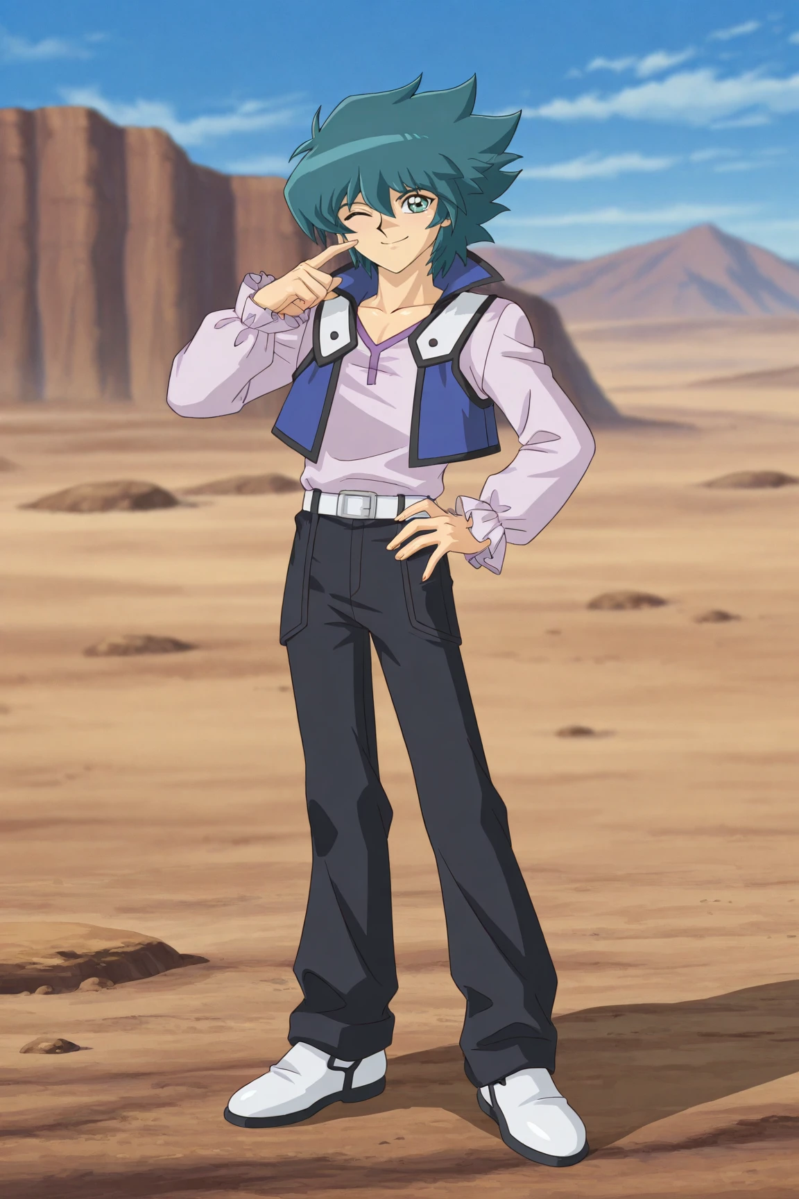 -purple shirt, blue cropped vest, frilled sleeves, black pants, white shoes, white belt