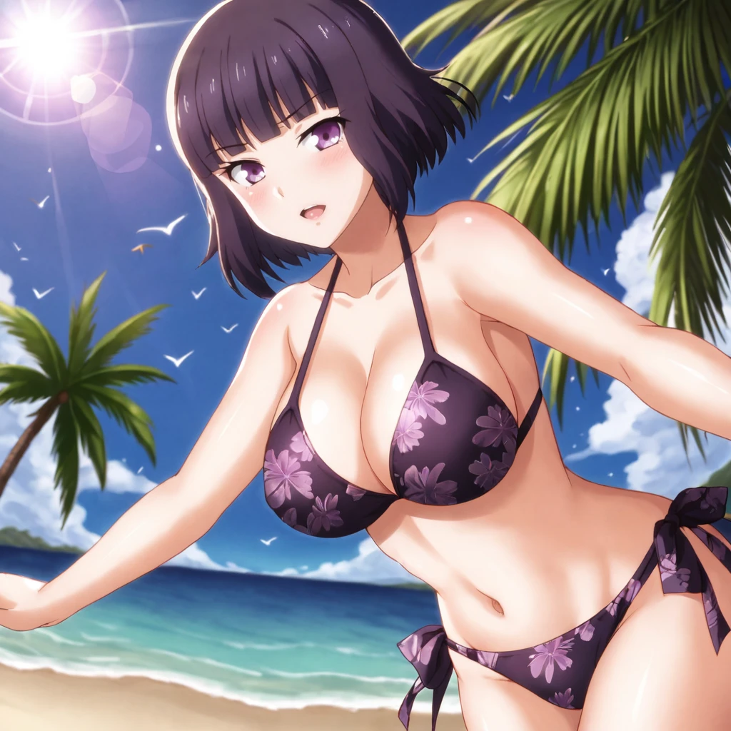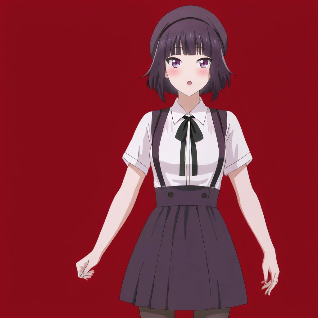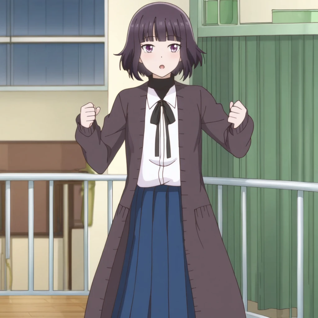Trigger with school sweater: MajoSchoolSweater, 1girl, solo, short hair, purple eyes, sweater vest, school uniform, white shirt, bob cut, blunt bangs, skirt, neck ribbon, black hair, short sleeves, long sleeves, collared shirt, black ribbon, cowboy shot