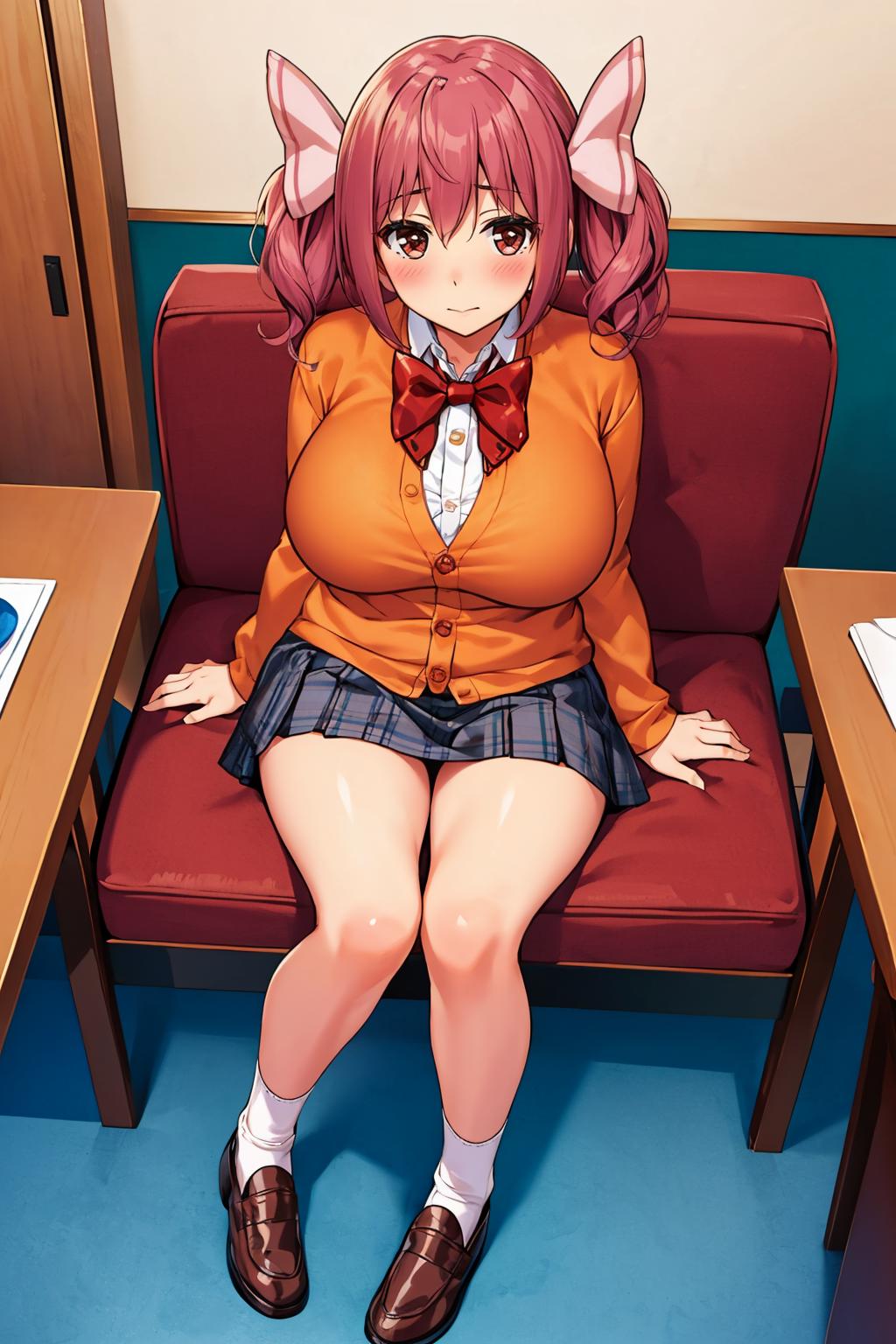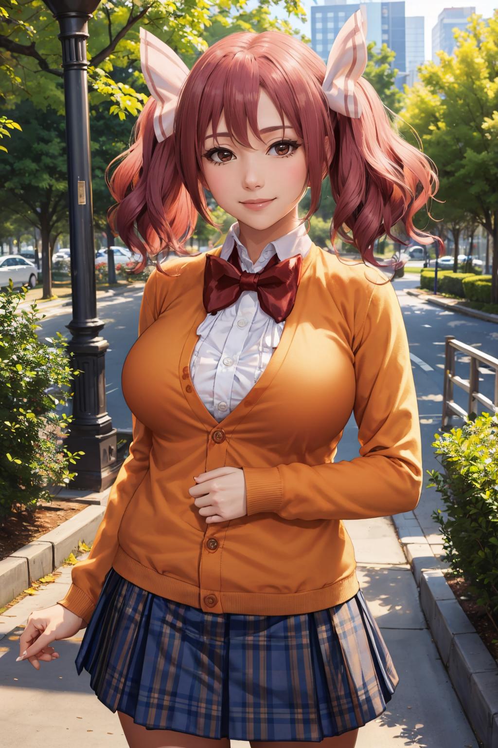 Add "hair bow, orange cardigan, bowtie, plaid skirt" for her casual outfit.