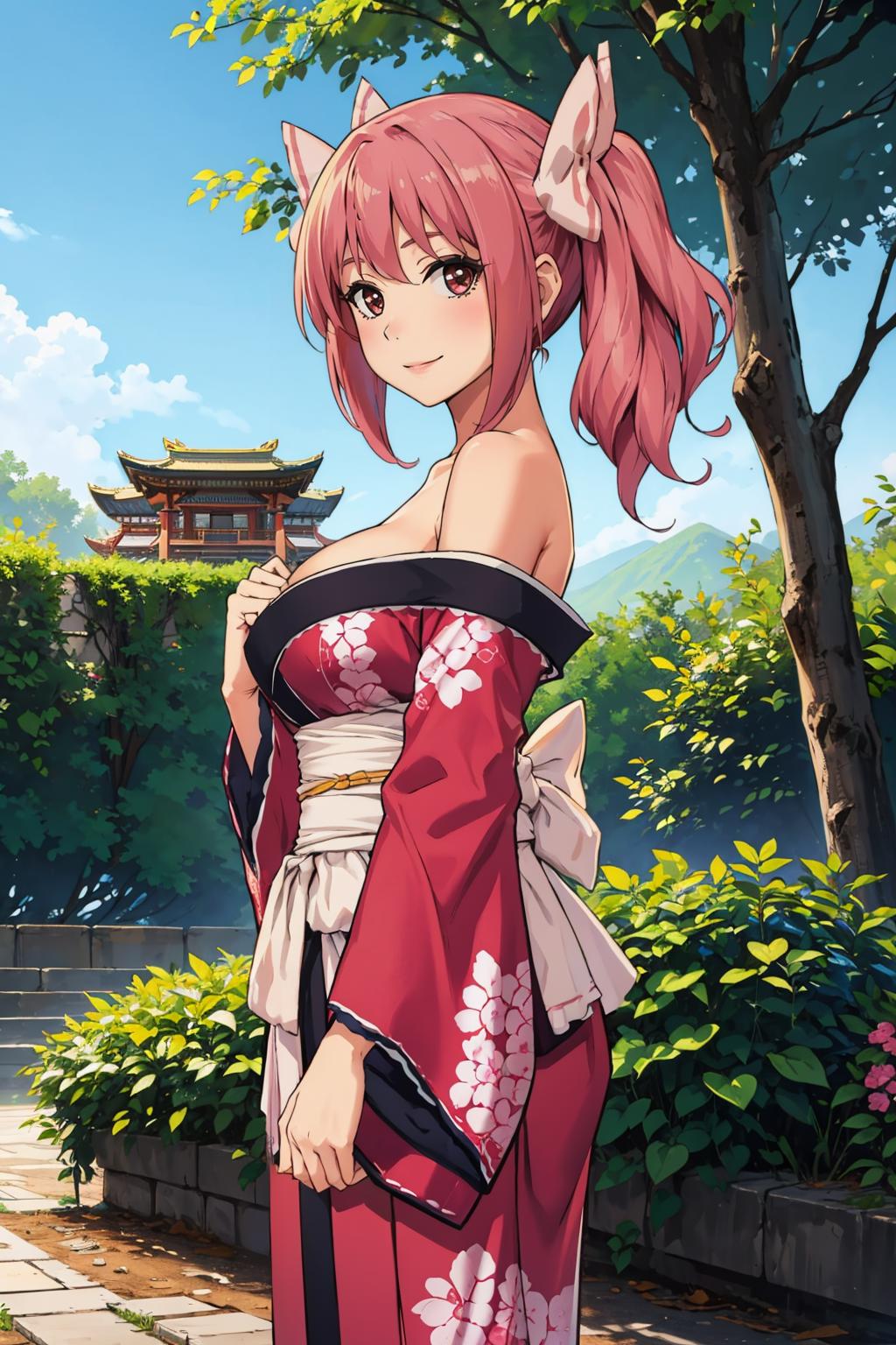 Add "hair bow, off-shoulder, pink kimono, sash, floral print" for her kimono.