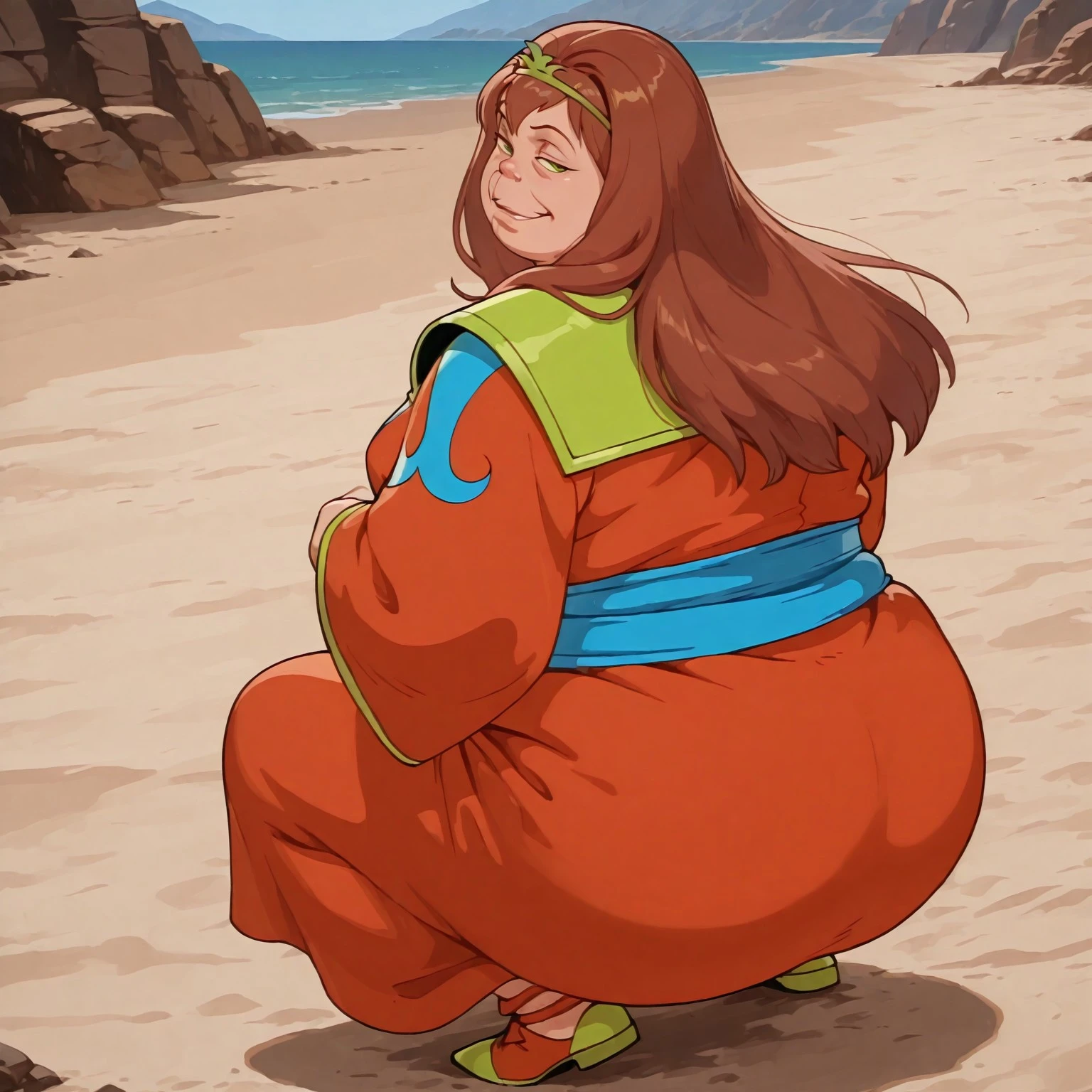 1girl,solo,green eyes,brown hair,long hair,tiara,robe,sash,chubby,shoes