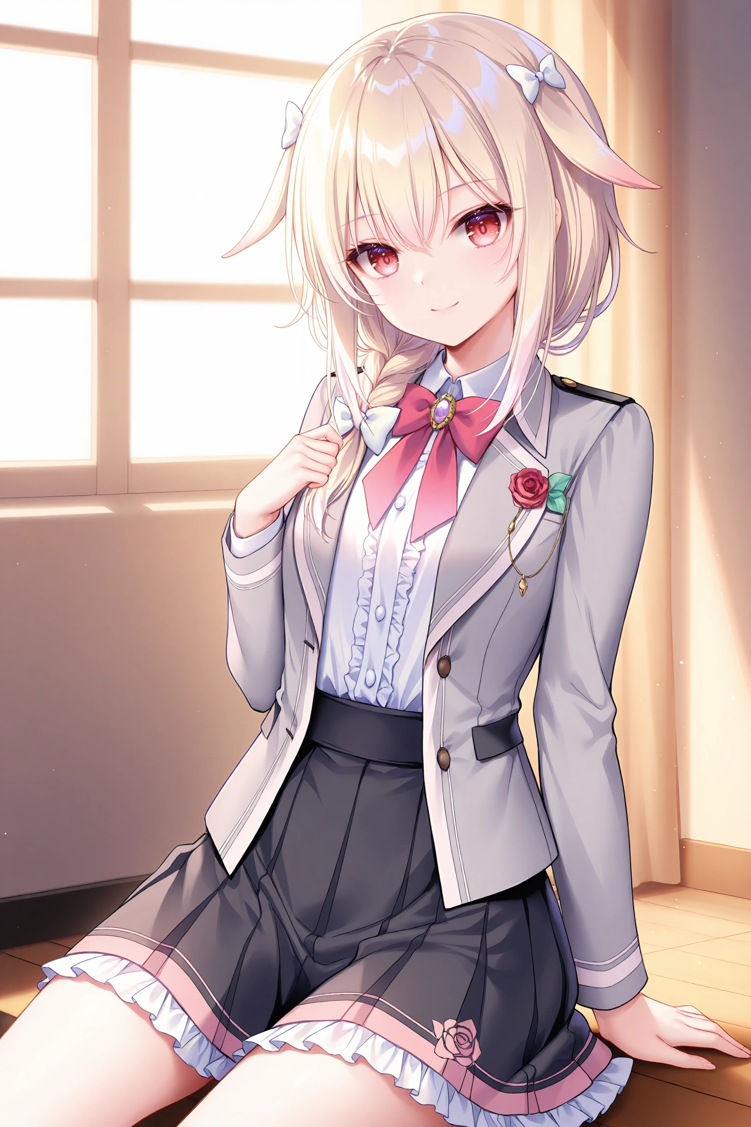 1girl,ensemble style,usami(ensemble),red eyes,short hair,blonde hair,single braid over shoulder,hair ribbon,hair flaps,white hair bow,