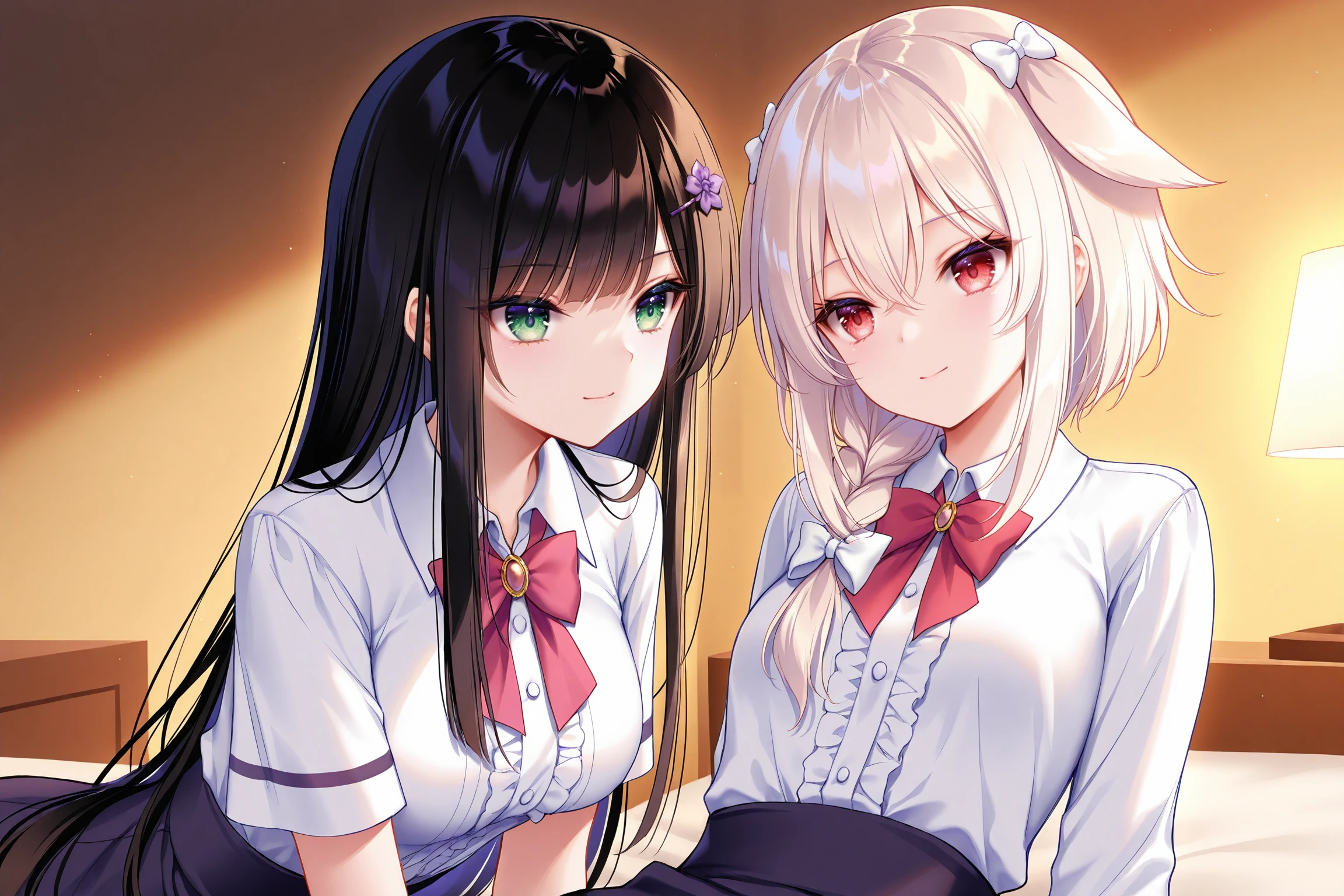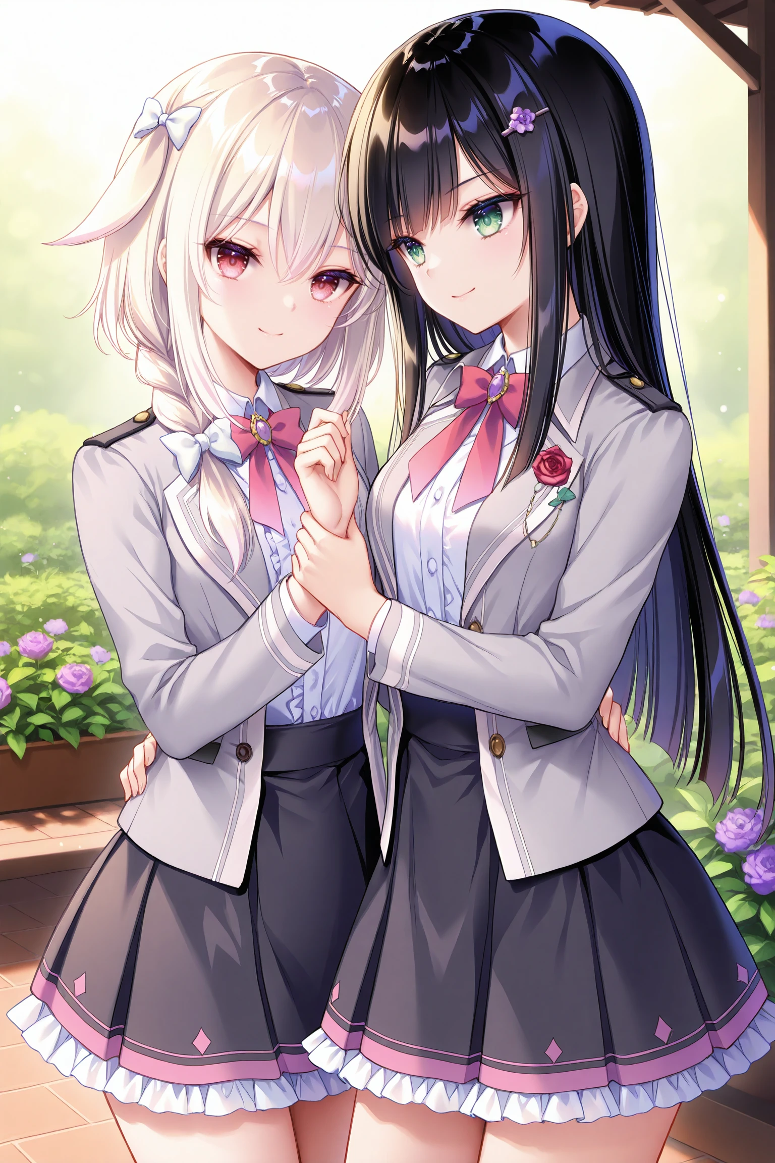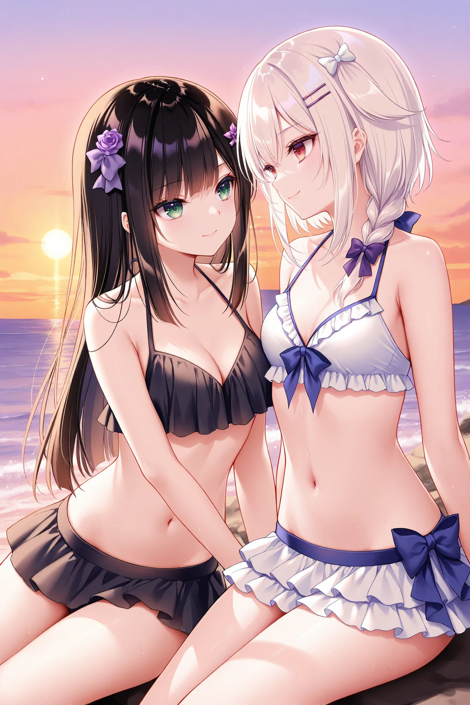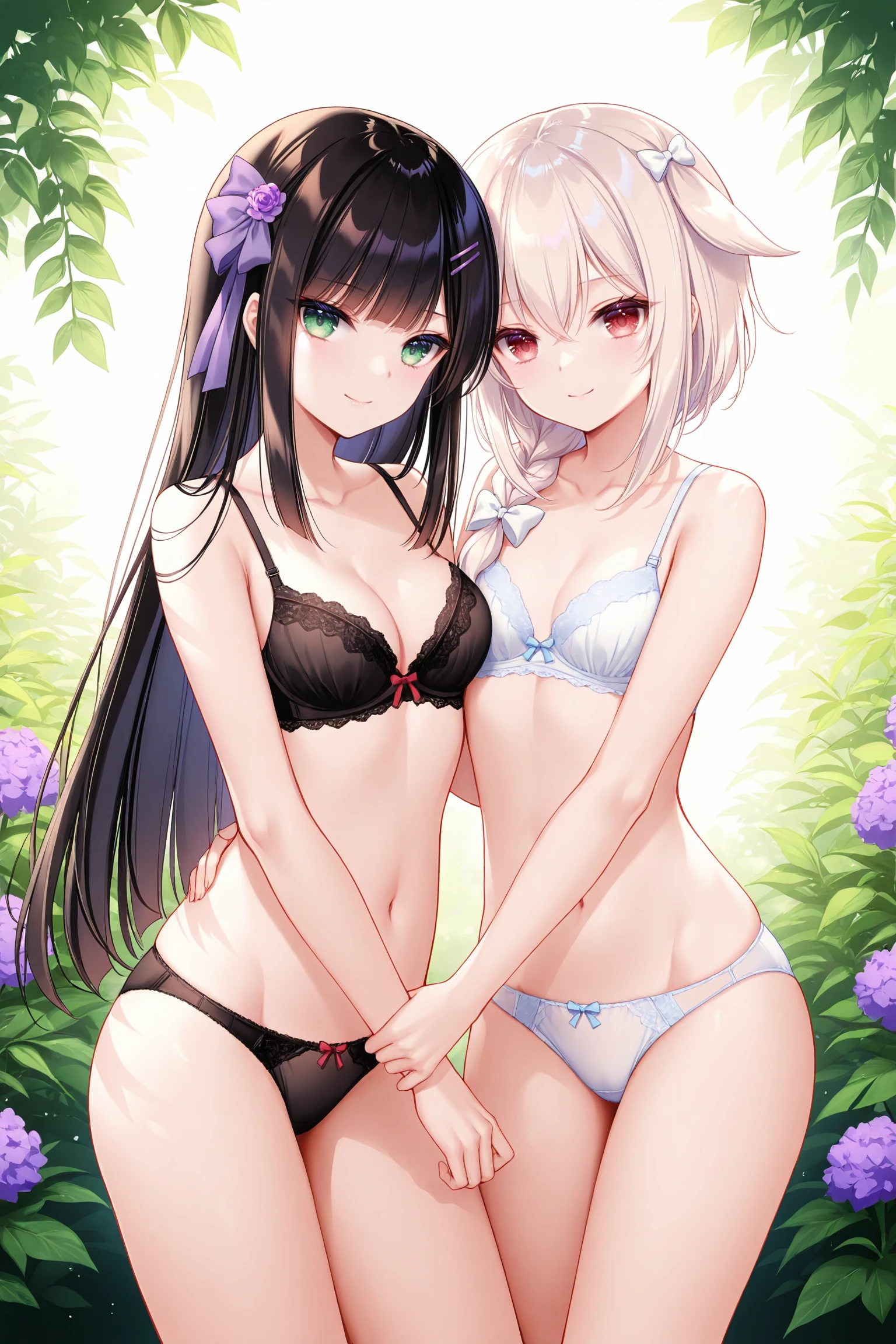 2girls,multiple girls,ensemble style,sumire(ensemble),green eyes,black hair,long hair,purple flower hairpin,straight hair,