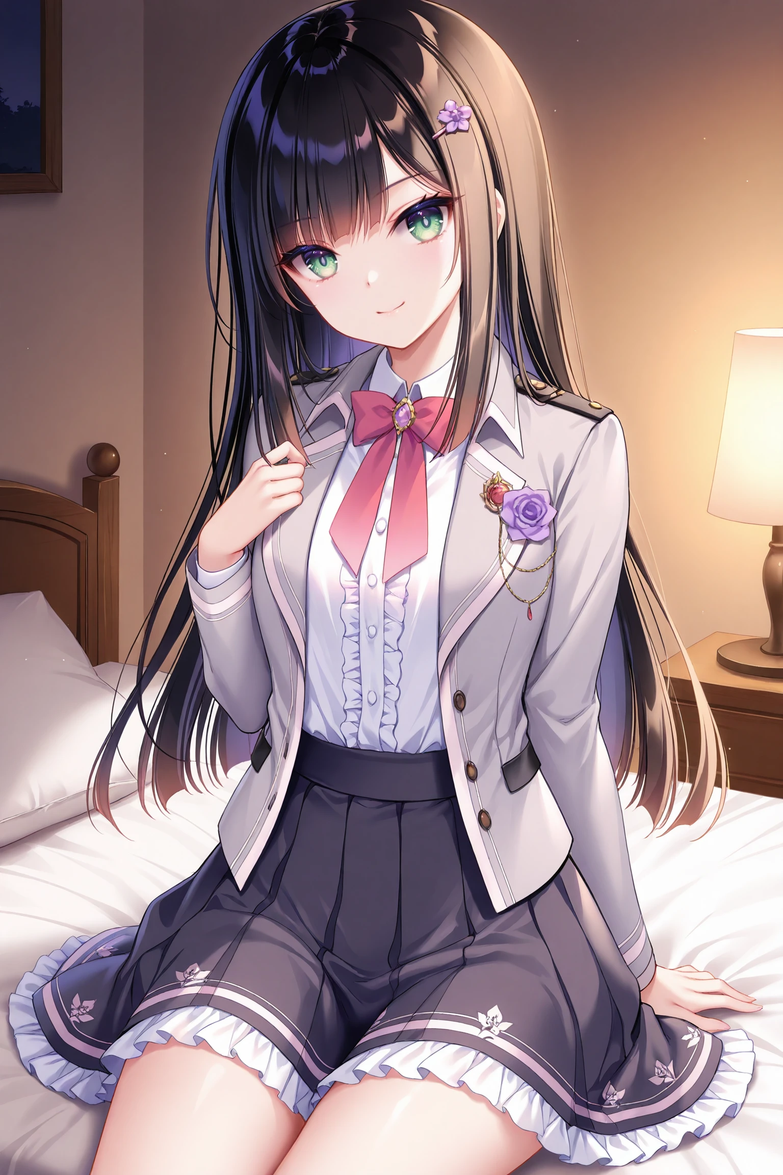 ensemble style, sumire(ensemble),1girl,green eyes,black hair,long hair,purple flower hairpin,bangs,