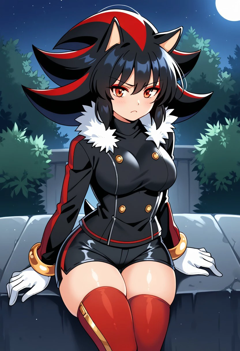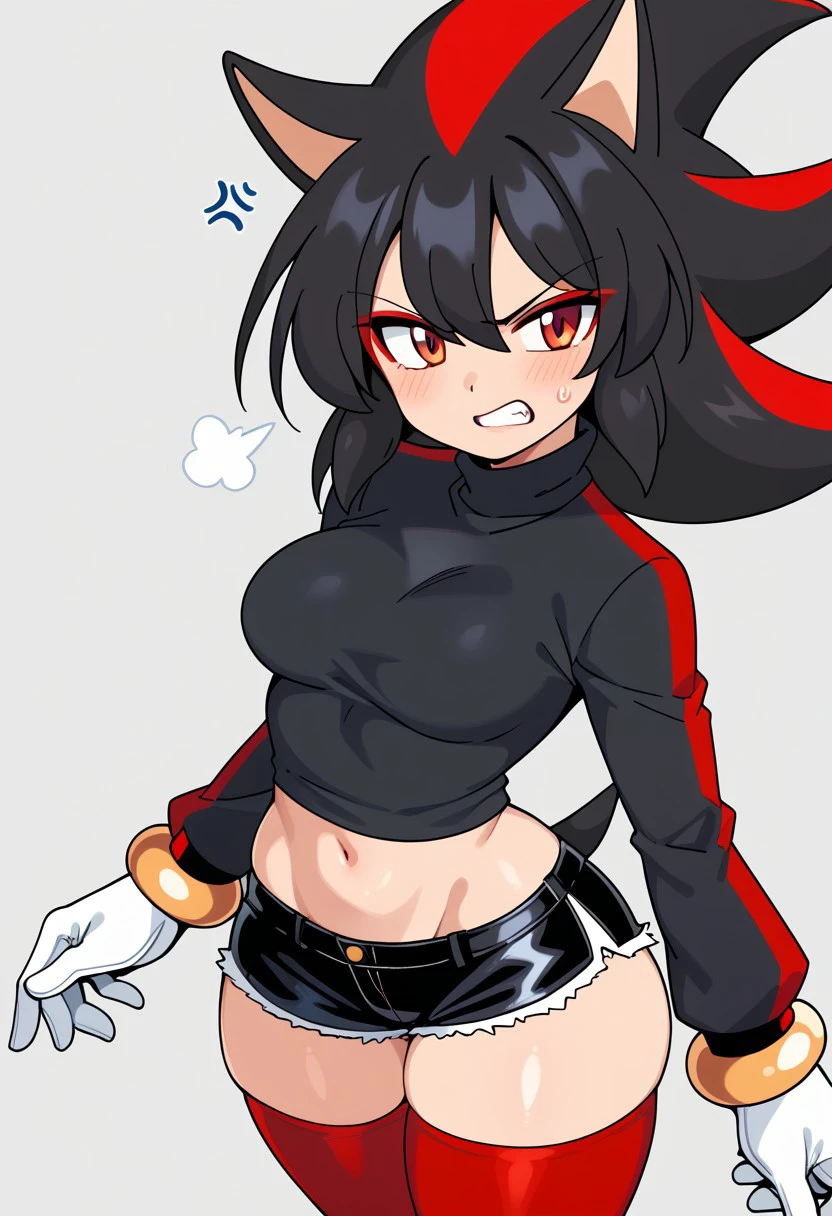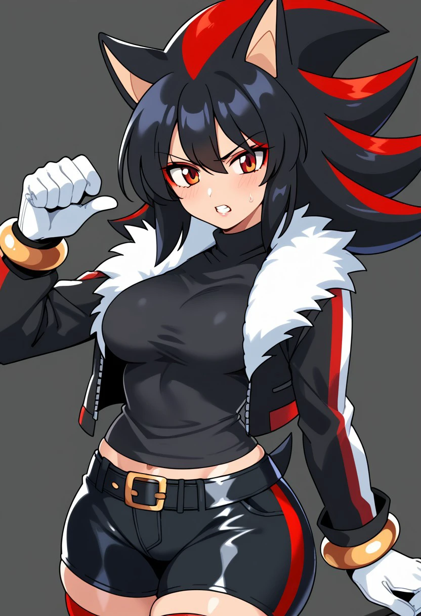 ShadowGijinka, 1girl, big hair, black hair, red highlights, red eyeshadow, hedgehog ears, hedgehog tail, red eyes, spiked hair, hair between eyes, sidelocks, gold bracelets, white gloves, white shoes, Two-tone shoes