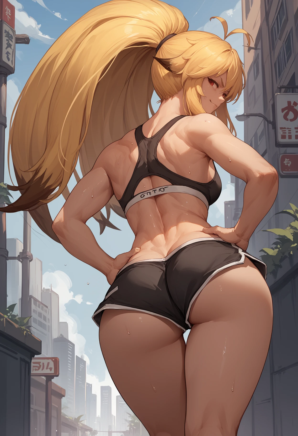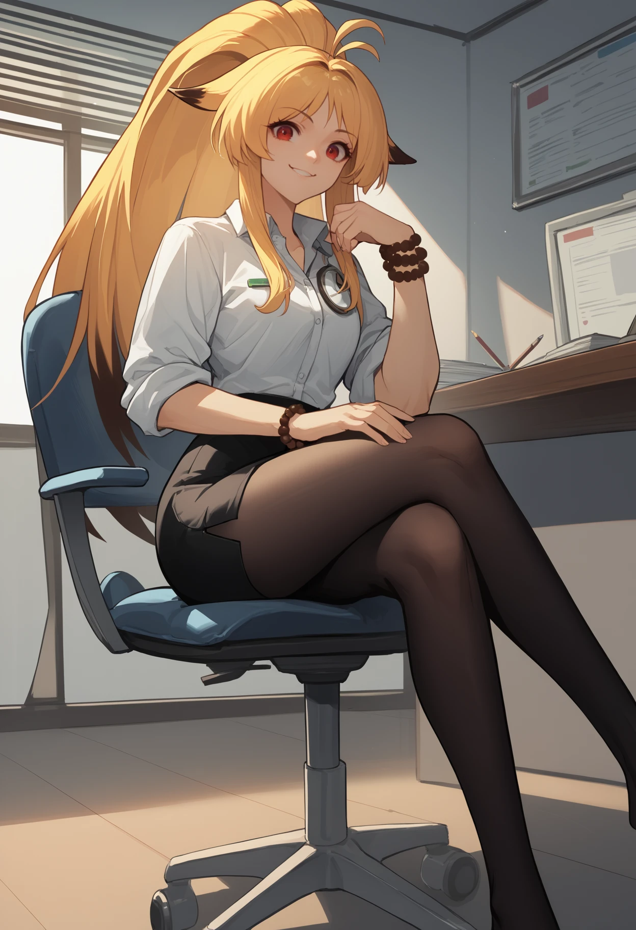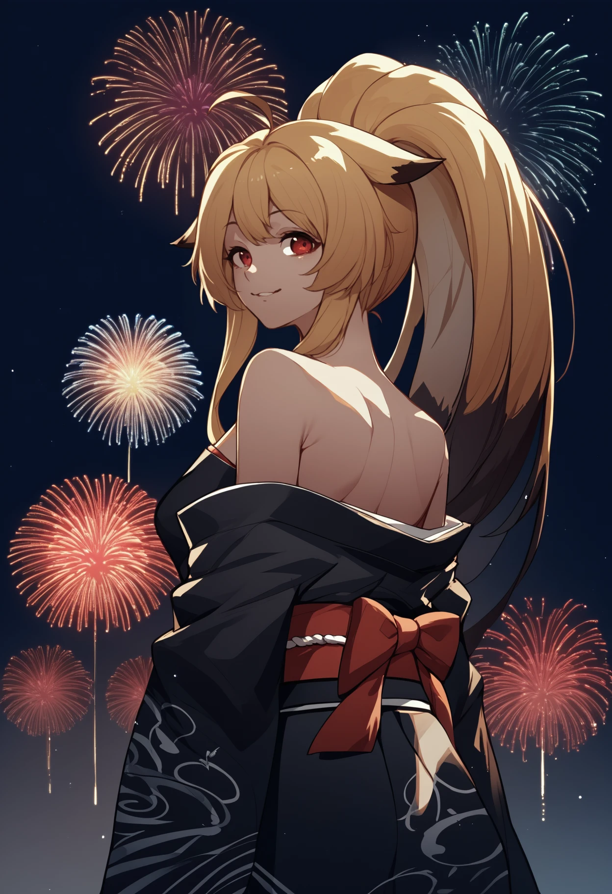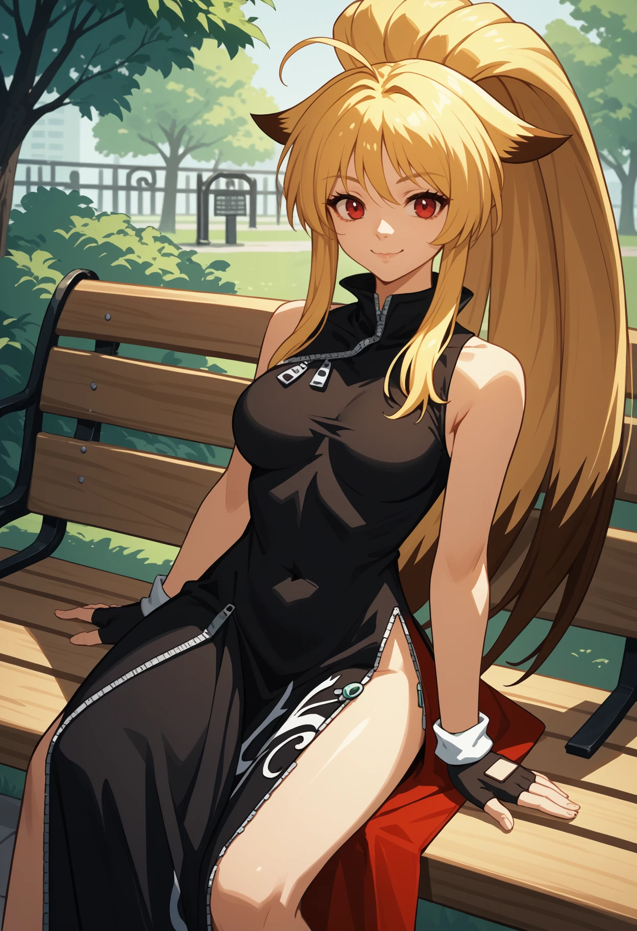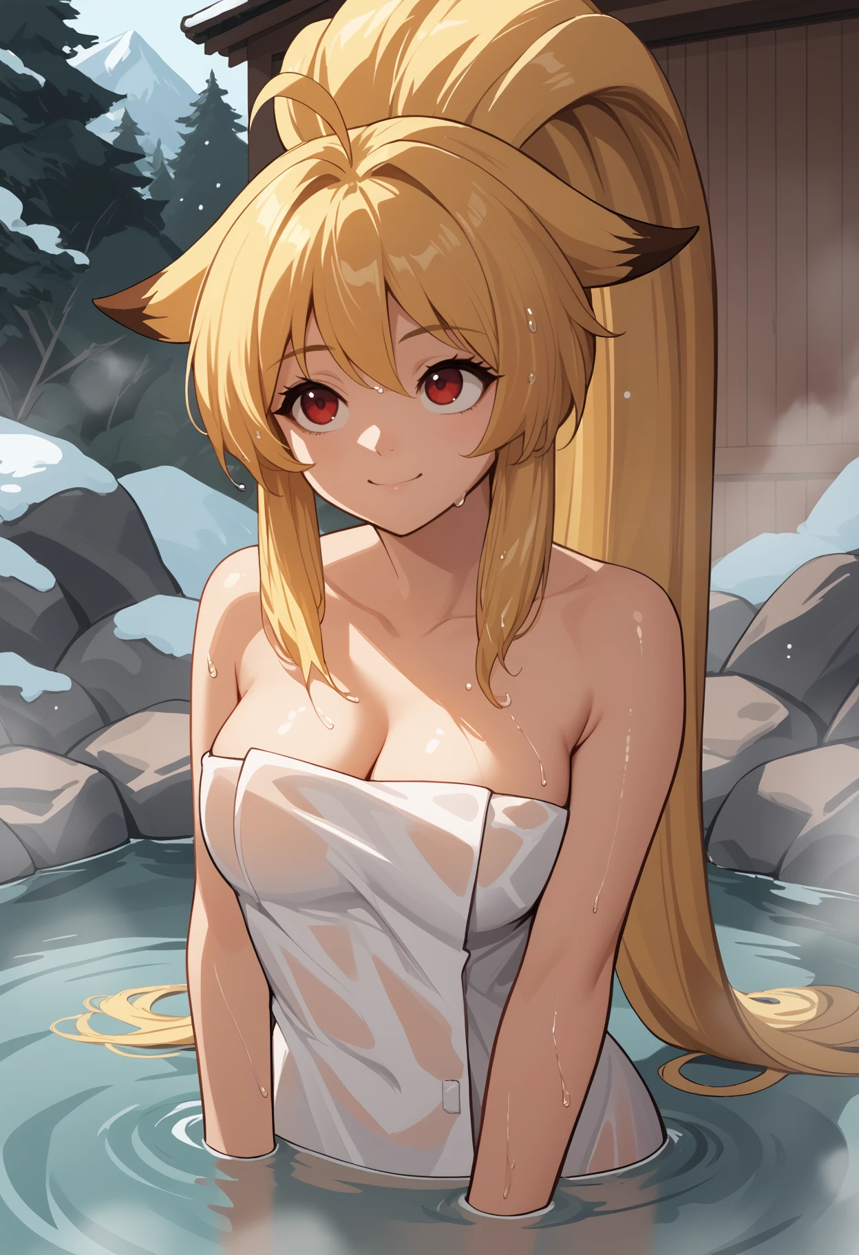 xiaomu, long hair, two-tone hair, blonde hair, ahoge, ponytail, animal ears, red eyes