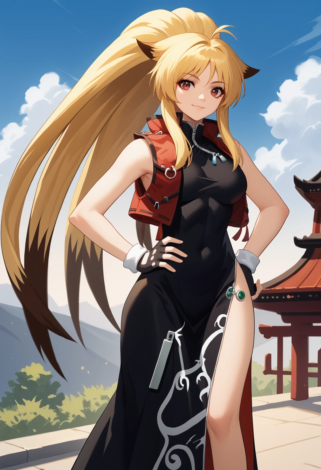 Default Outfit: chinese clothes, red vest, open vest, zipper, long dress, black dress, china dress, side slit, fingerless gloves, prayer beads