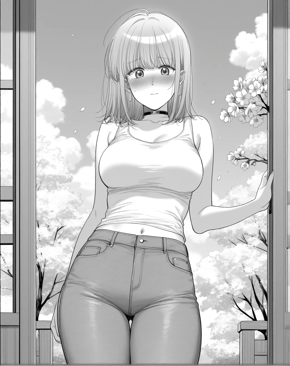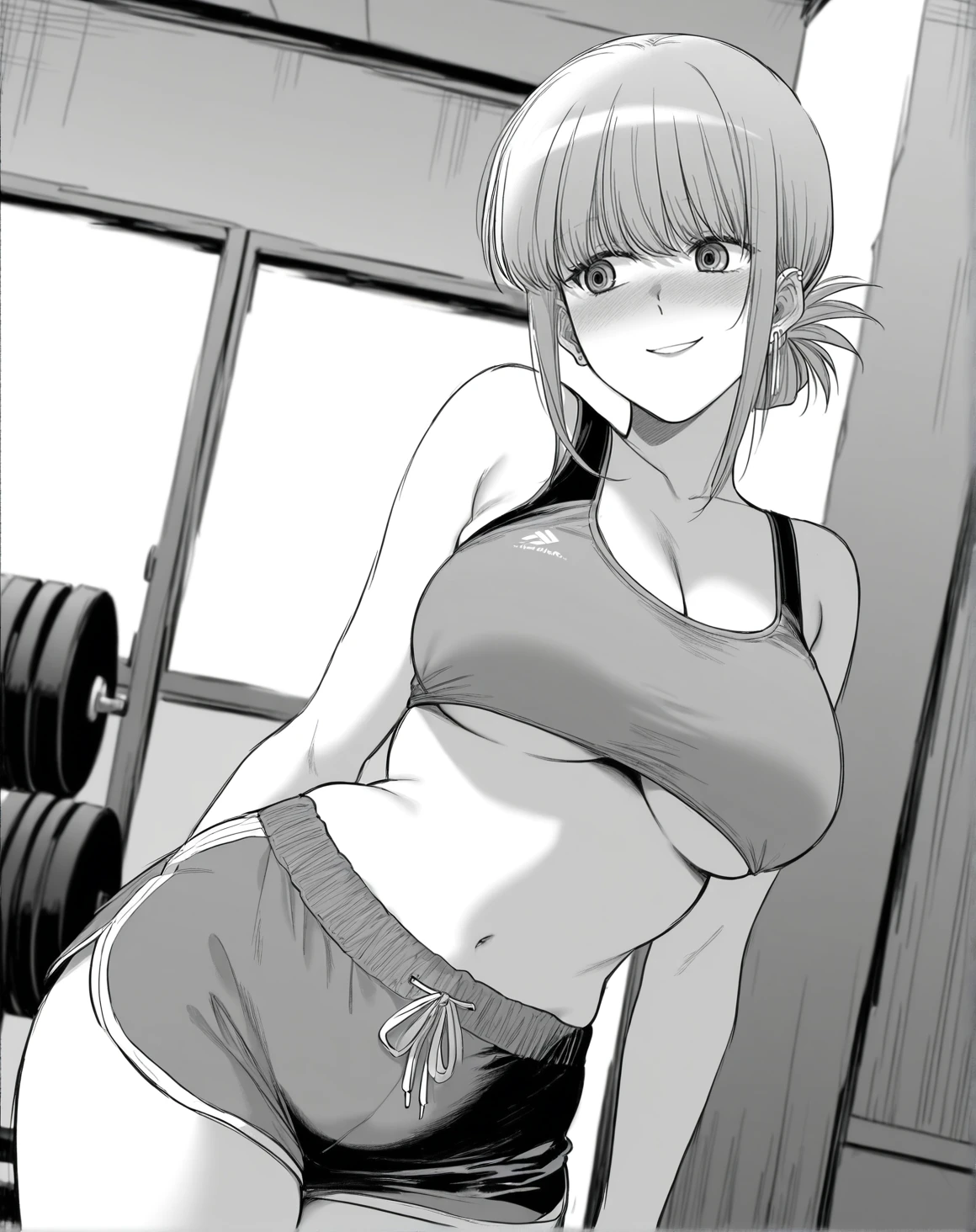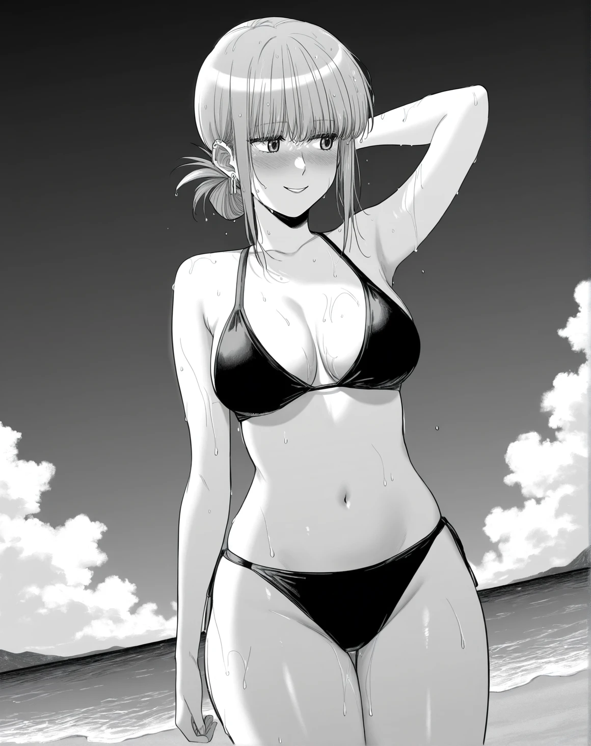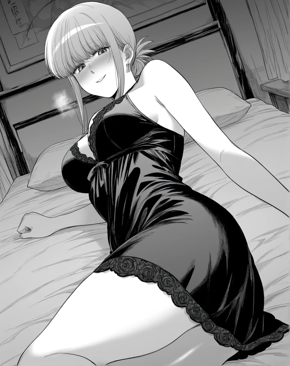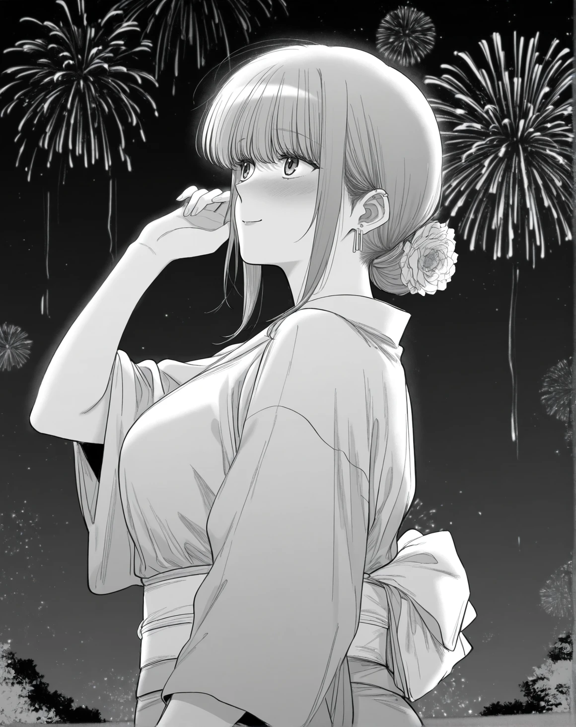 yamadawah, monochrome, greyscale, sidelocks, ear piercing, medium hair, folded ponytail