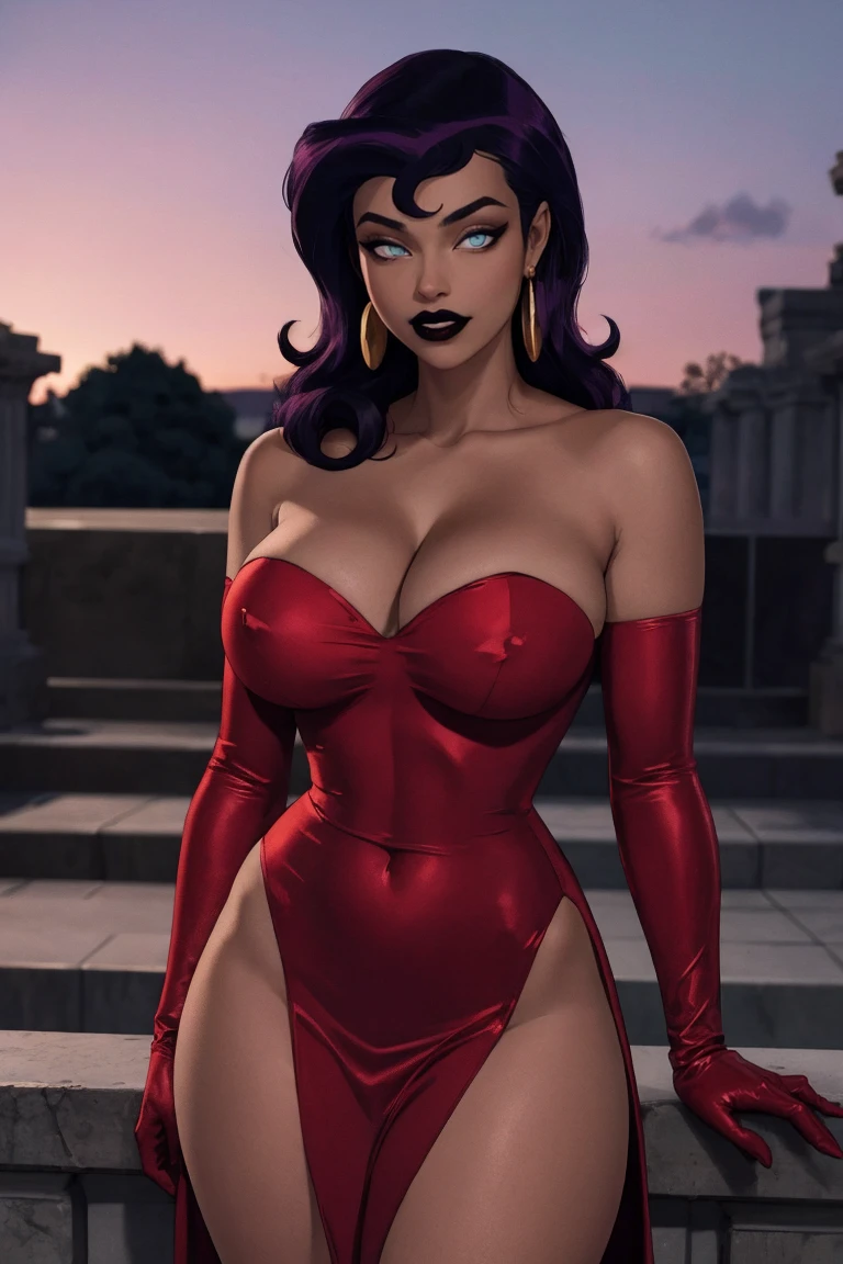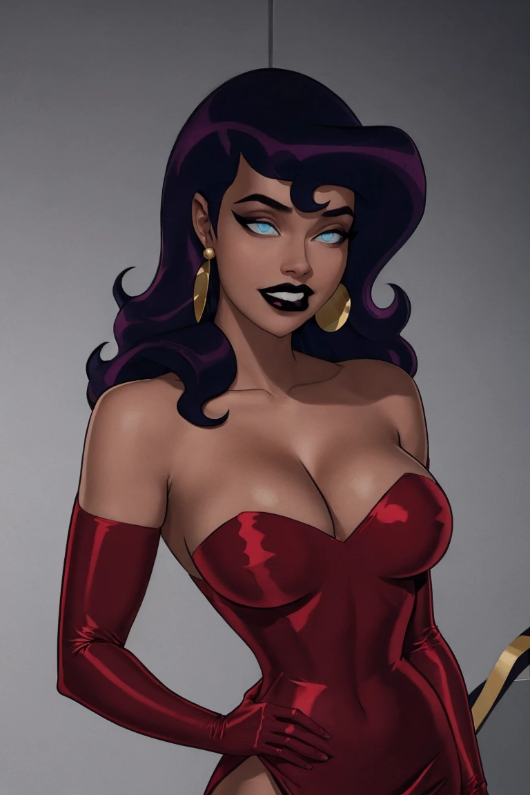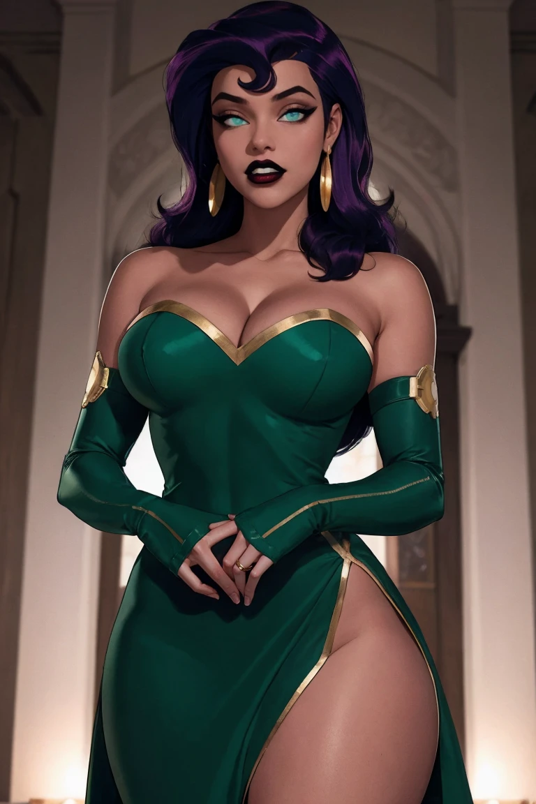 1girl, long hair, purple hair, earrings, jewelry, breasts, blue eyes, no pupils,  makeup, dark skin, dark-skinned female, lipstick, hoop earrings, large breasts,  black lips, eyeshadow,  glowing eyes,  thighs, thick thighs, collarbone, toned, wide hips,