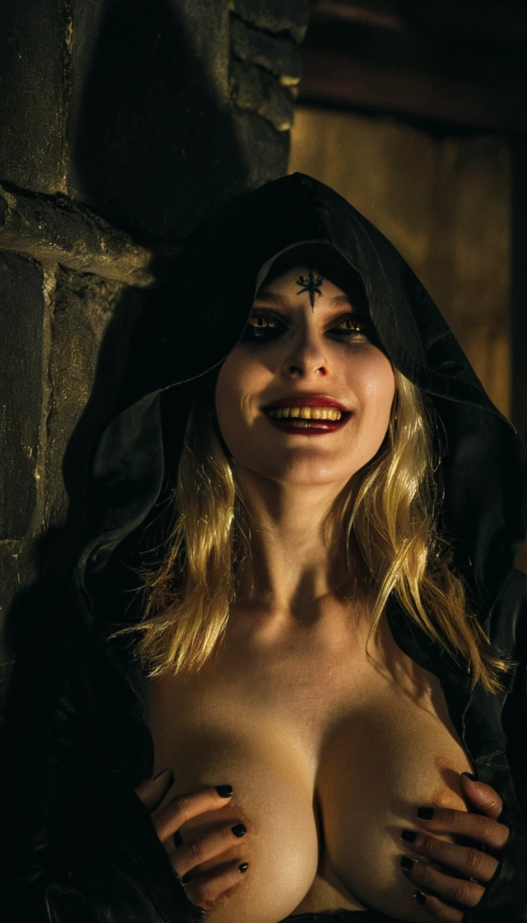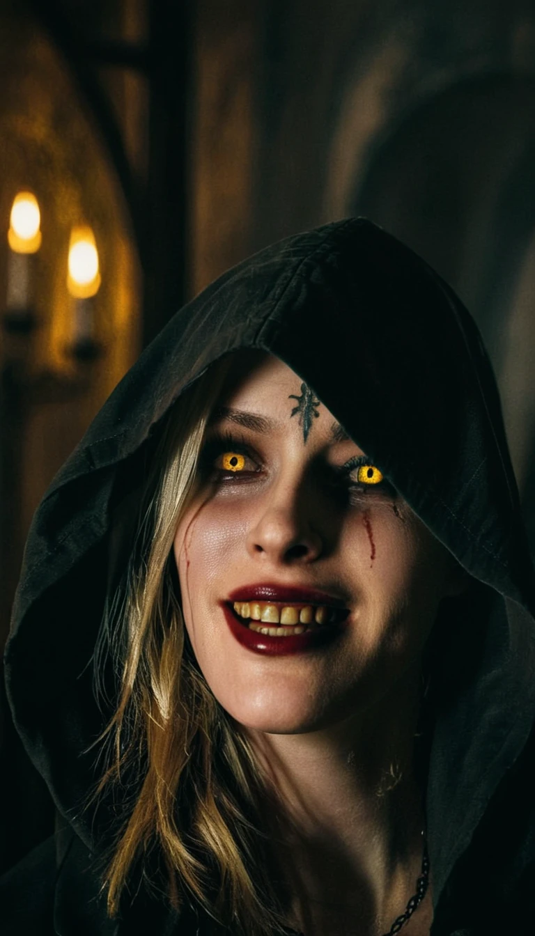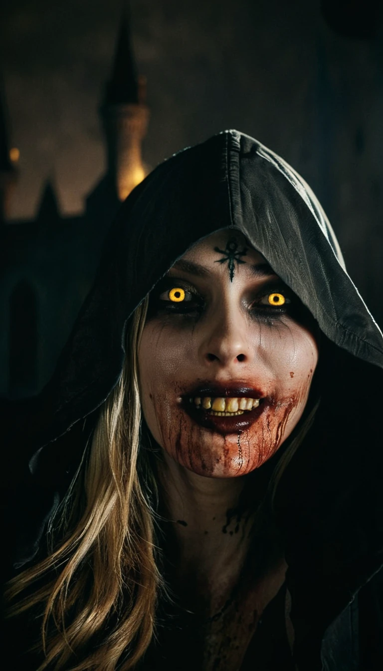 You might want to add blood, yellow eyes, hooded, Pale, Grey skin, to the prompt. Yellow eyes tends to make her teeth also yellow with some models to counter this you can add Yellow teeth to the negatives and White teeth to the positives