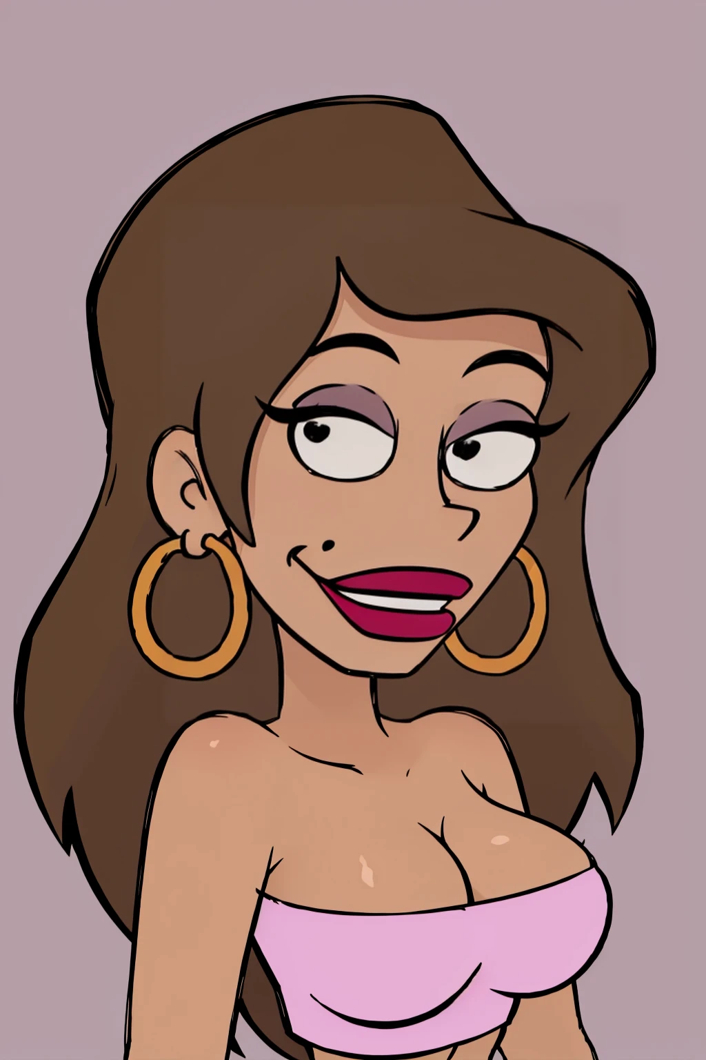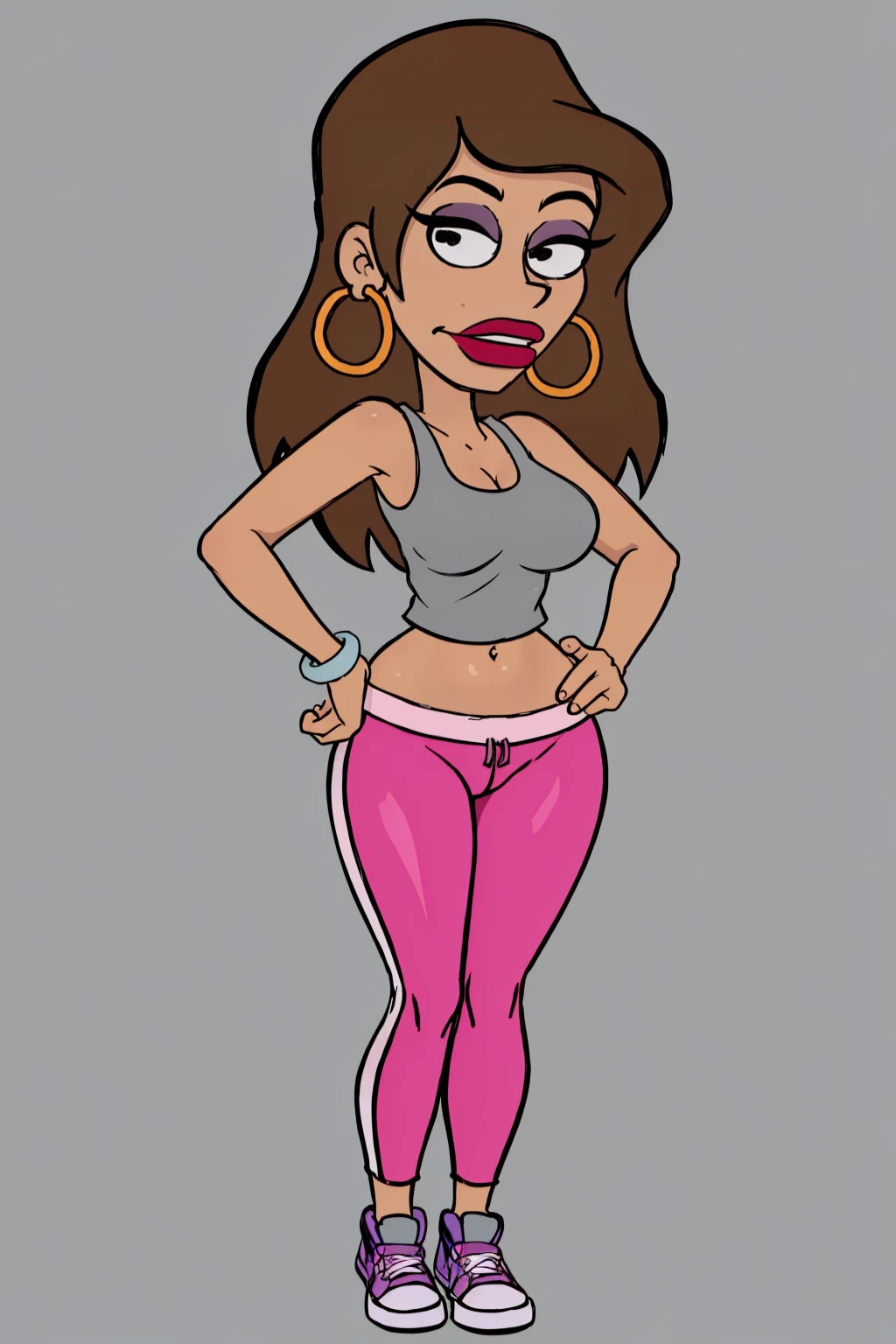 Default outfit prompts : pink crop top, bare shoulders, hoop earrings, lipstick, makeup, belt, jeans, high heels