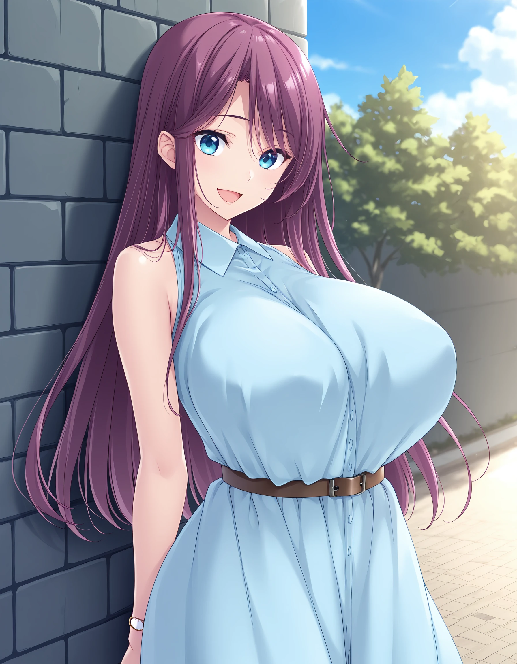 outfit02, dress, pale blue dress, collared dress, sleeveless dress, one-piece dress, belt, brown belt, sandals, white sandal, high heel sandal, wristwatch, bare shoulders,