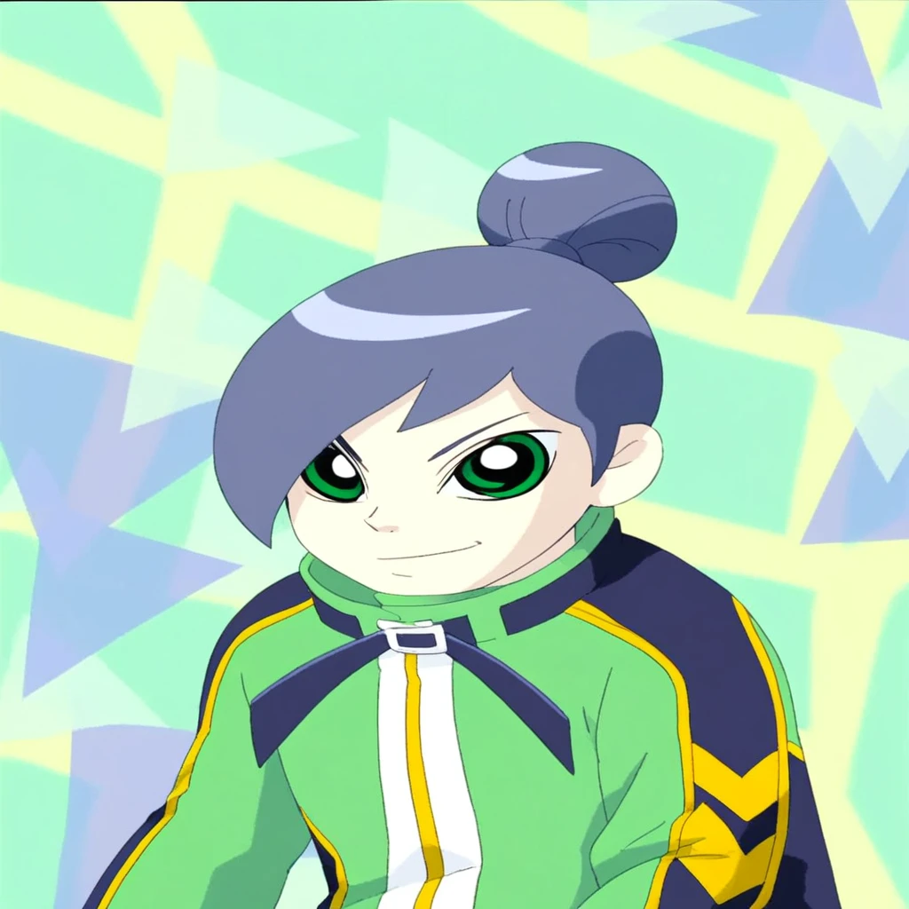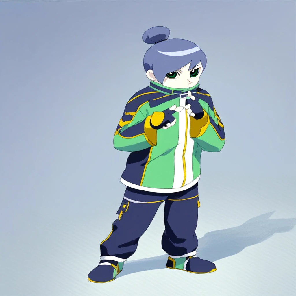 Bu1ch, 1boy, solo, male focus, green eyes, blue hair, hair bun,