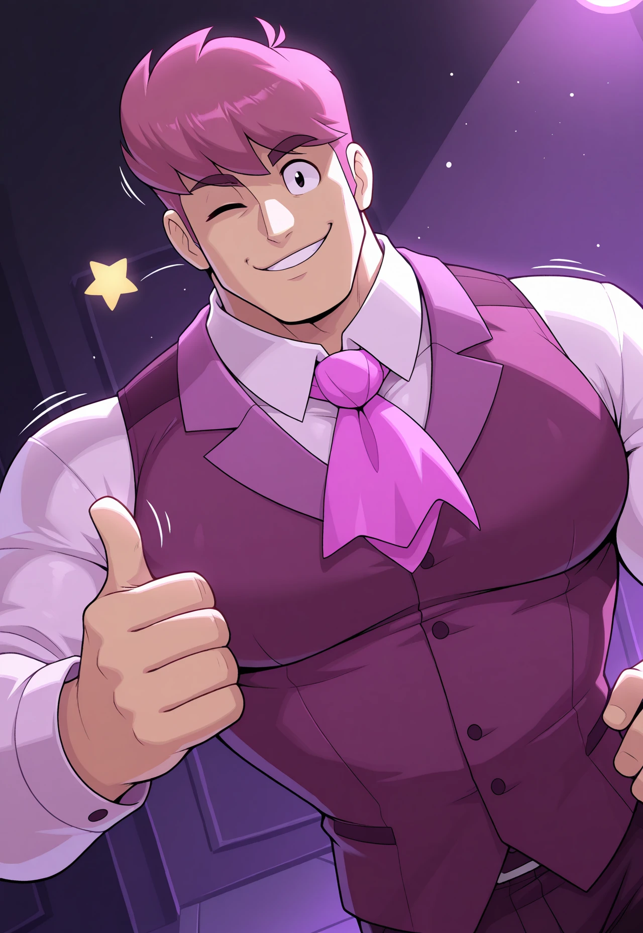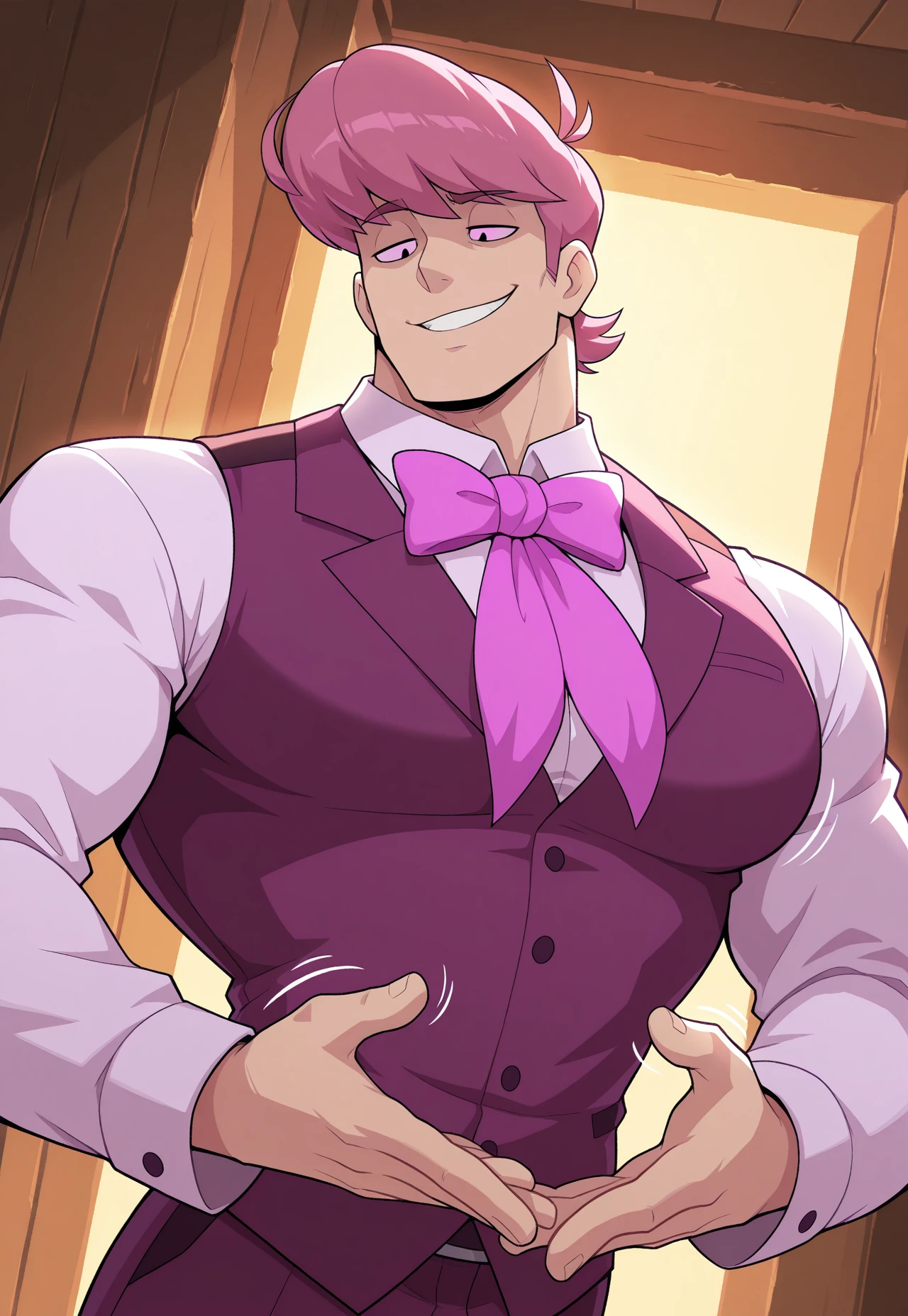 Lewis, wearing a purple suit jacket, a light purple vest, a light pink bow tie, white collared shirt, pink hair, light tan skin, pink hair, pink eye color, man,