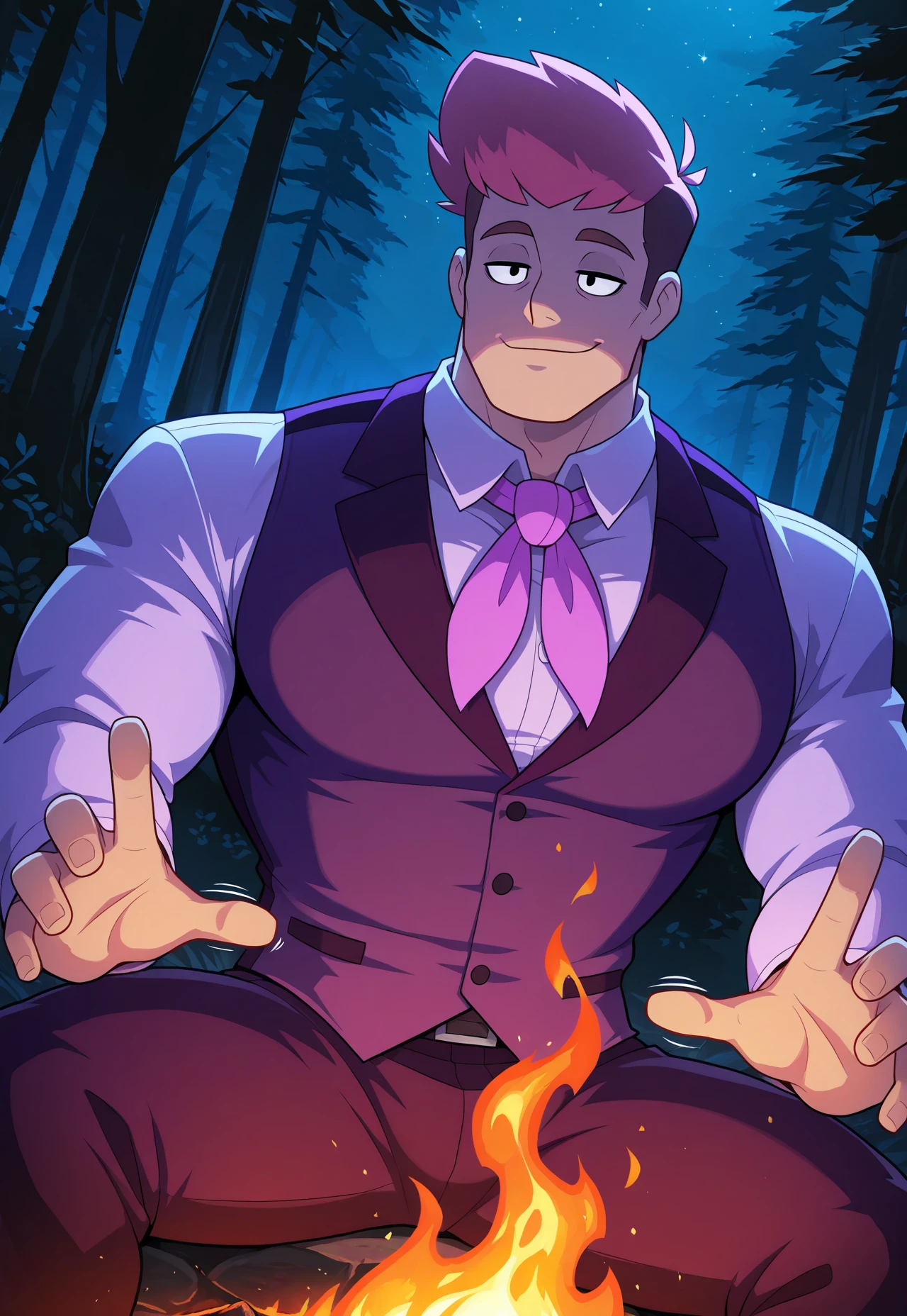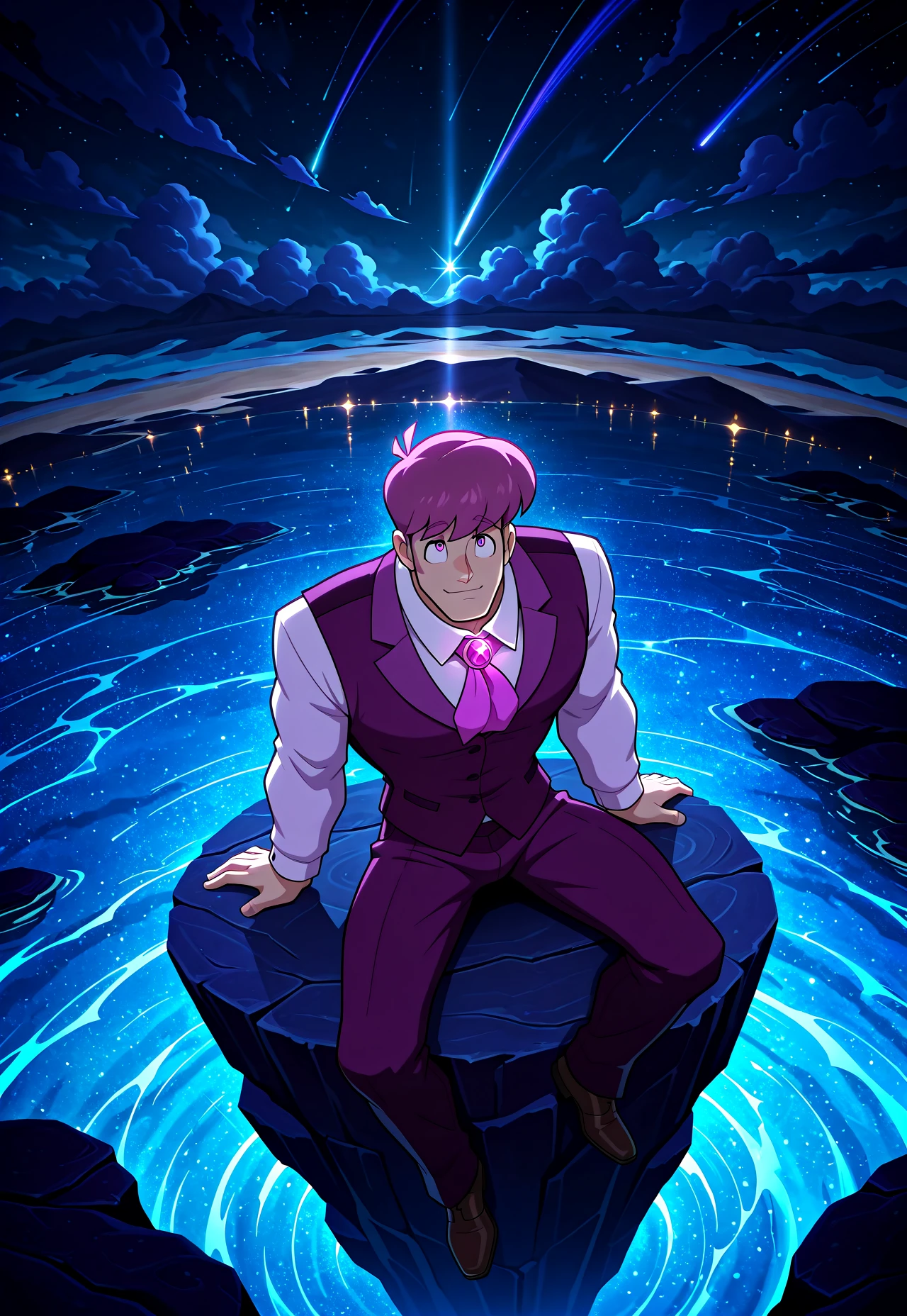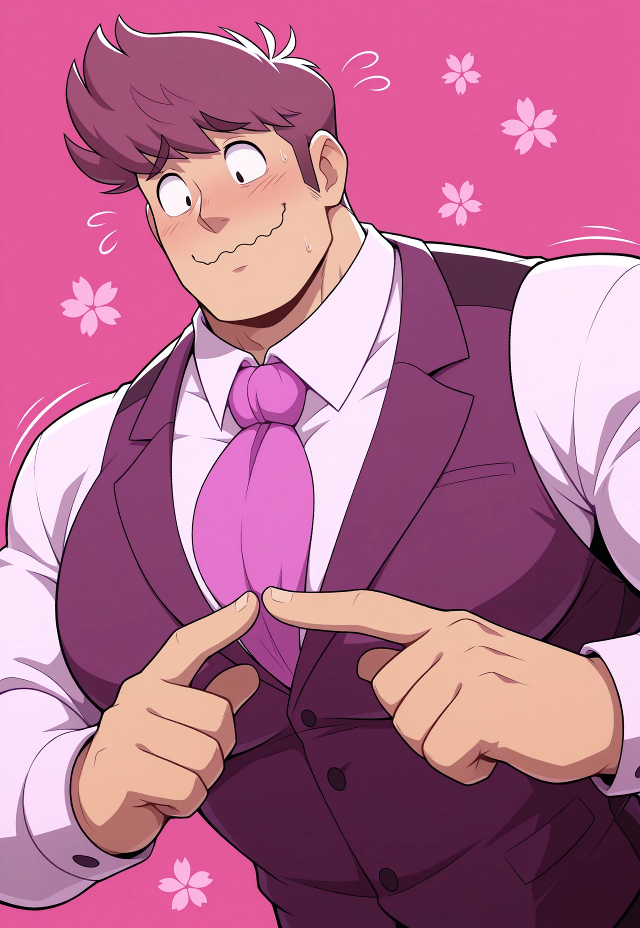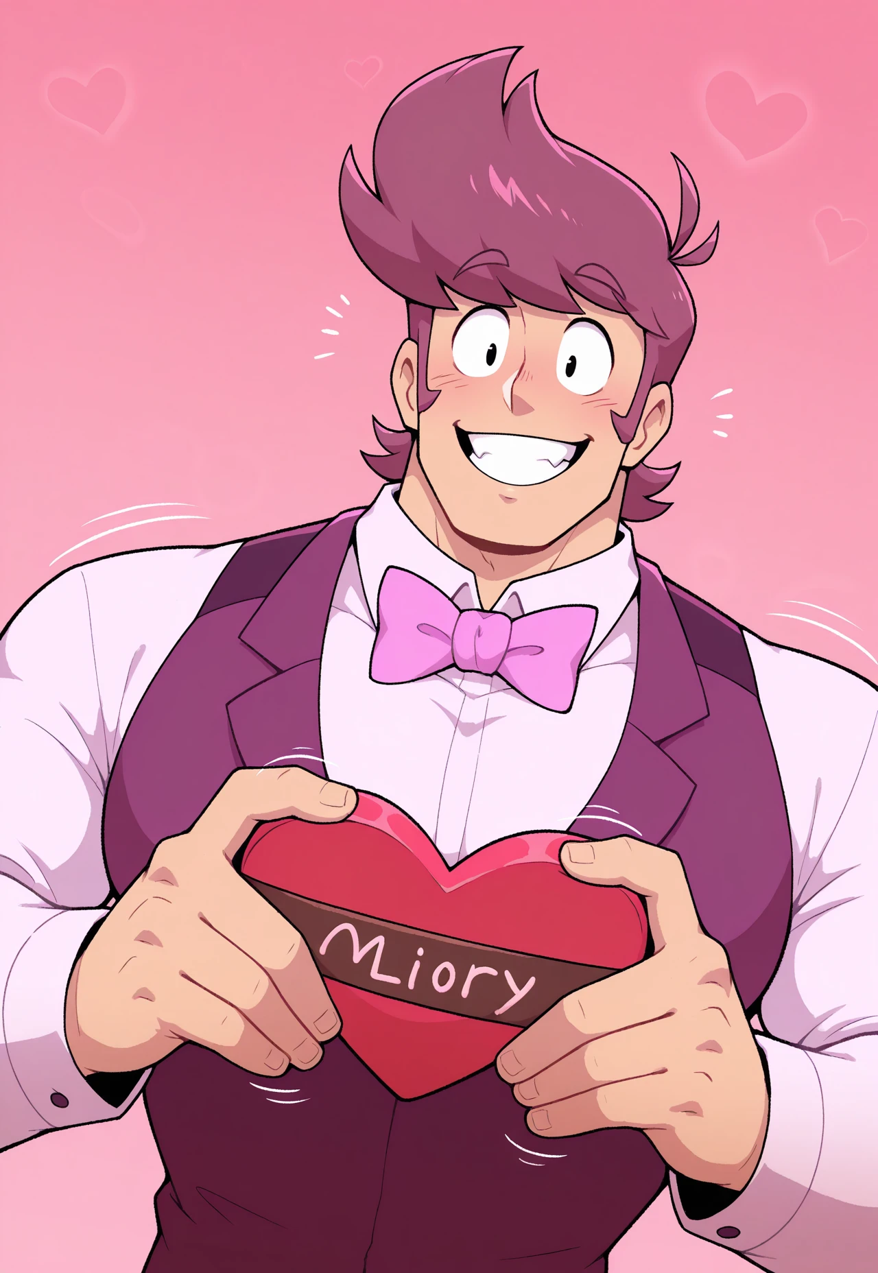 Lewis, wearing a purple suit jacket, a light purple vest, a light pink bow tie, white collared shirt, pink hair, light tan skin, pink hair, pink eye color, man, I don't know why, but if you remove his clothes from the prompts, then the face will be random. Probably because of the lack of material, but you can fix it like this: