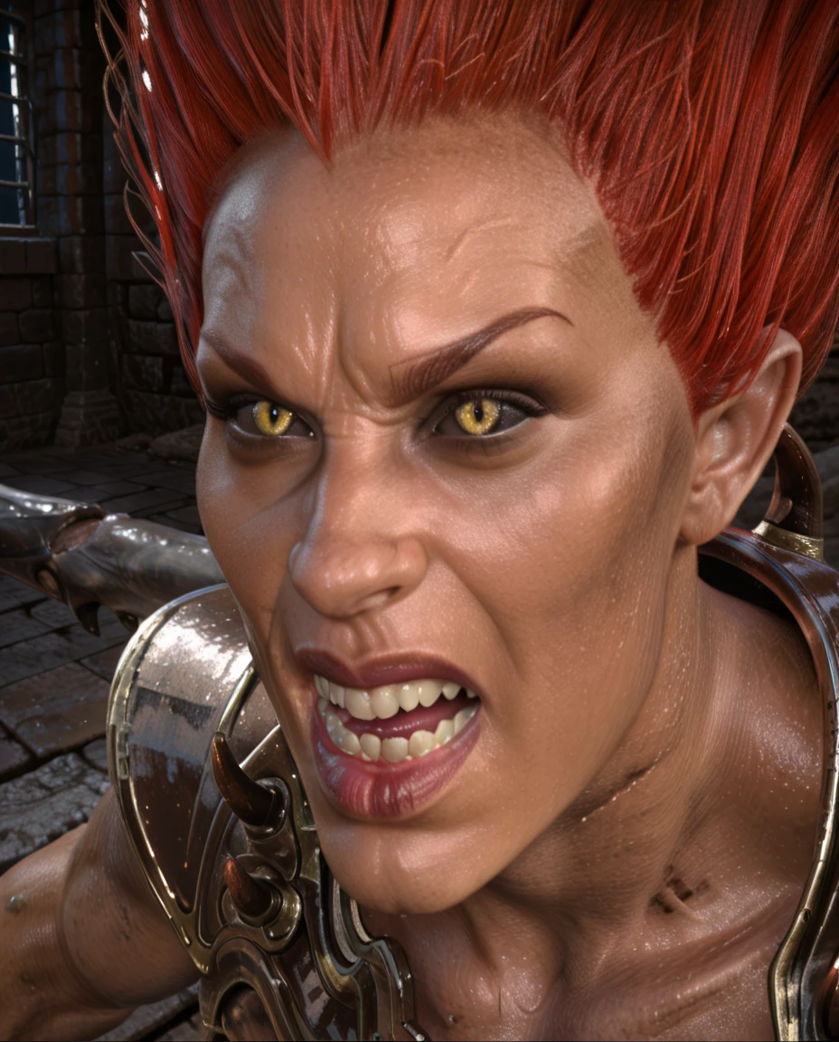 Andarielxl, black sclera, yellow eyes, slit pupils, red hair,
