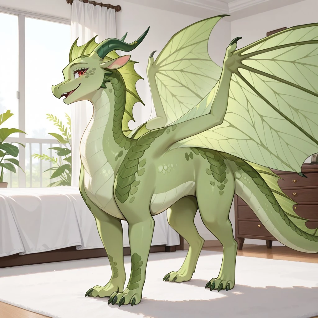 Additional prompts for Willow: willow_wof, light green scales, pale underbelly, two tone scales, pale green horns, pale green wings, brown eyes, 1girl
