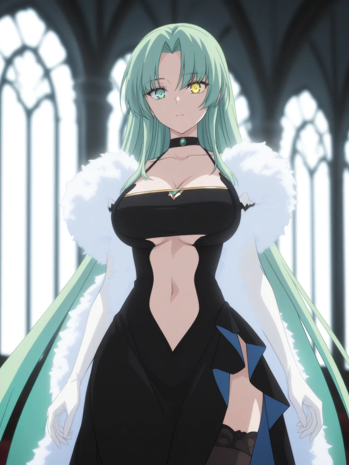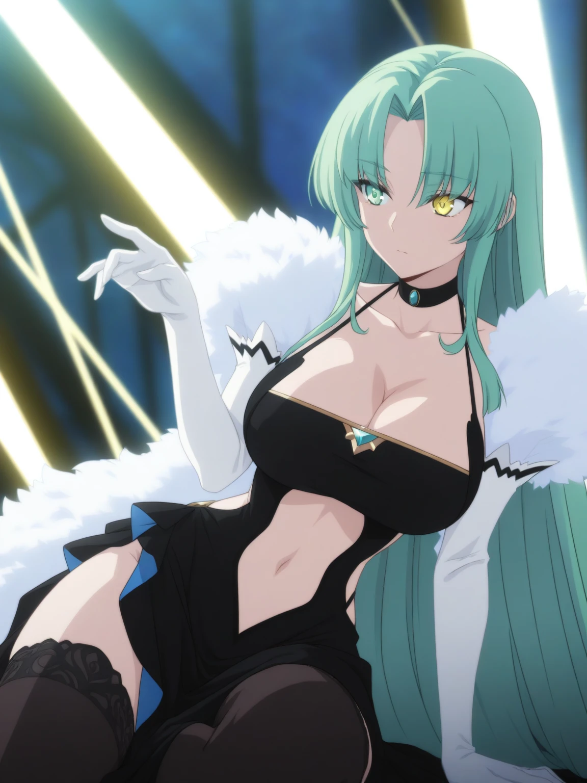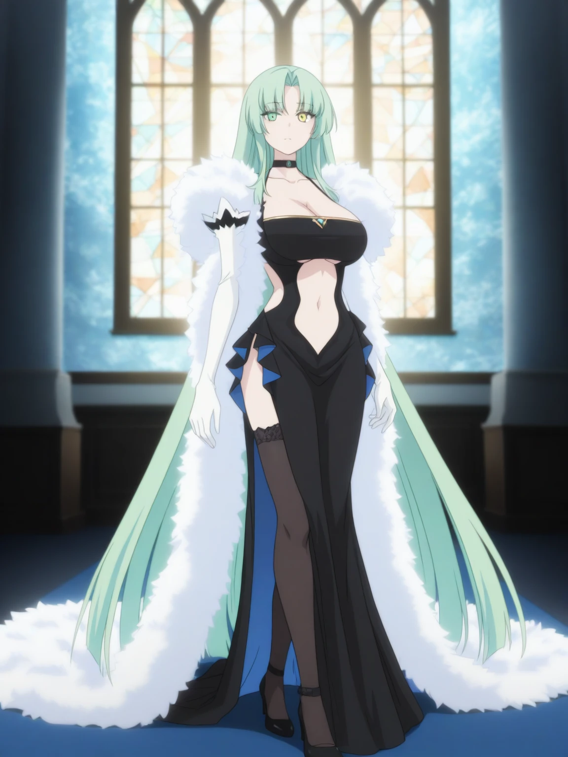 Clothes: black choker, slit dress, long dress, cleavage, navel cutout, white gloves, black thighhighs, high heels