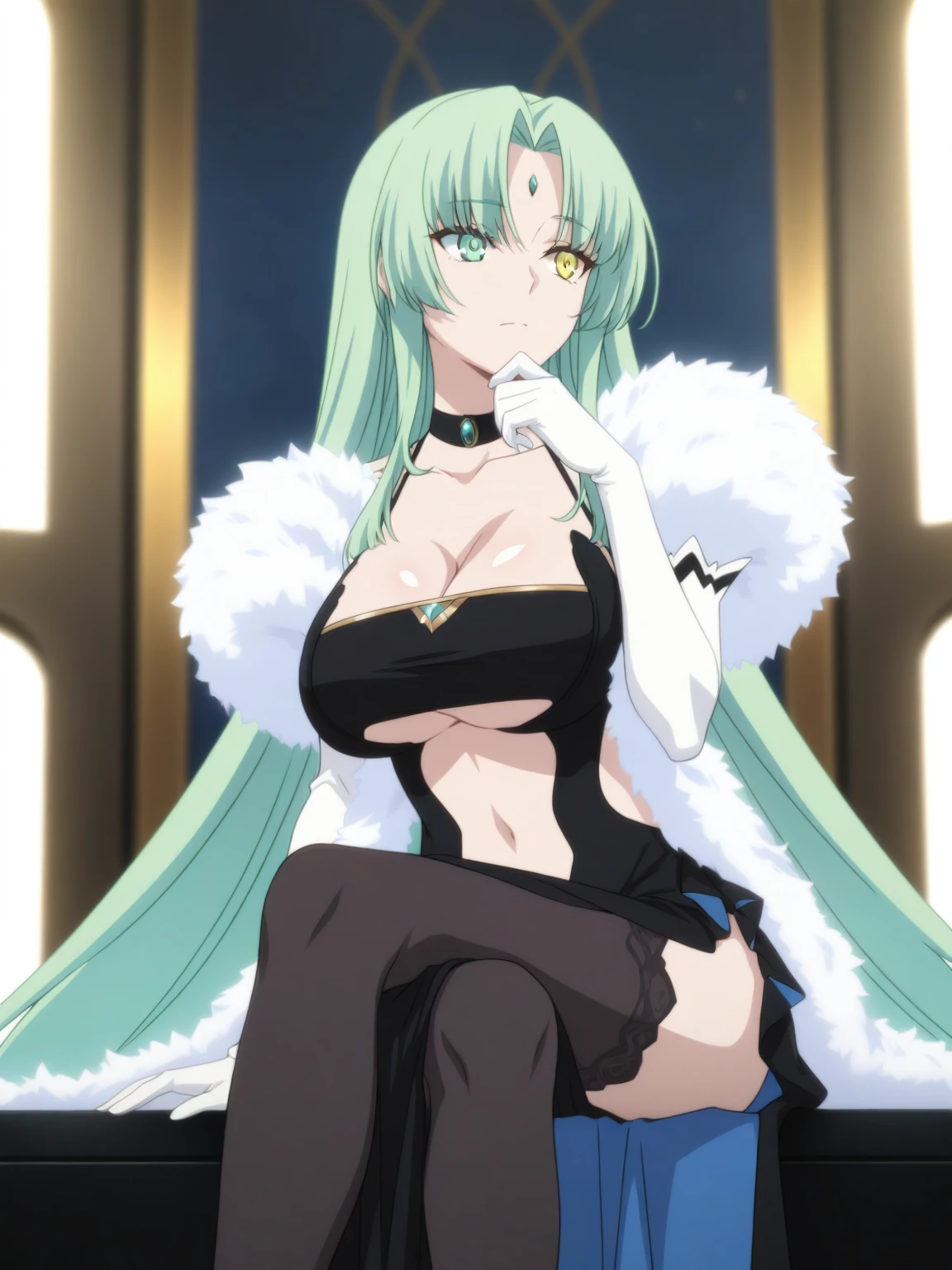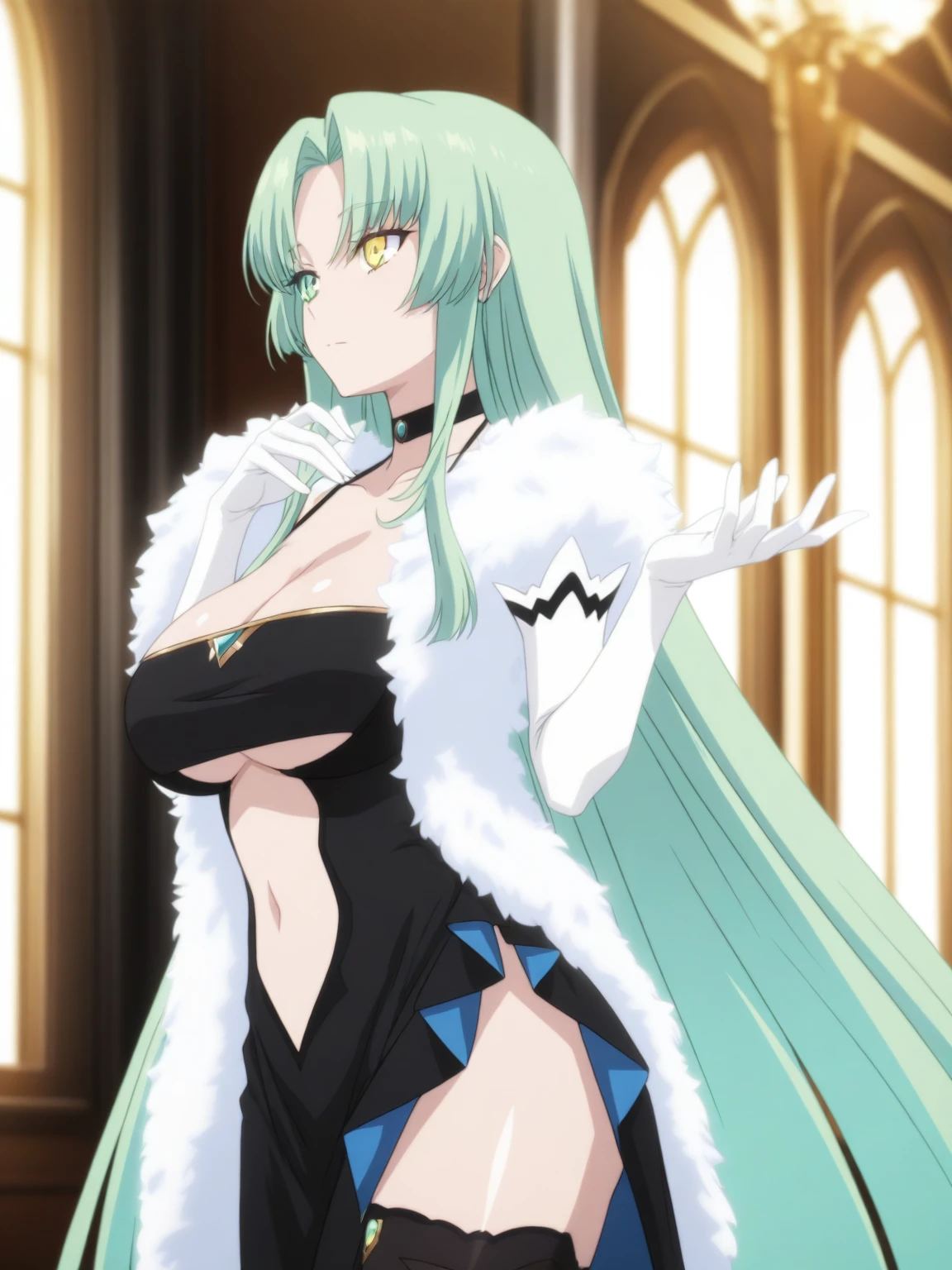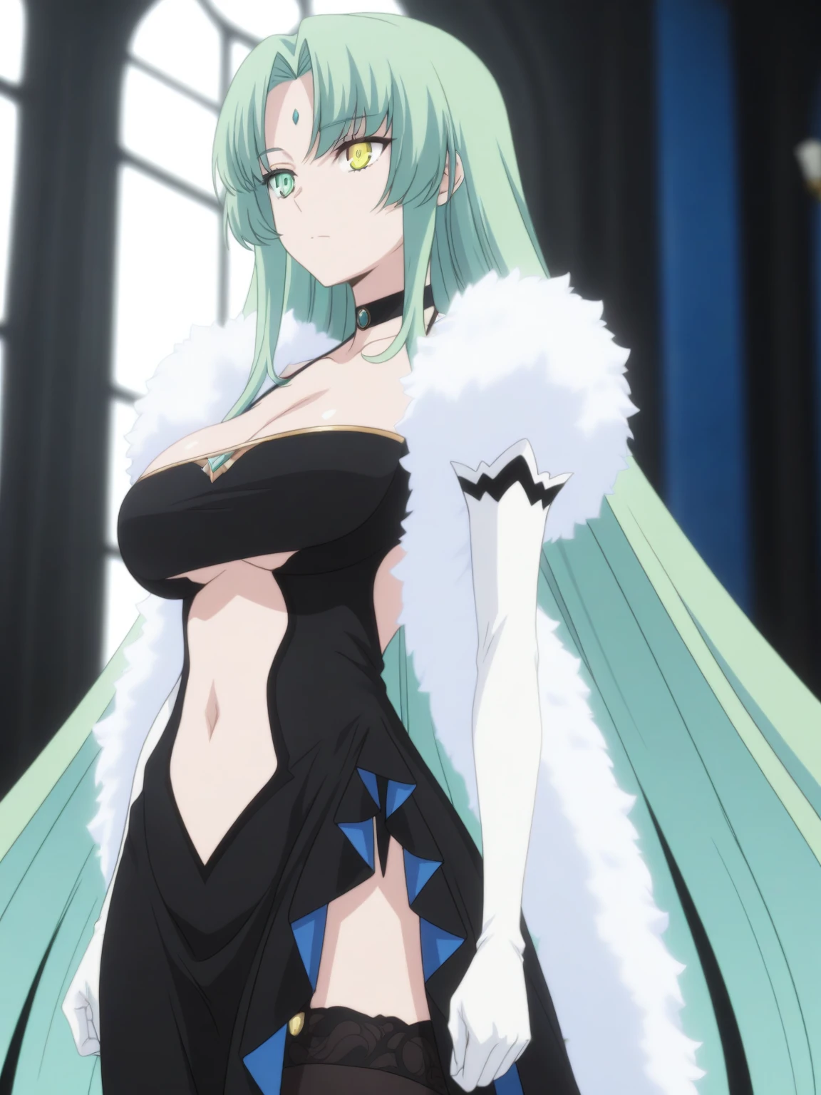 Clothes: black choker, slit dress, long dress, cleavage, navel cutout, white gloves, black thighhighs, high heels