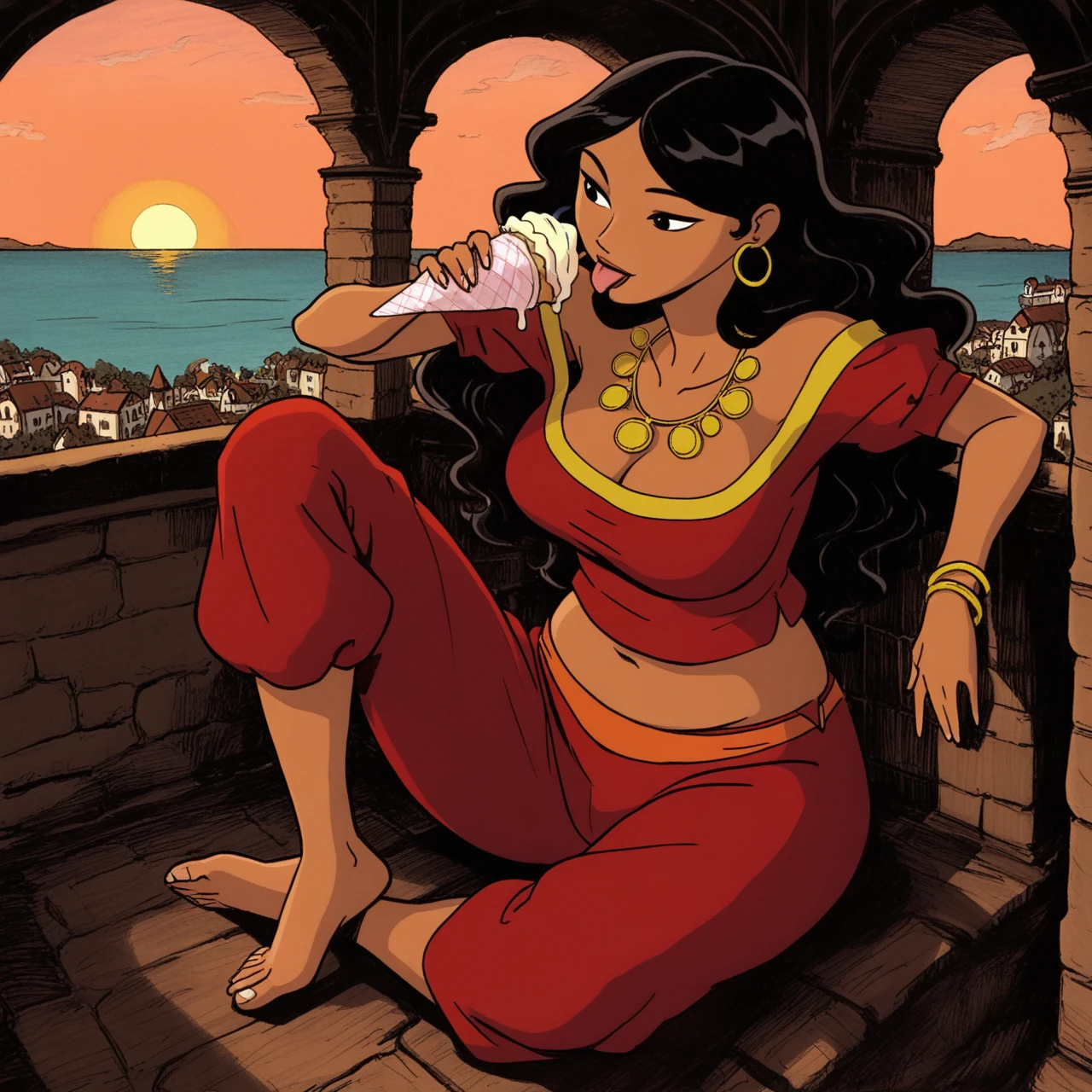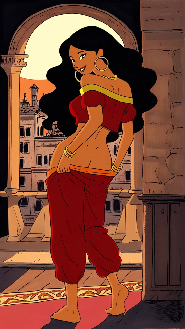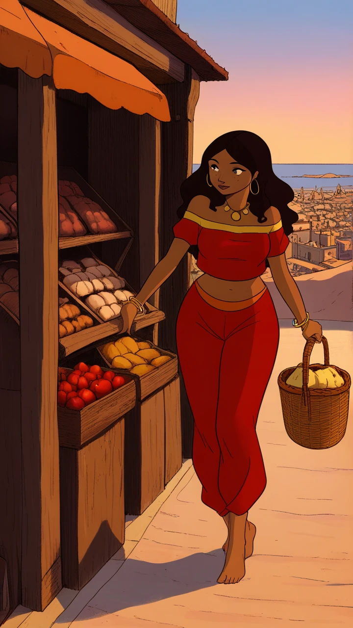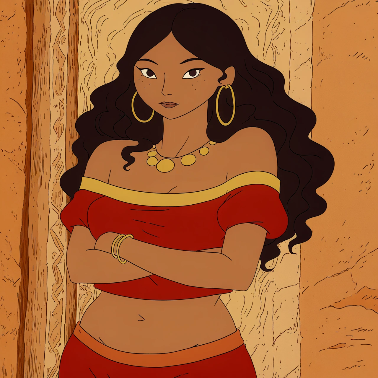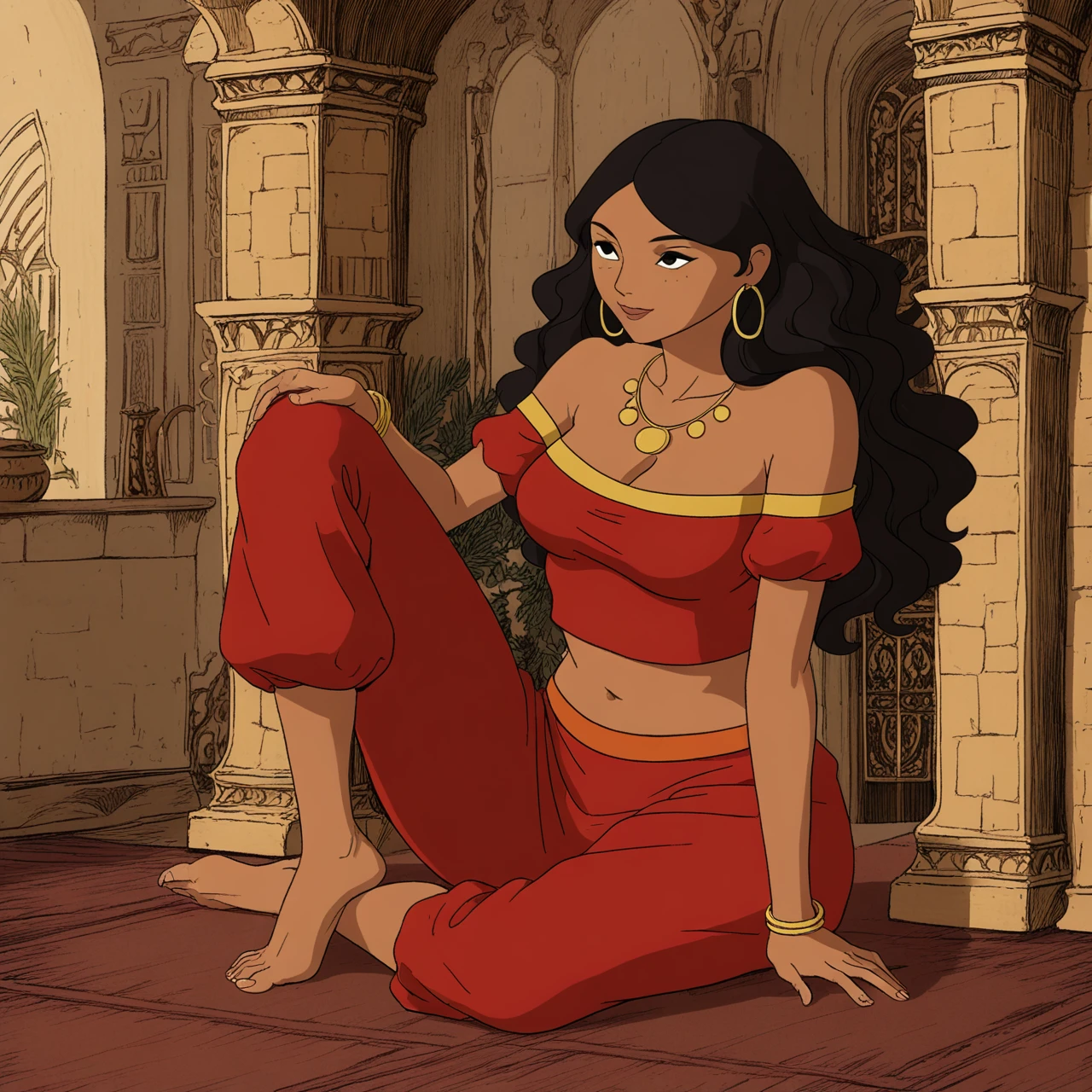Outfit: strapless red top with gold lining, puffy red pants with orange belt, bare feet, full body, golden hoop earrings, gold coin necklace, bare feet, golden wristlet,