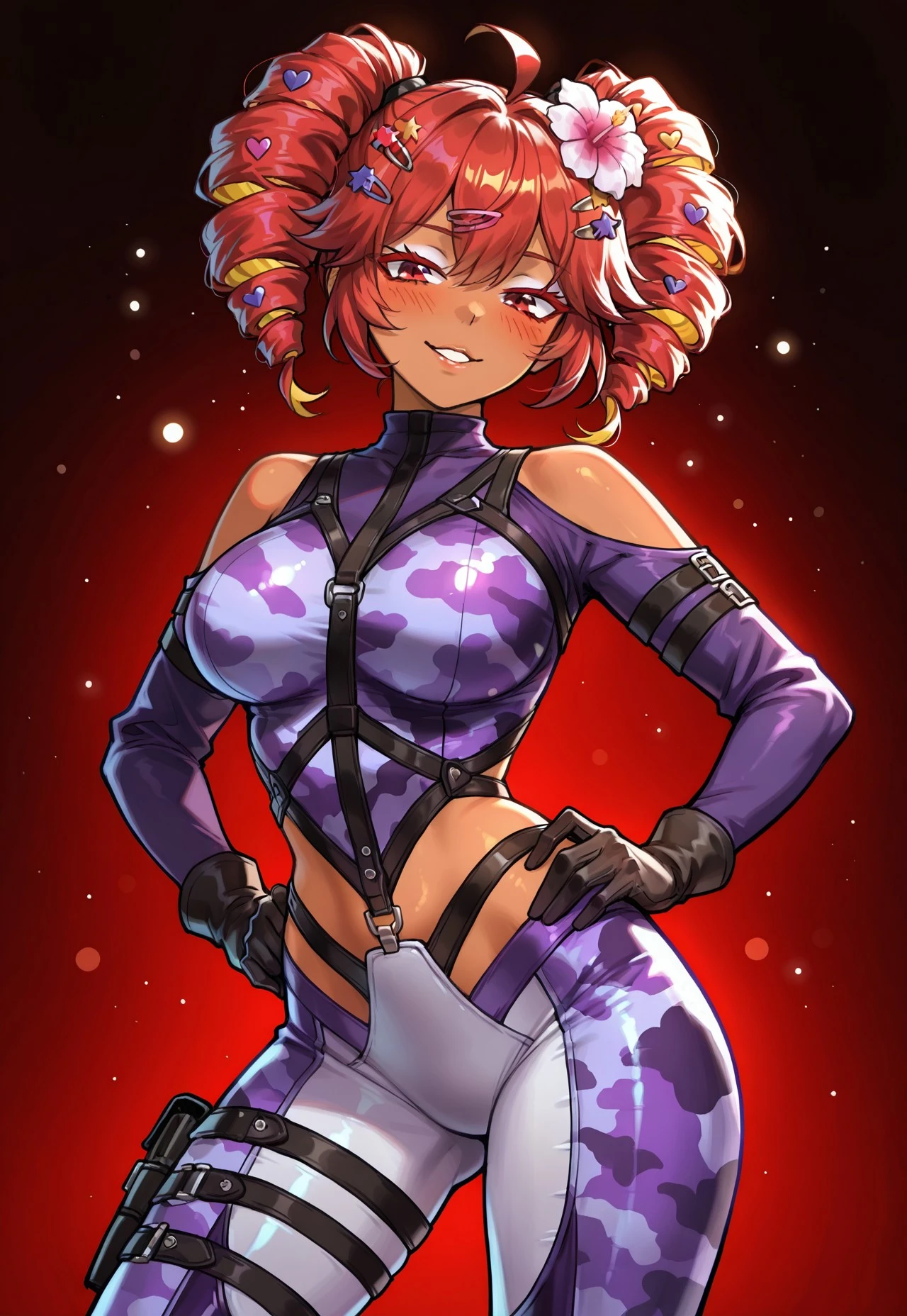 nwcs,purple bodysuit,camouflage,shoulder cutout,bare shoulders,long sleeves,chest harness,hip vent,black gloves,purple tight pants,thigh holster,knee pads,purple boots,Recommended settings: