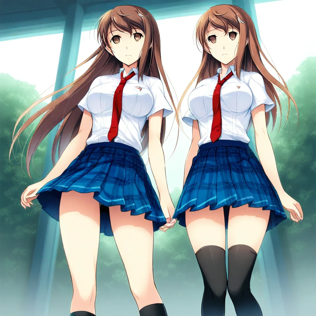 amane-uniform, white shirt, short sleeves, red necktie, blue skirt, plaid skirt, pleated skirt, black kneesocks,