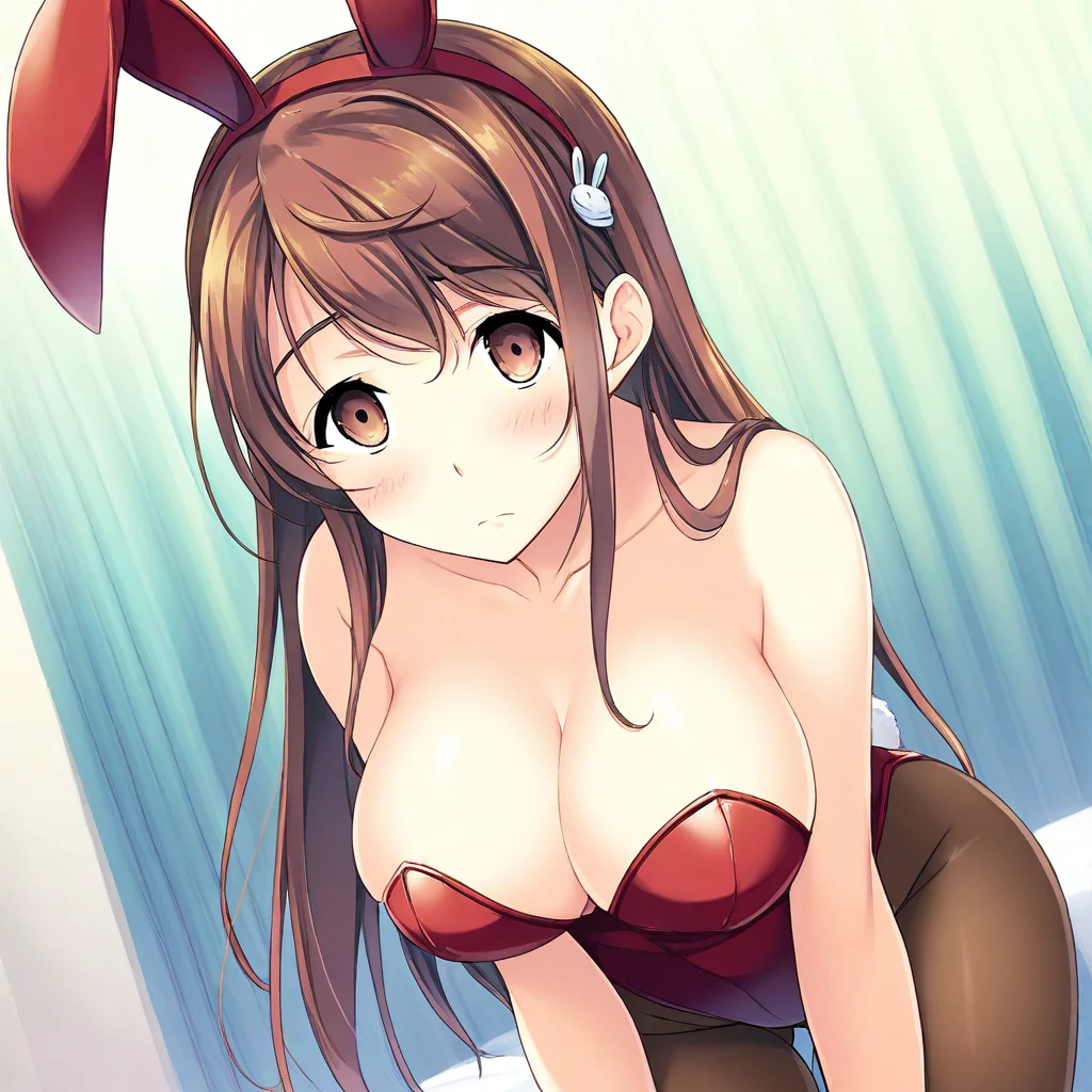 brown hair, long hair, bangs, hair clip, brown eyes, large breasts,