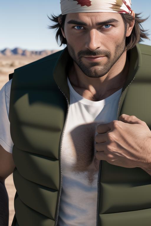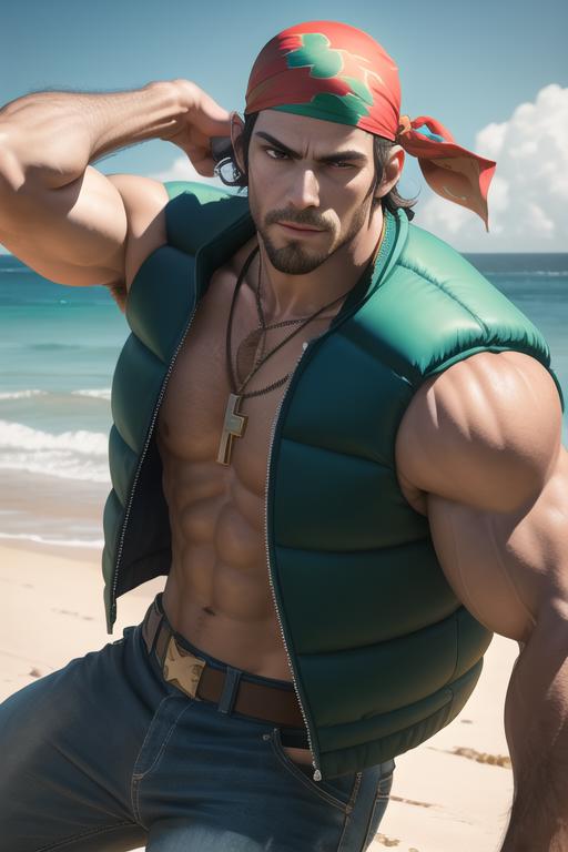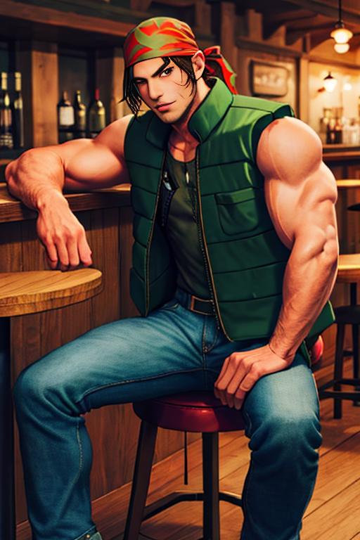 You can try things like (red bandana), (necklace), (green /black vest), (denim/green pants), (medium hair), (sleeveless shirt), (red bracelets), (black belt), (white socks) and (necklace) to edit, include, remove clothes.