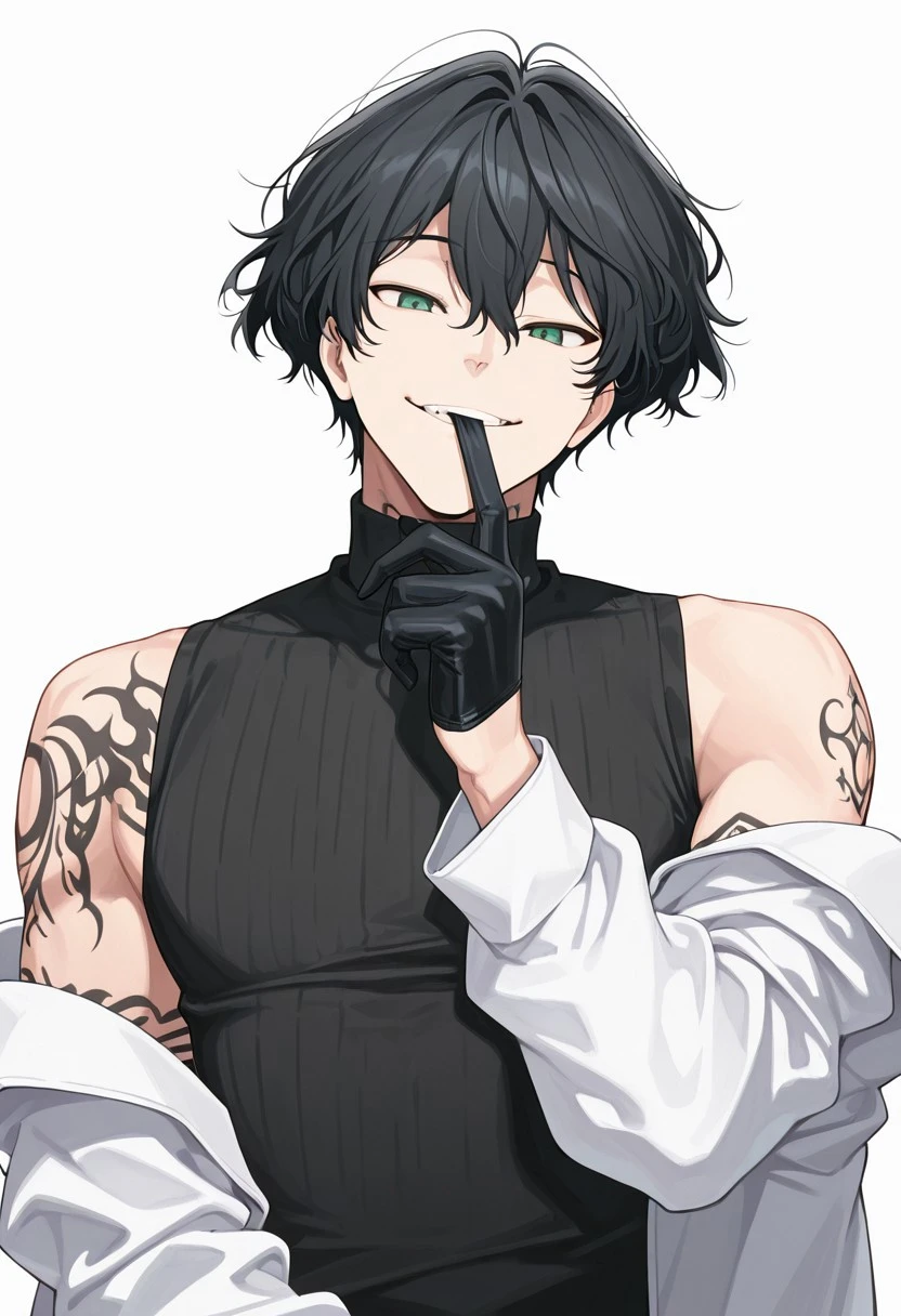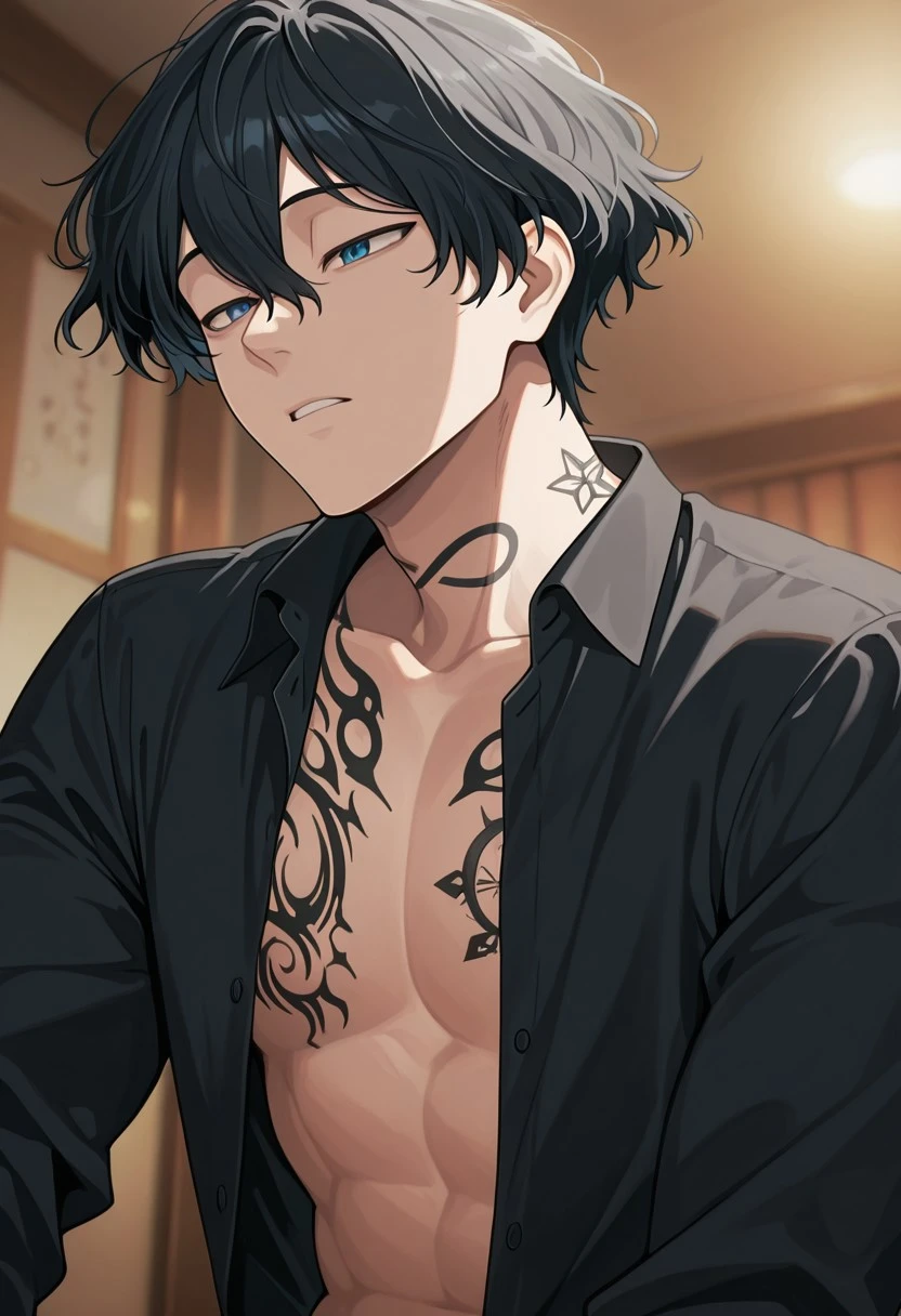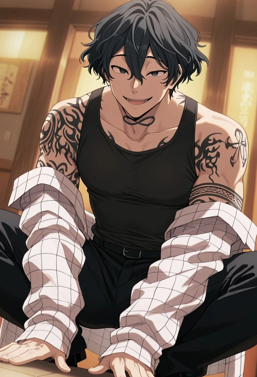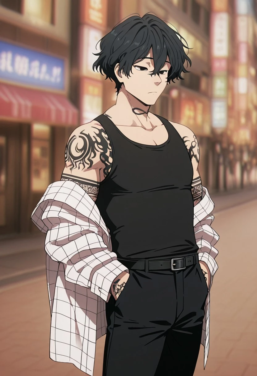 1boy, male focus, solo, blue eyes, black hair, hair between eyes, black tank top, white shirt, plaid shirt, open shirt, off shoulder, belt, black pants, sneakers,