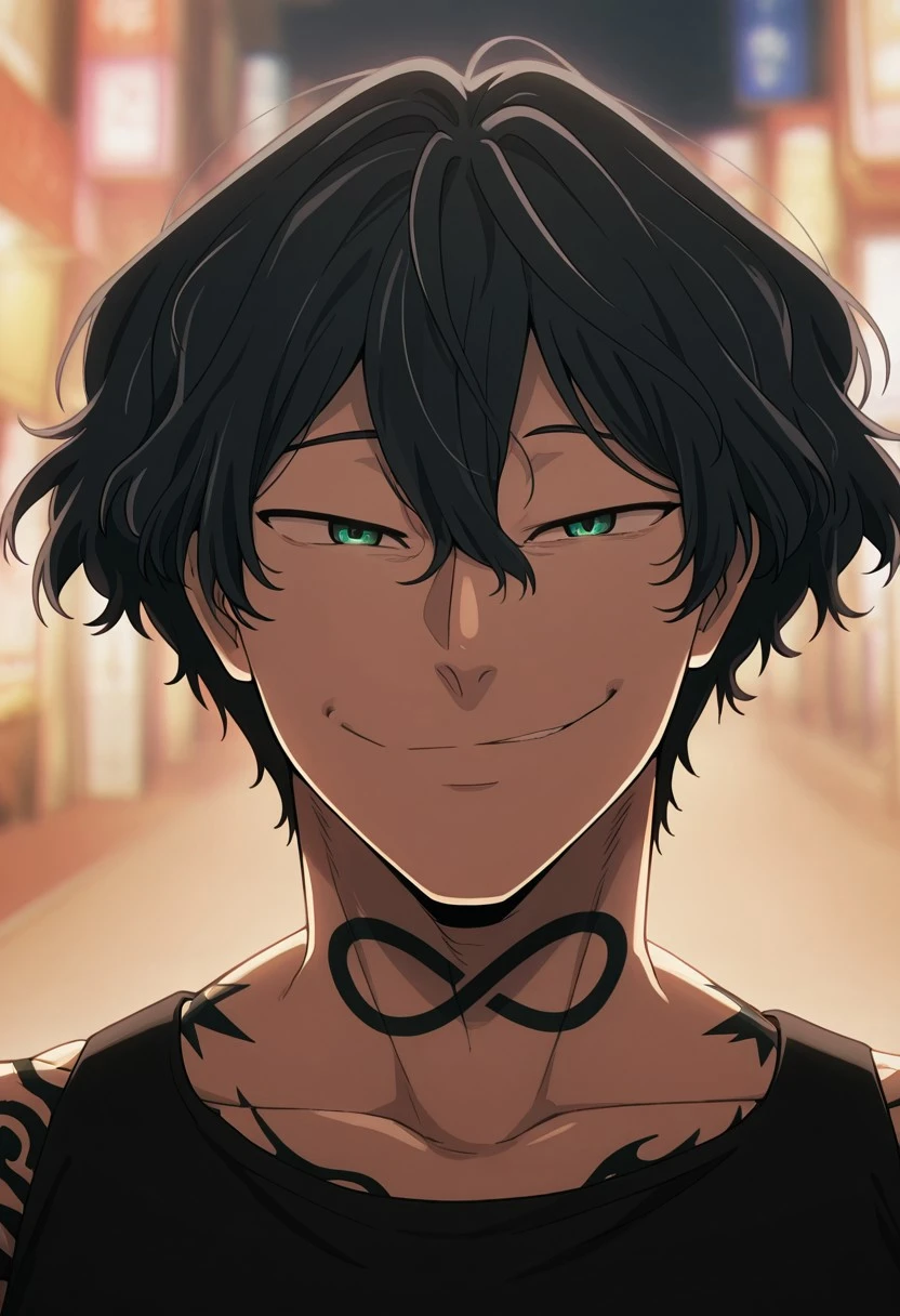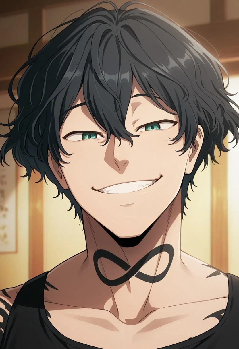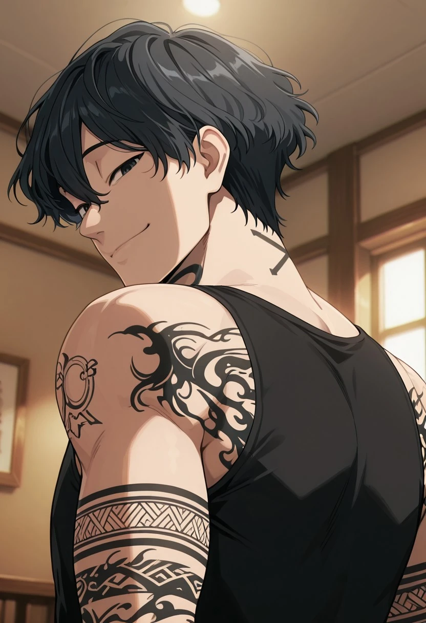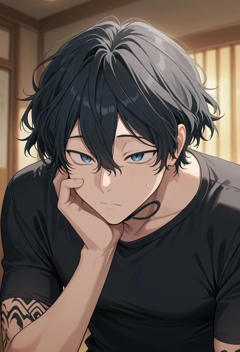 1boy, male focus, solo, blue eyes, black hair, hair between eyes, black tank top, white shirt, plaid shirt, open shirt, off shoulder, belt, black pants, sneakers,