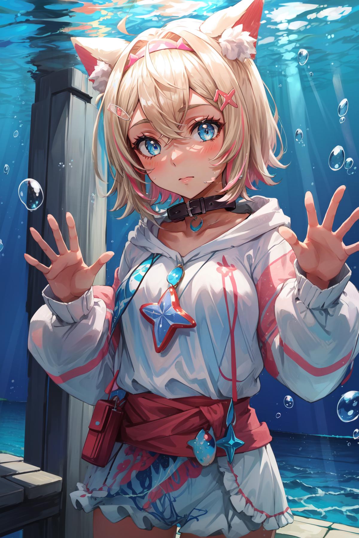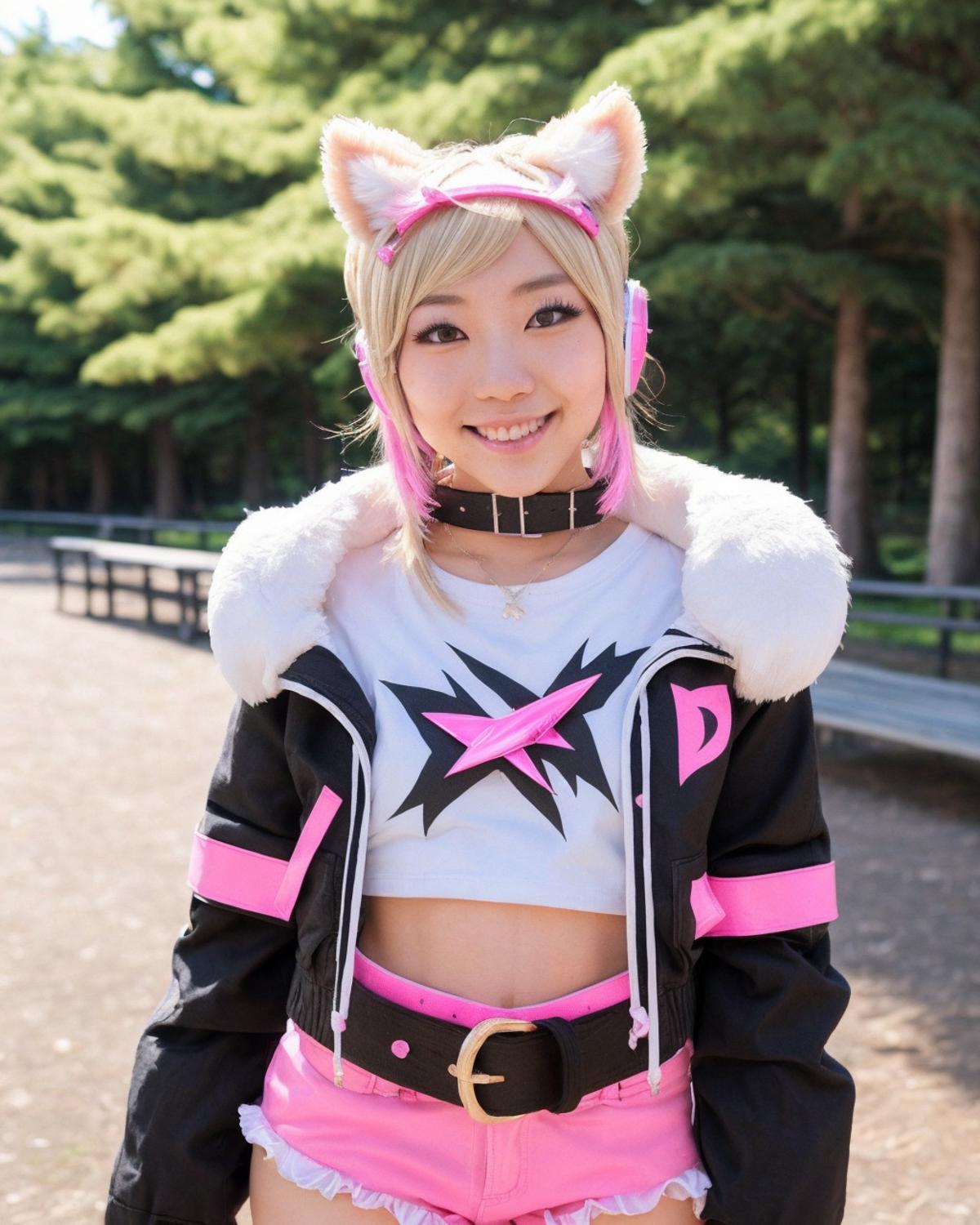 "MococoAbyssgard, hairclip, hairband, collar, black jacket, fur-trim, hoodie, crop top, headphones around neck, pink belt, white shorts, midriff"
