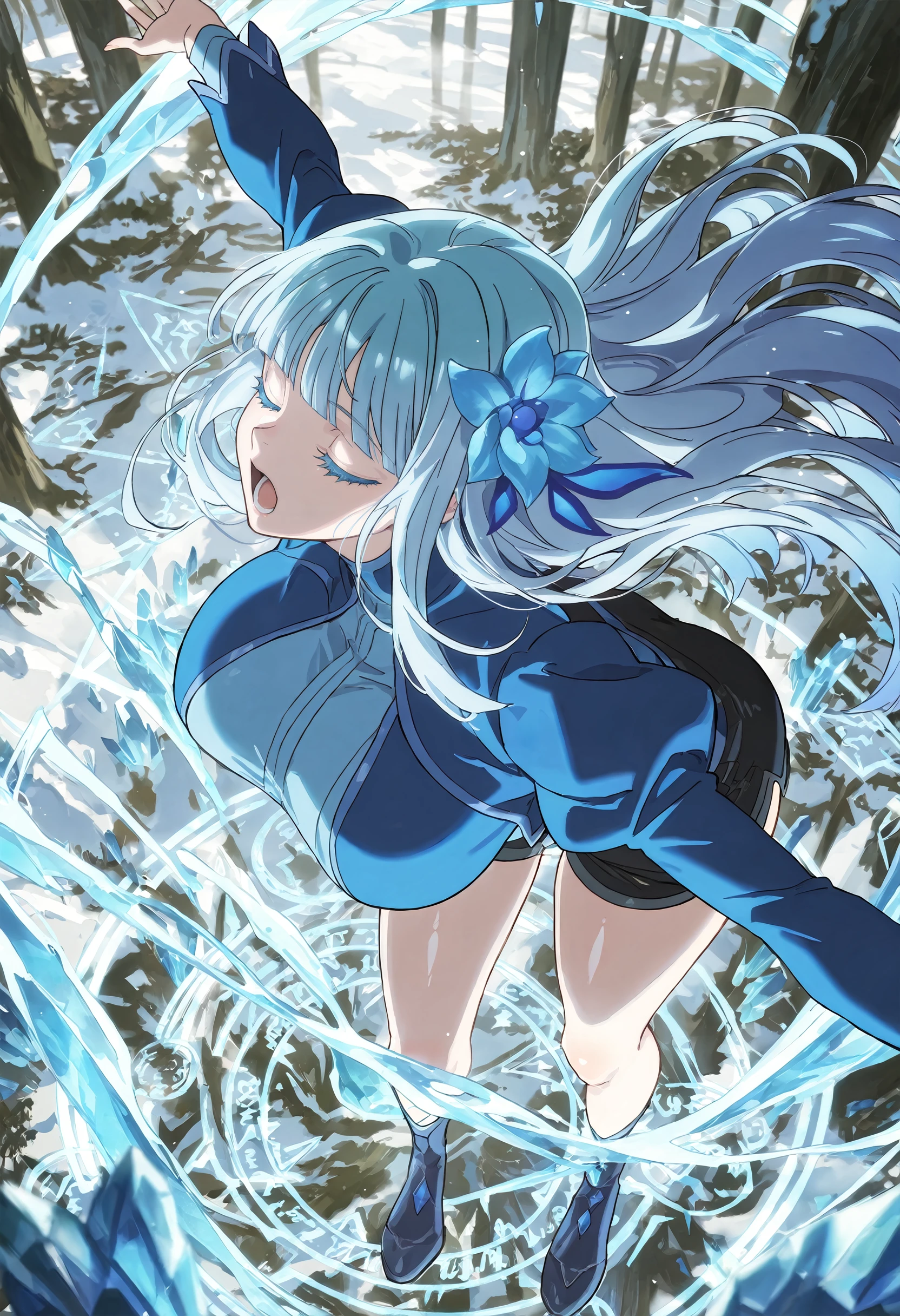 long hair, hair ornament, blue hair, blue eyes, blunt bangs, hair flower, blue flower, colored eyelashes