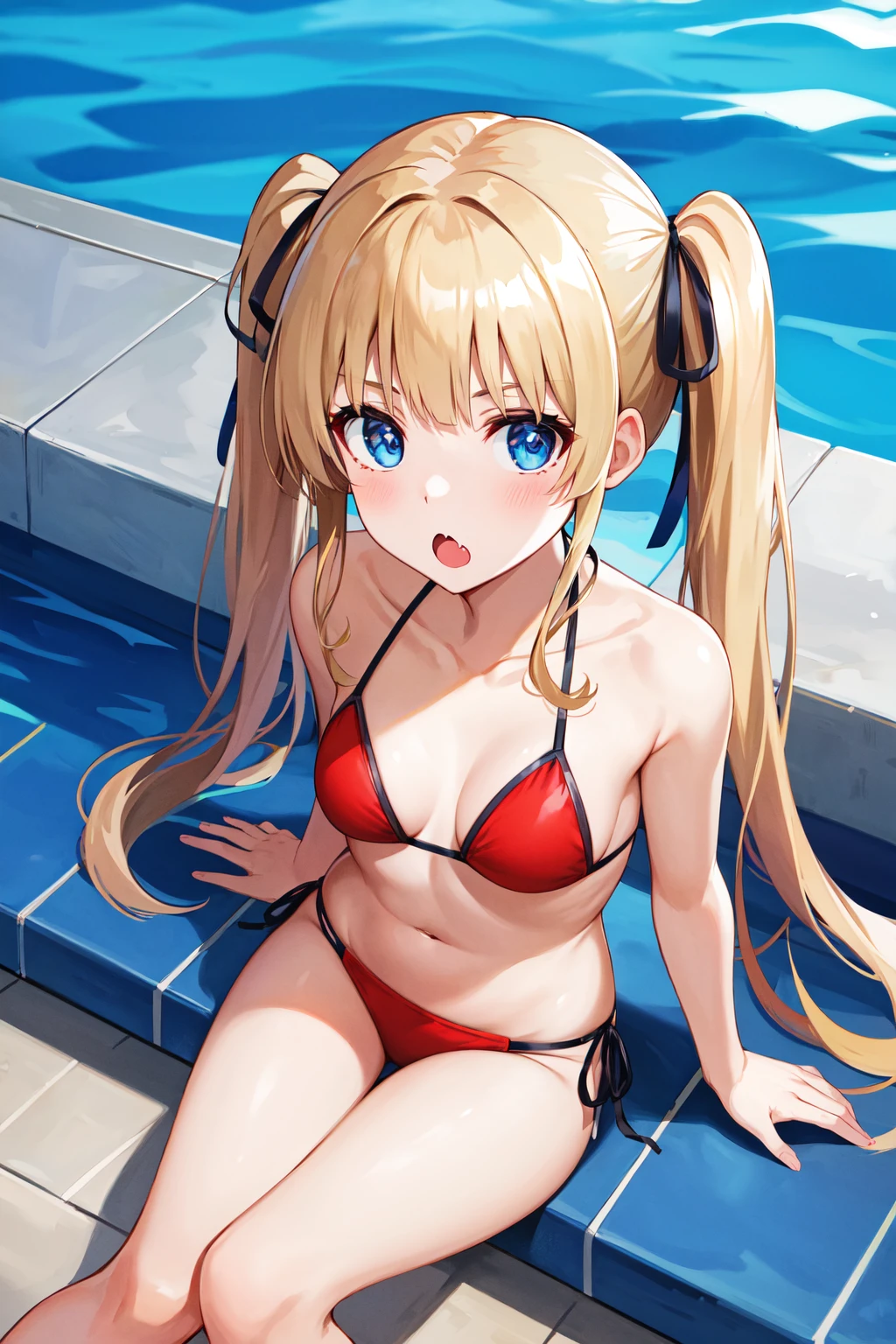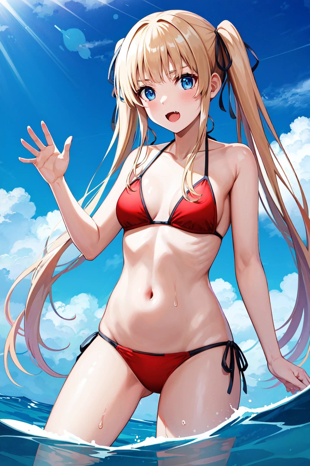 aaeriri, long hair, twintails, hair ribbon, fang, red bikini, string bikini