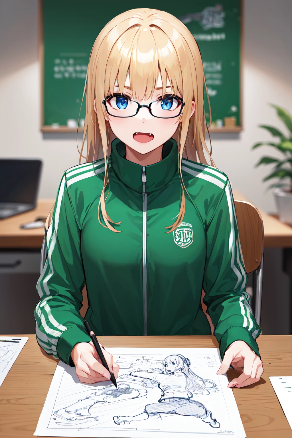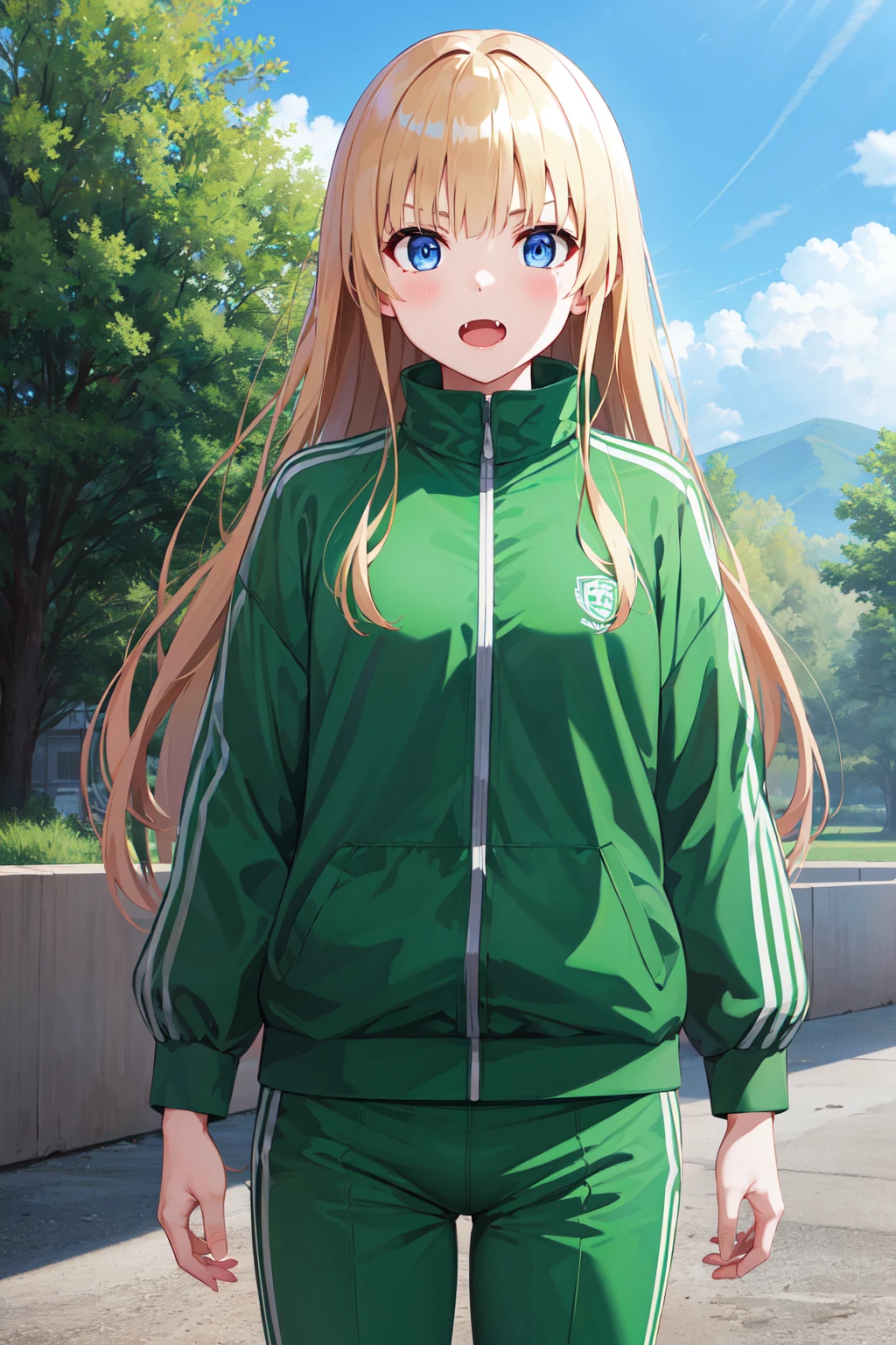 outfit2aaeriri, long hair, fang, track jacket, green jacket, long sleeves, track pants, green pants