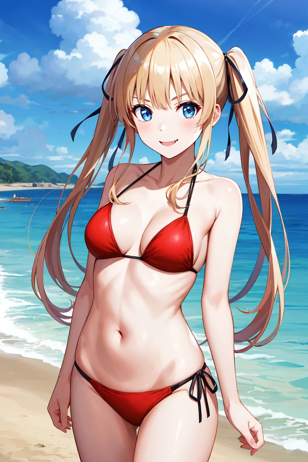 outfit3aaeriri, long hair, twintails, hair ribbon, fang, red bikini, string bikini