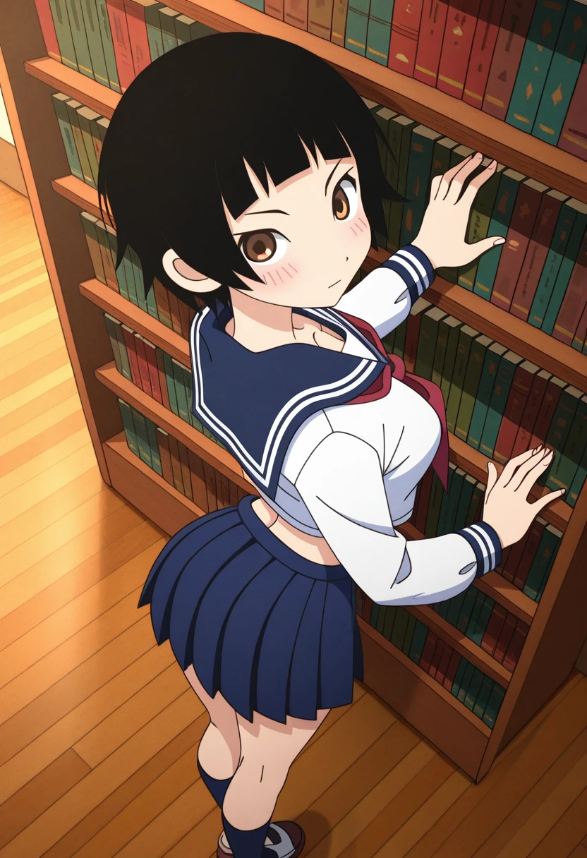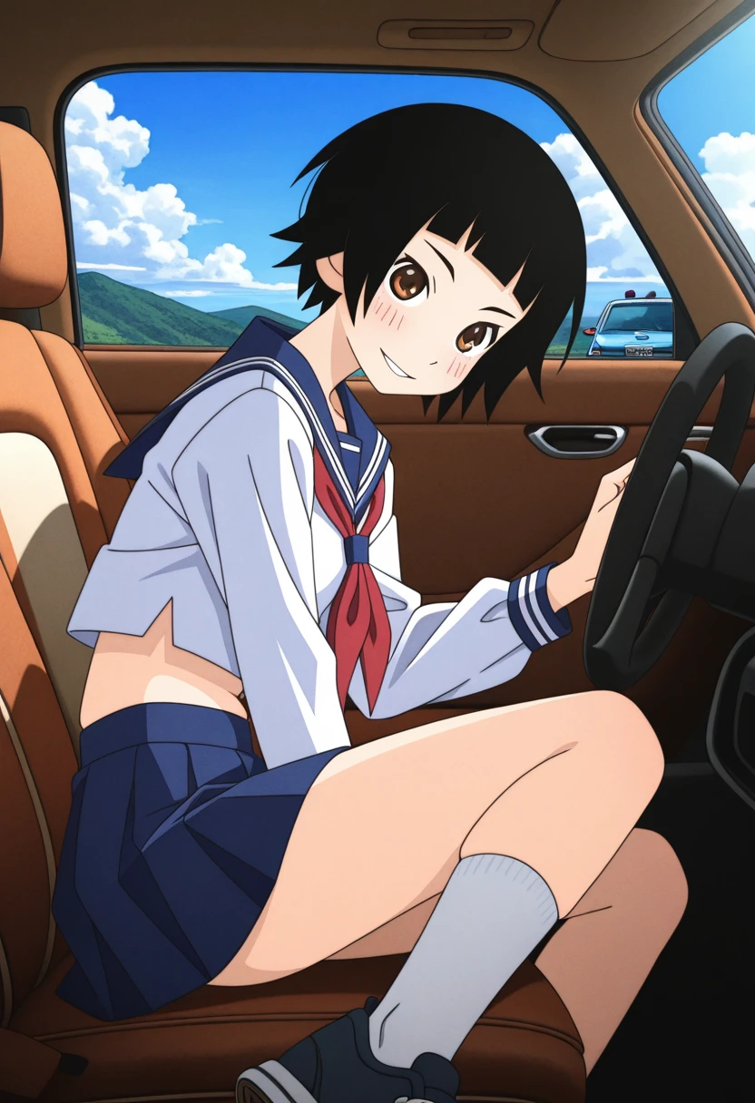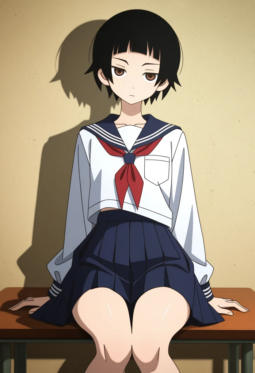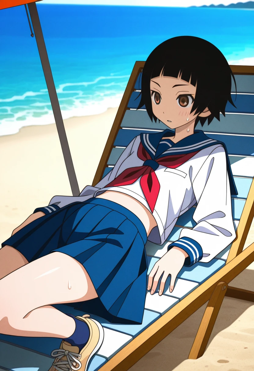 school uniform, serafuku, blue sailor collar, red neckerchief, long sleeves, midriff, blue pleated skirt, socks, loafers,
