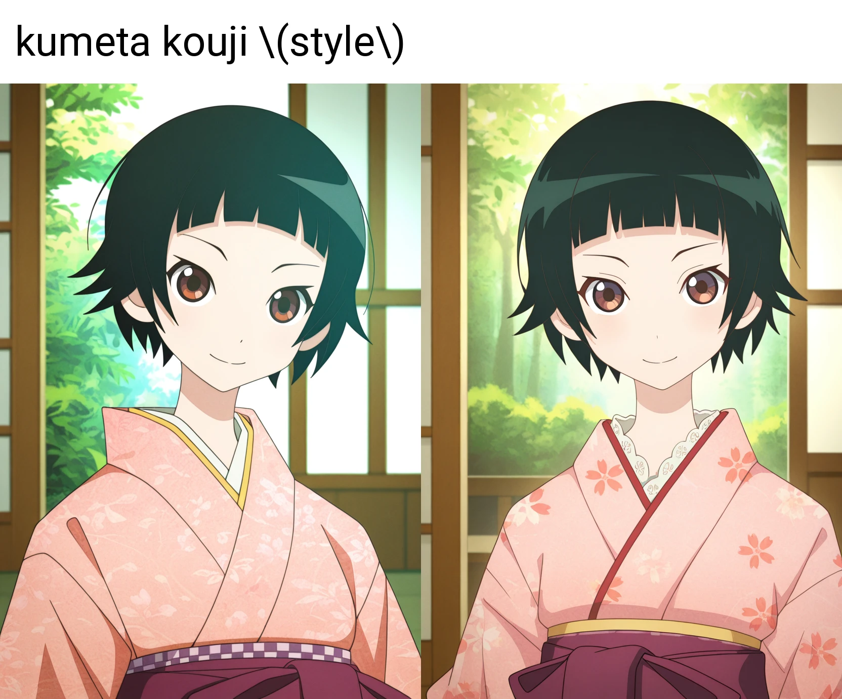 プロンプトに"kumeta kouji \(style\)"を追加する方が、再現度が高くなるようです。