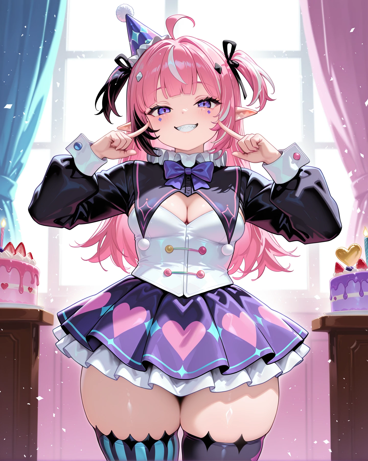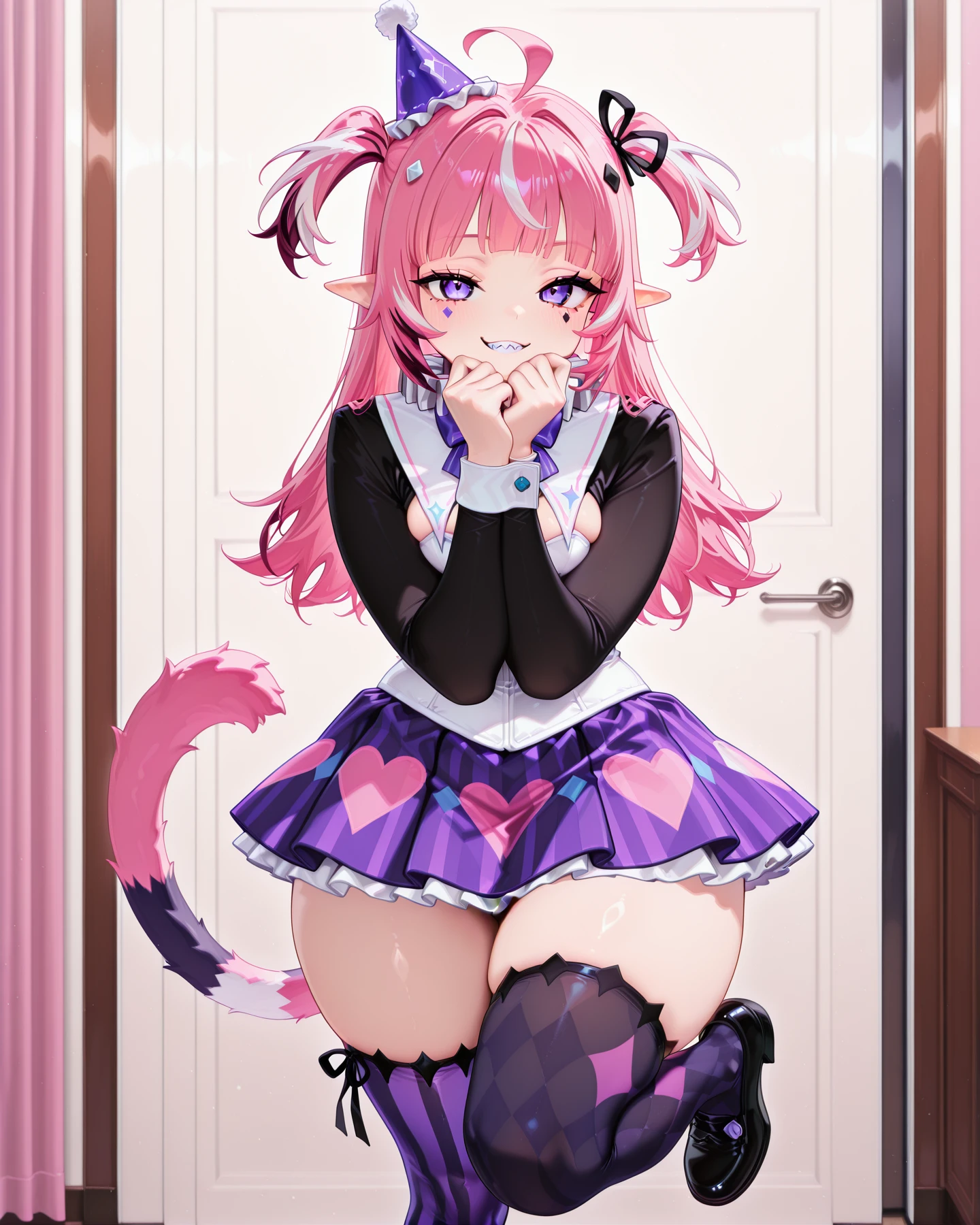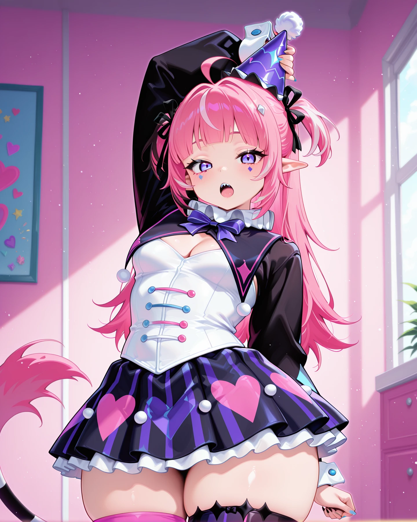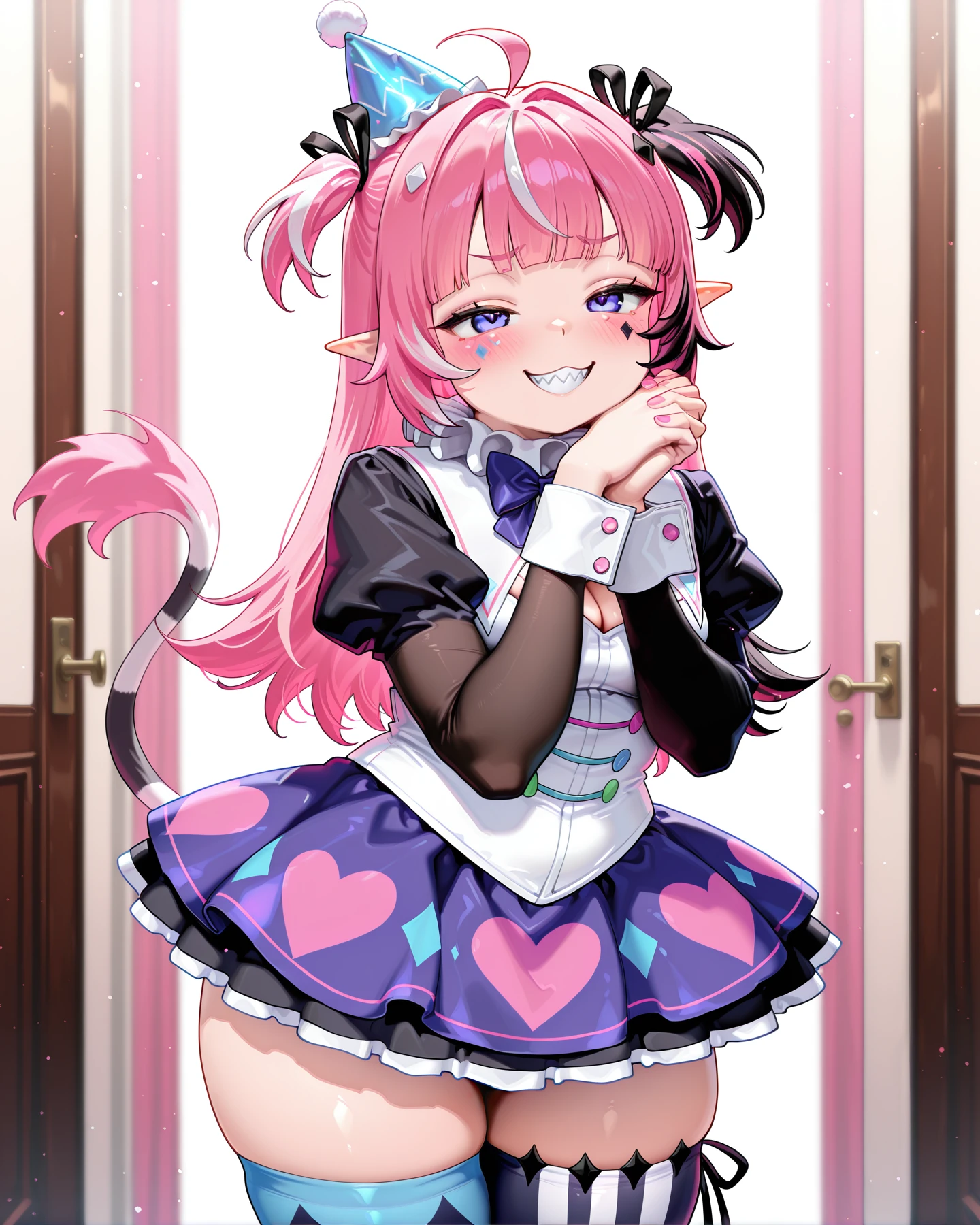 JeSMilla, pink hair, purple eyes, ahoge, two sides up, long hair, streaked hair, facial mark, black ribbon, pointy ears, medium breasts, striped tail, sharp teeth, party hat, neck ruff, neck bow, long sleeves, cleavage cutout, white corset, heart print short skirt, underskirt, wrist cuffs, frill thigh ribbon, zettai ryouiki, mismatched legwear, striped pastel thighhighs, vertical-striped black thighhigh, mismatched footwear,