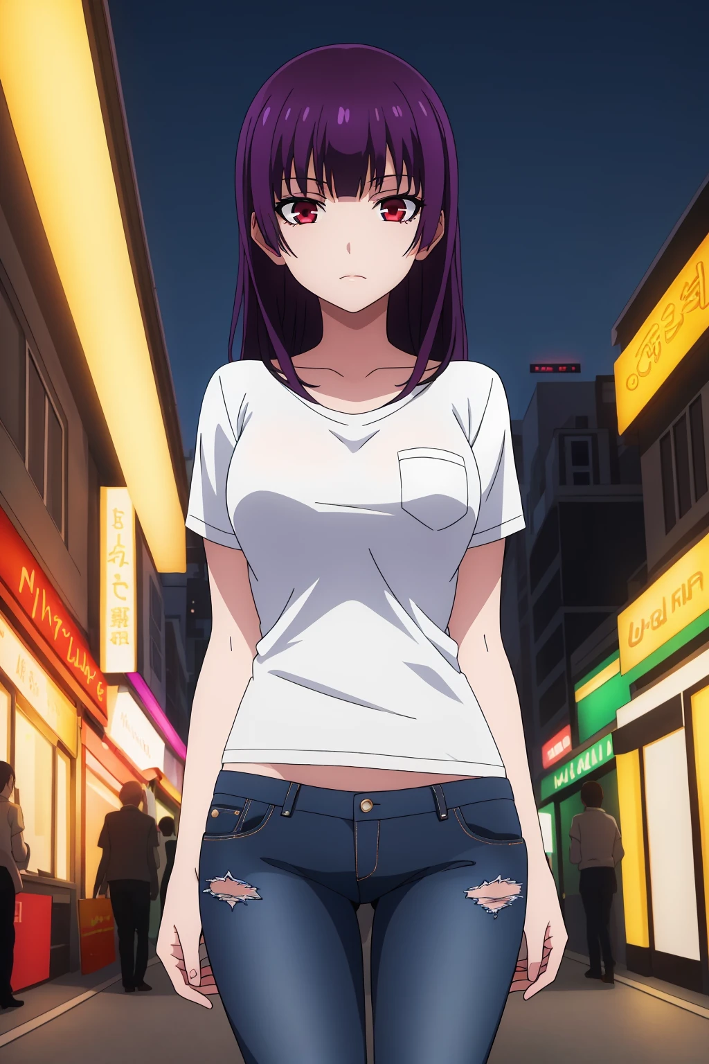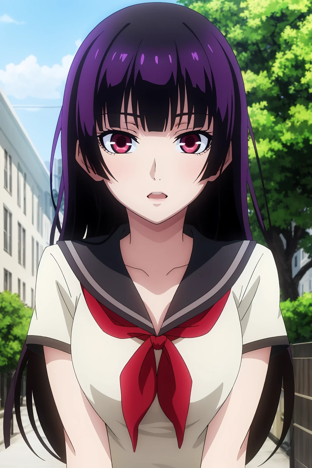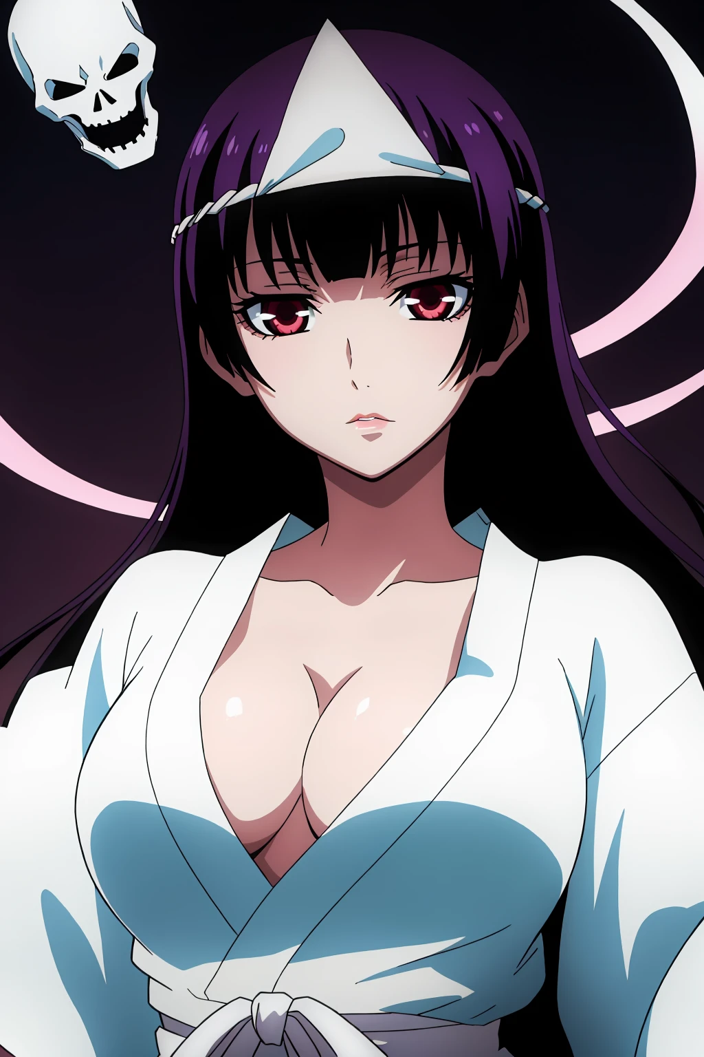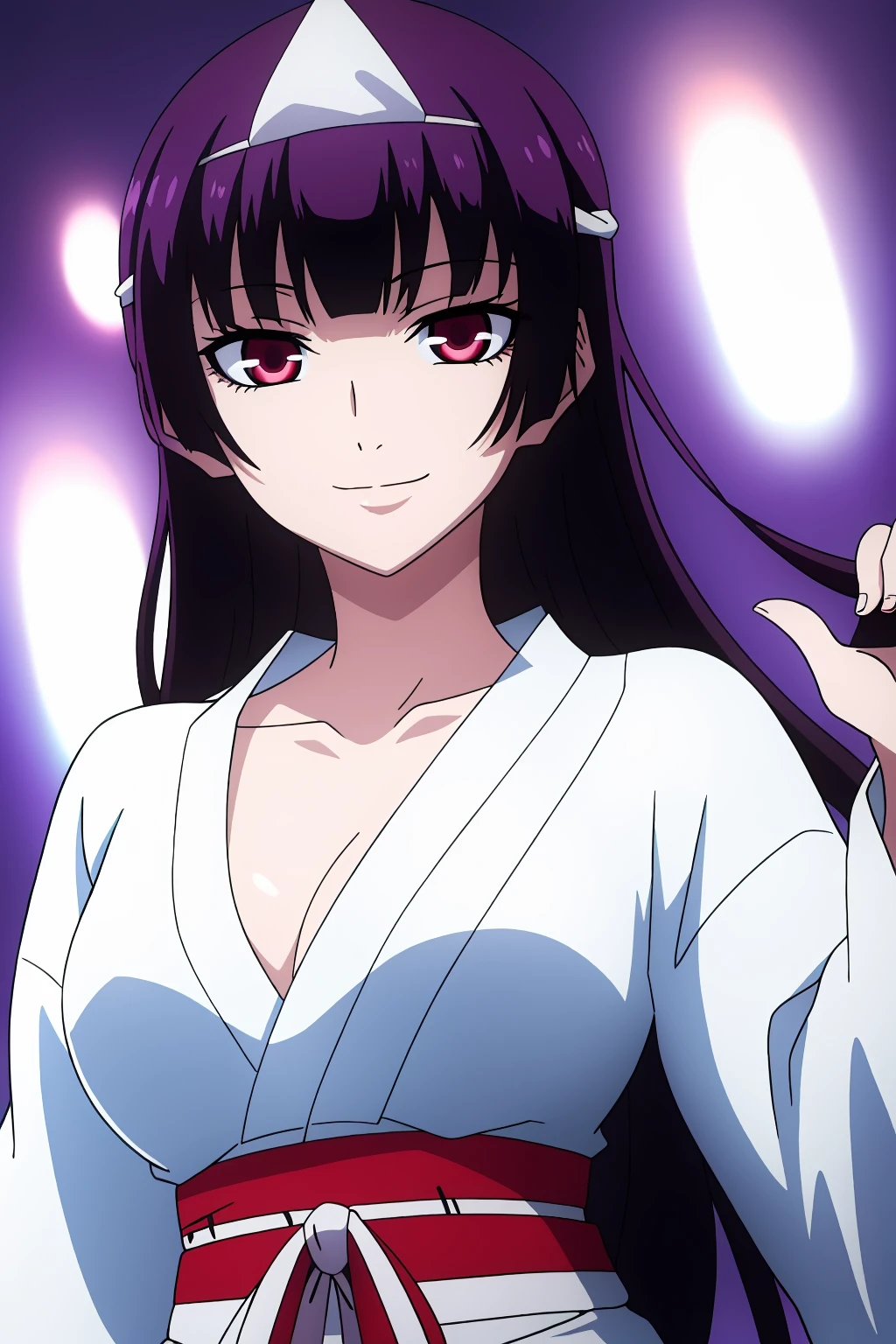Yuuko, purple hair, long hair, red eyes, hime cut, blunt bangs,