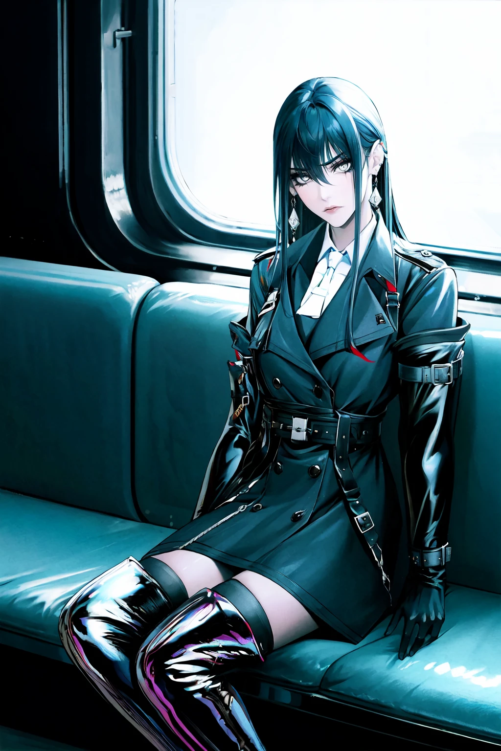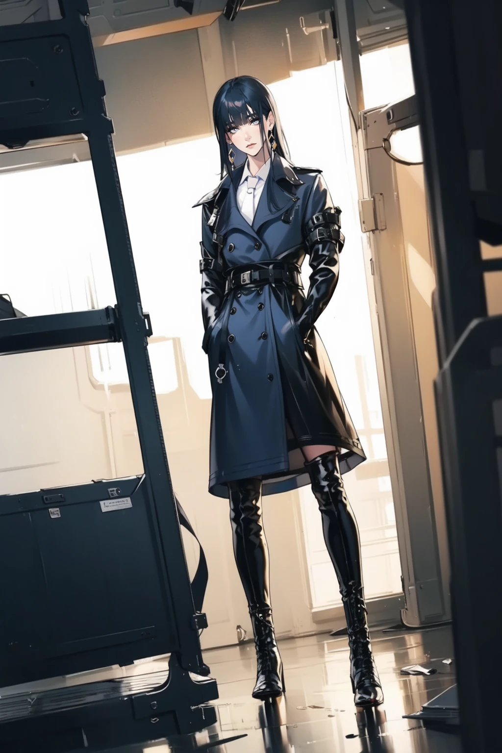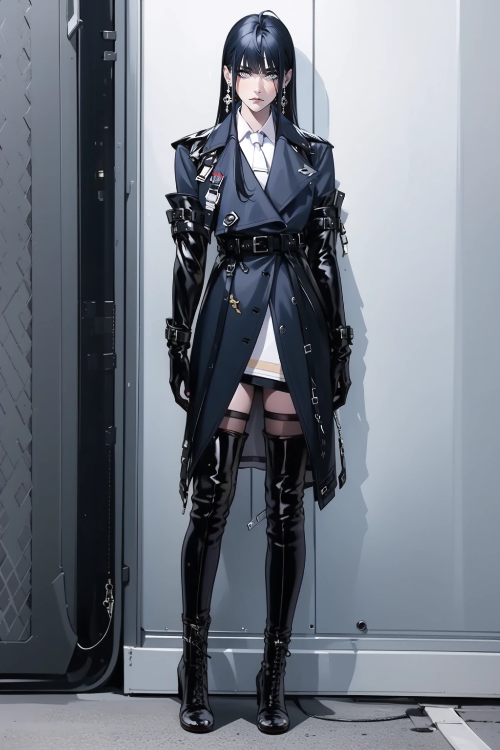 collared shirt,thigh boots,uniform,white necktie,elbow gloves,belt,jewelry,earrings,thighhighs under boots,