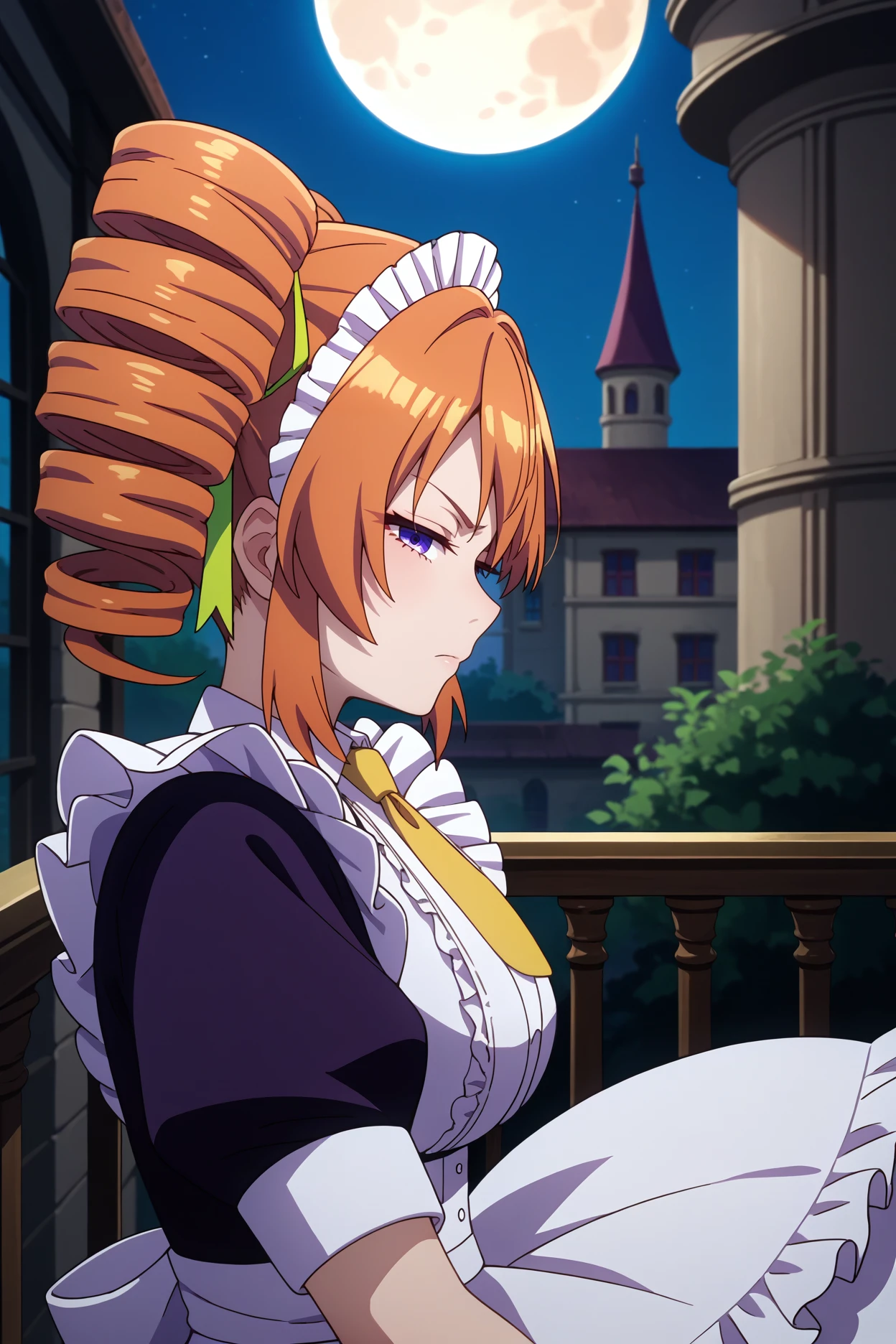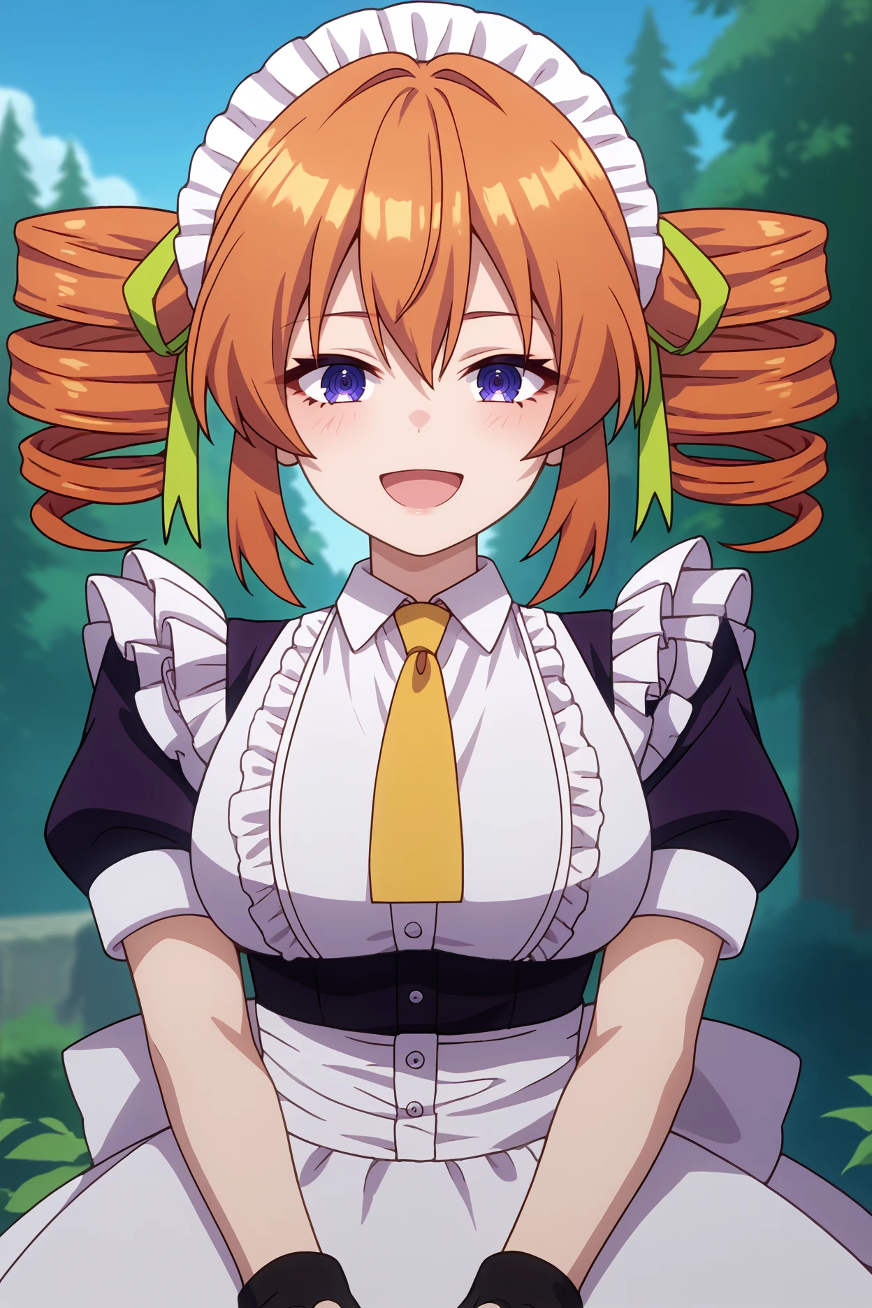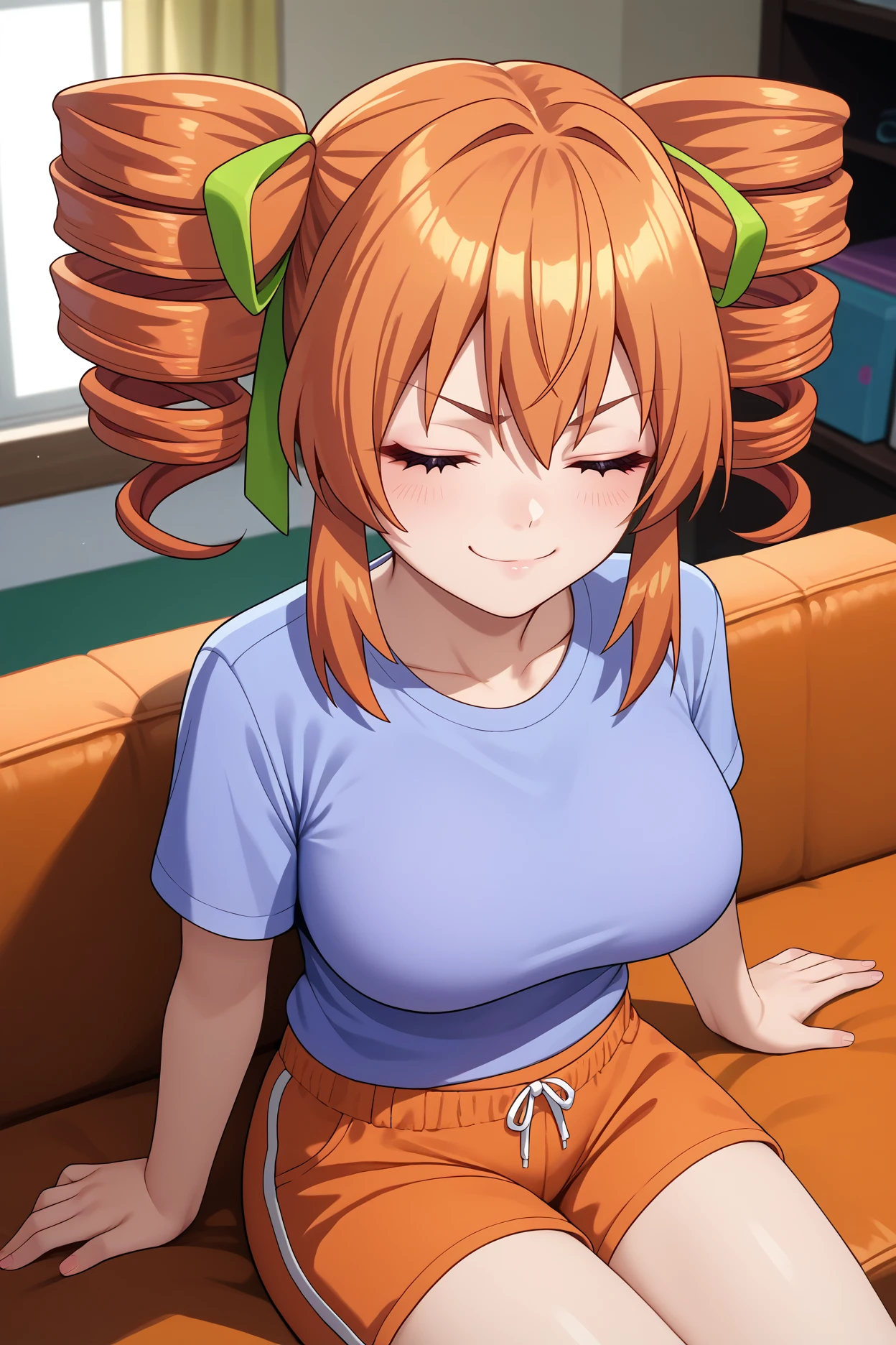 Trigger word is "grtrde" and "orange hair, twin drills, purple eyes" is required.
