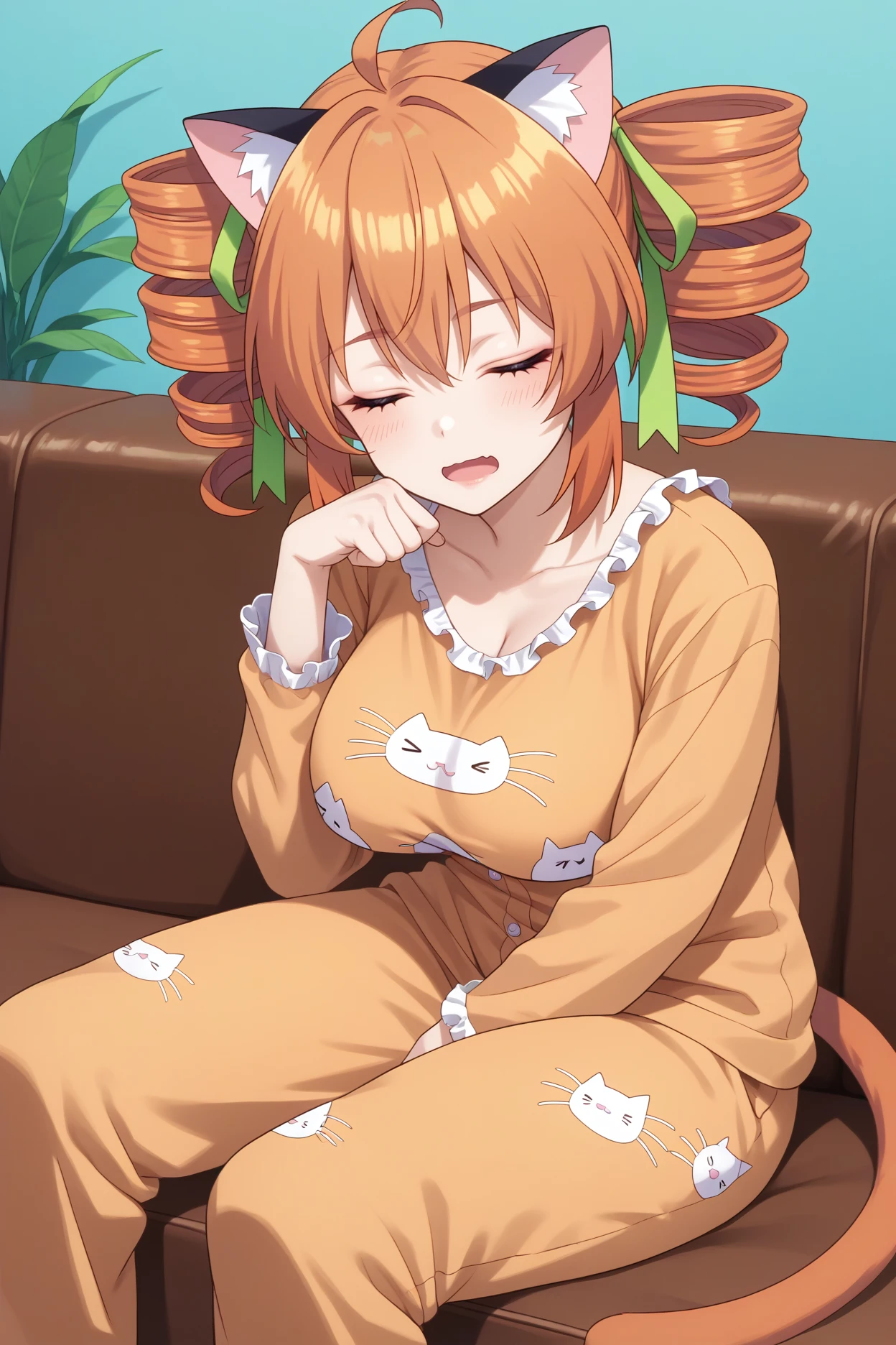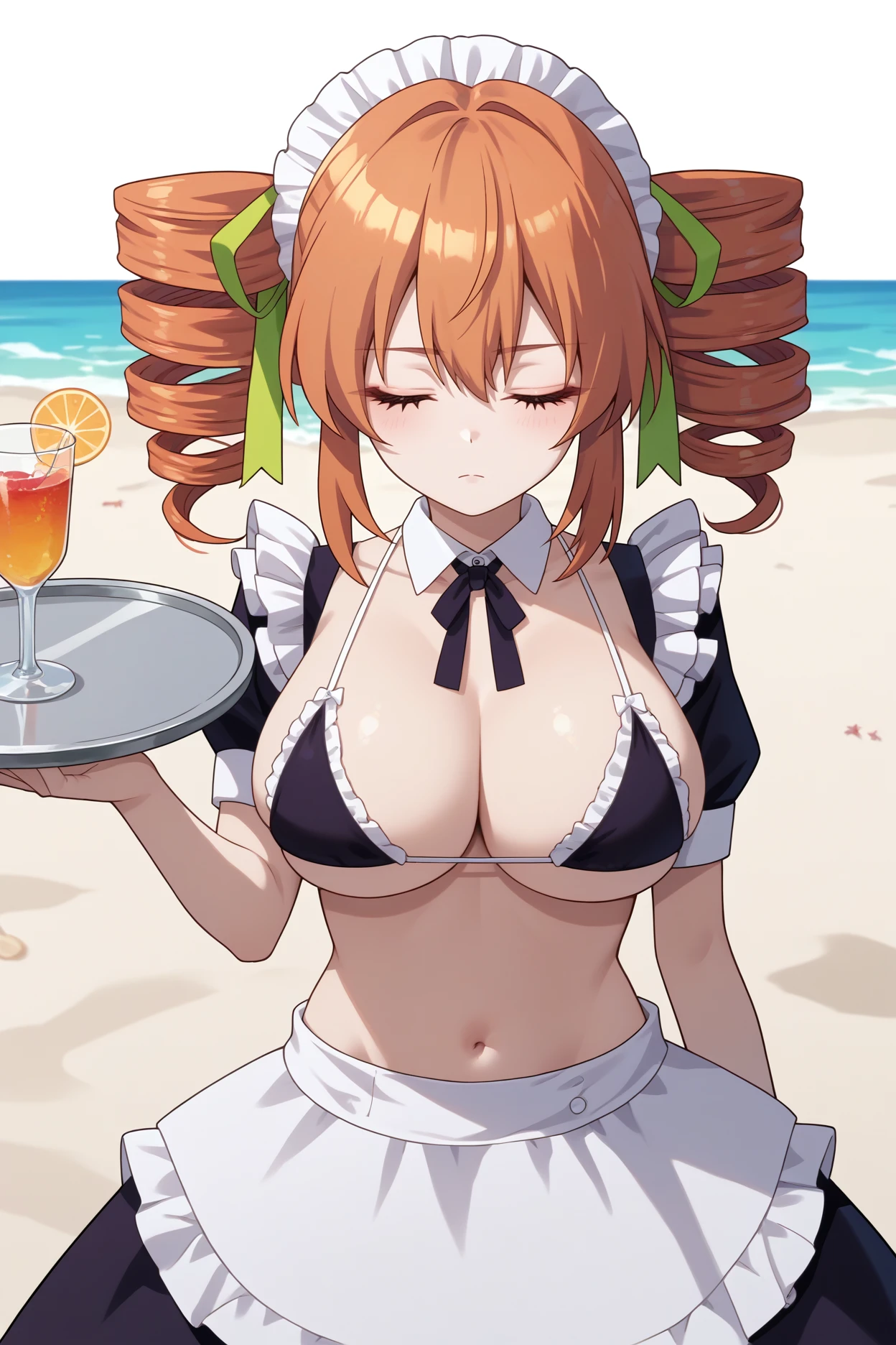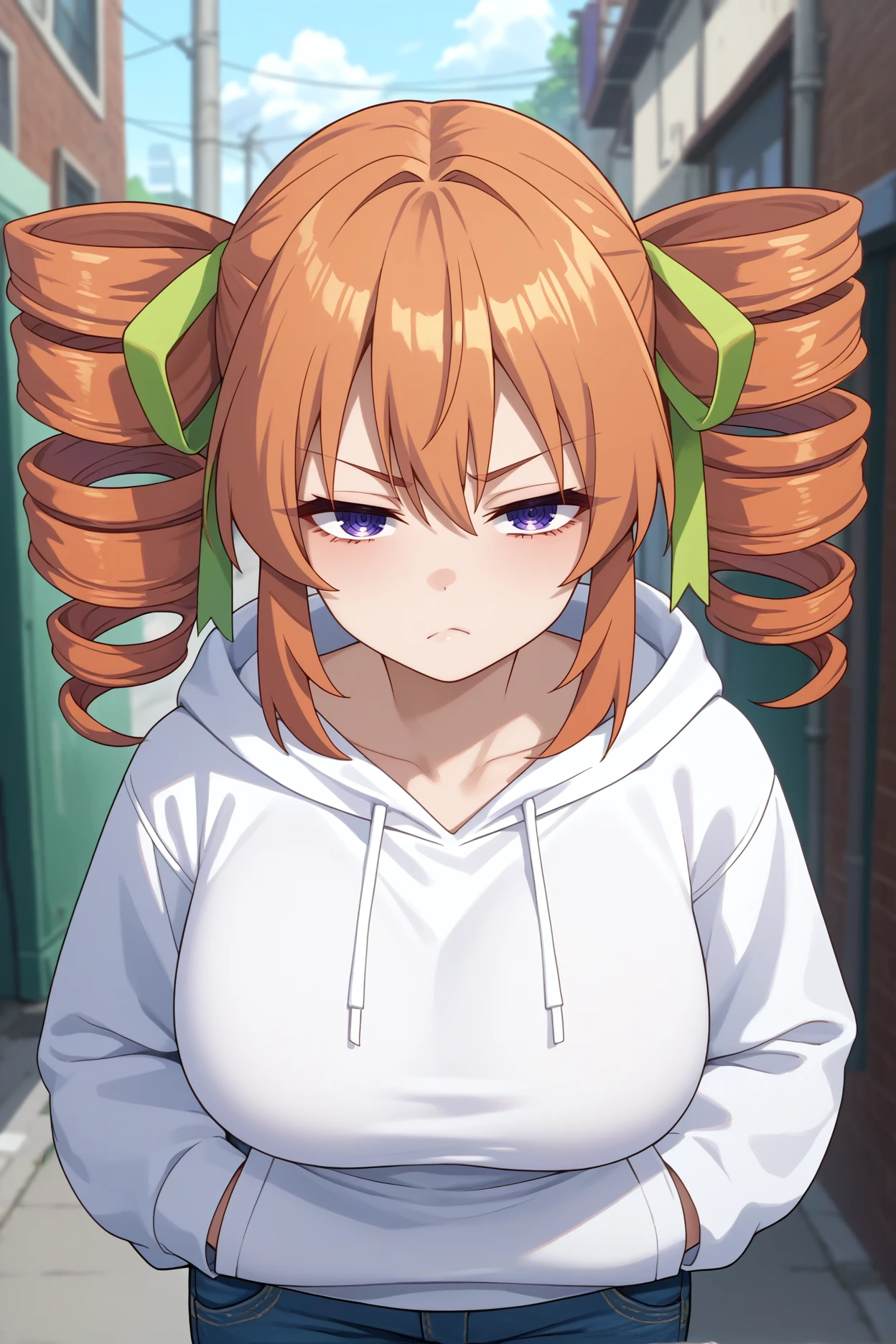 Trigger word is "grtrde" and "orange hair, twin drills, purple eyes" is required.