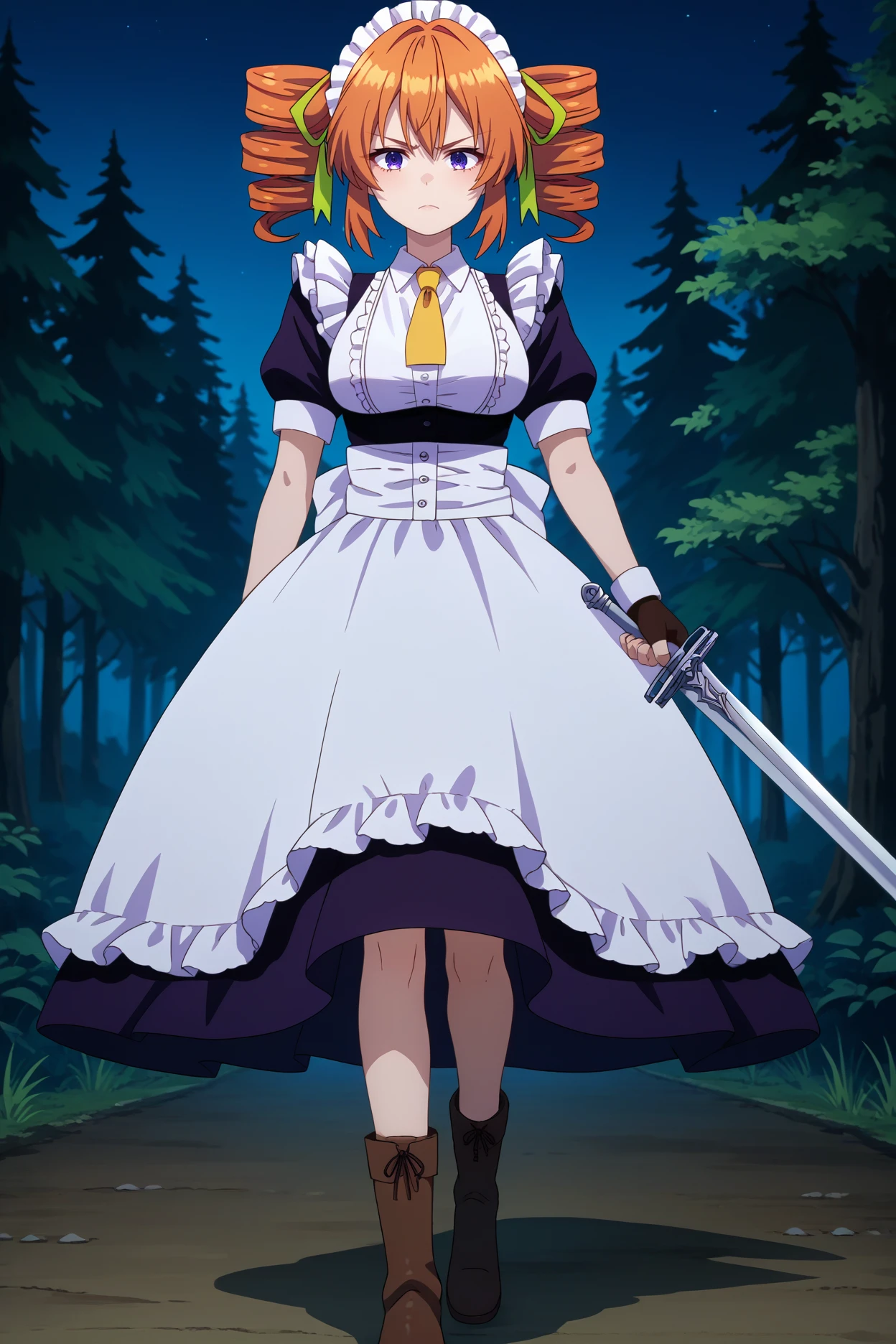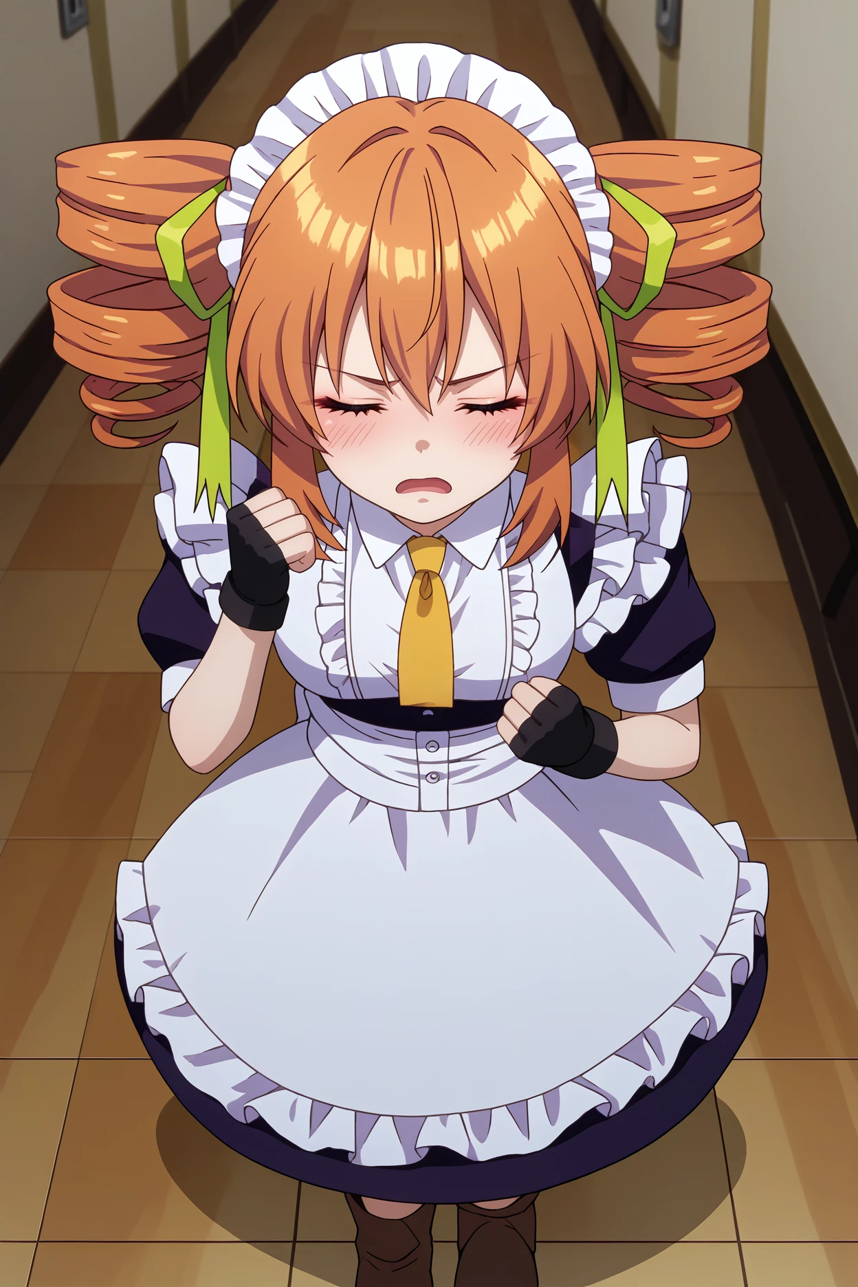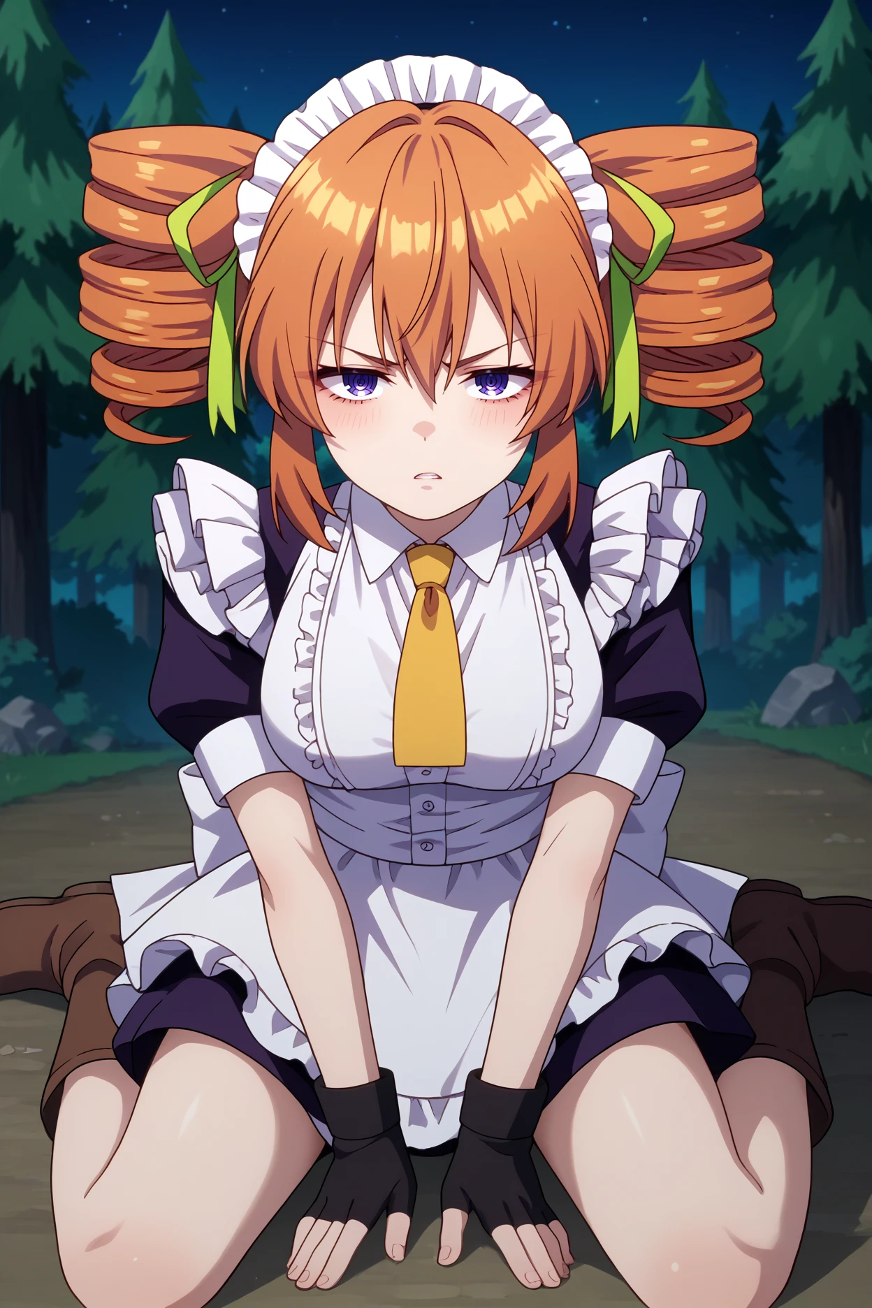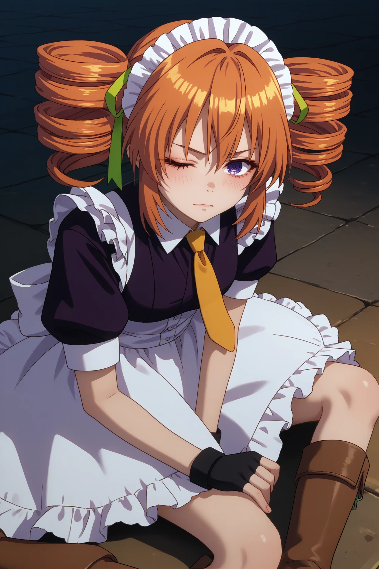 Add "hair ribbon, maid headdress, yellow necktie, short necktie, collared dress, black dress, frilled dress, puffy short sleeves, maid apron, fingerless gloves, brown boots" for her typical look.