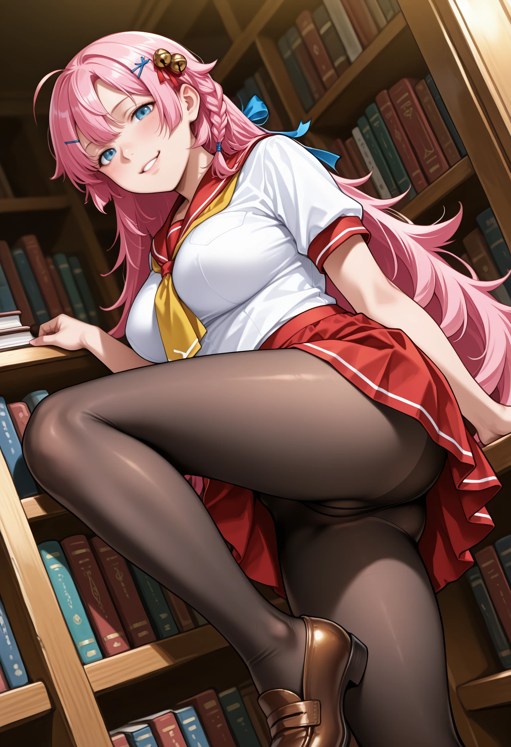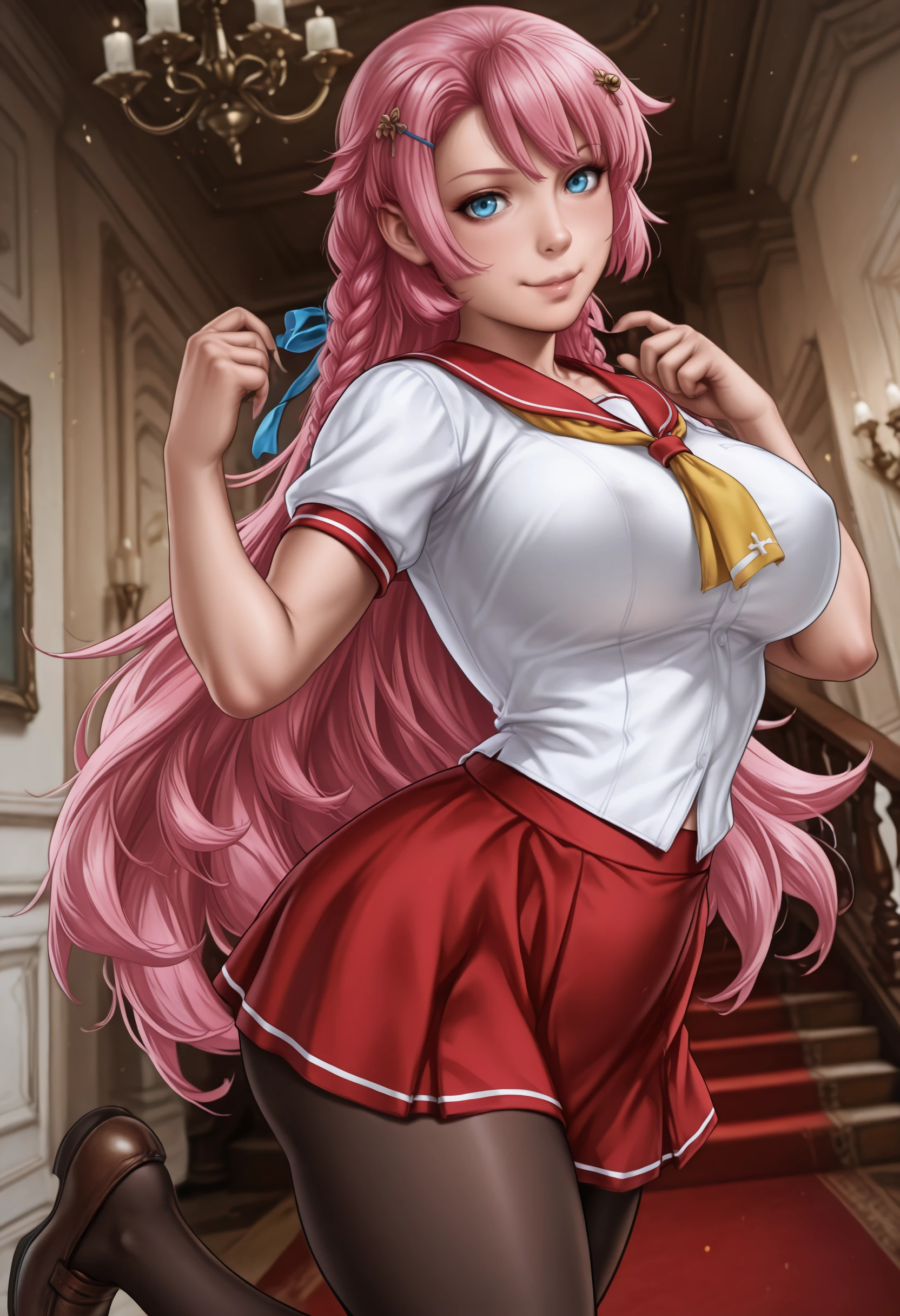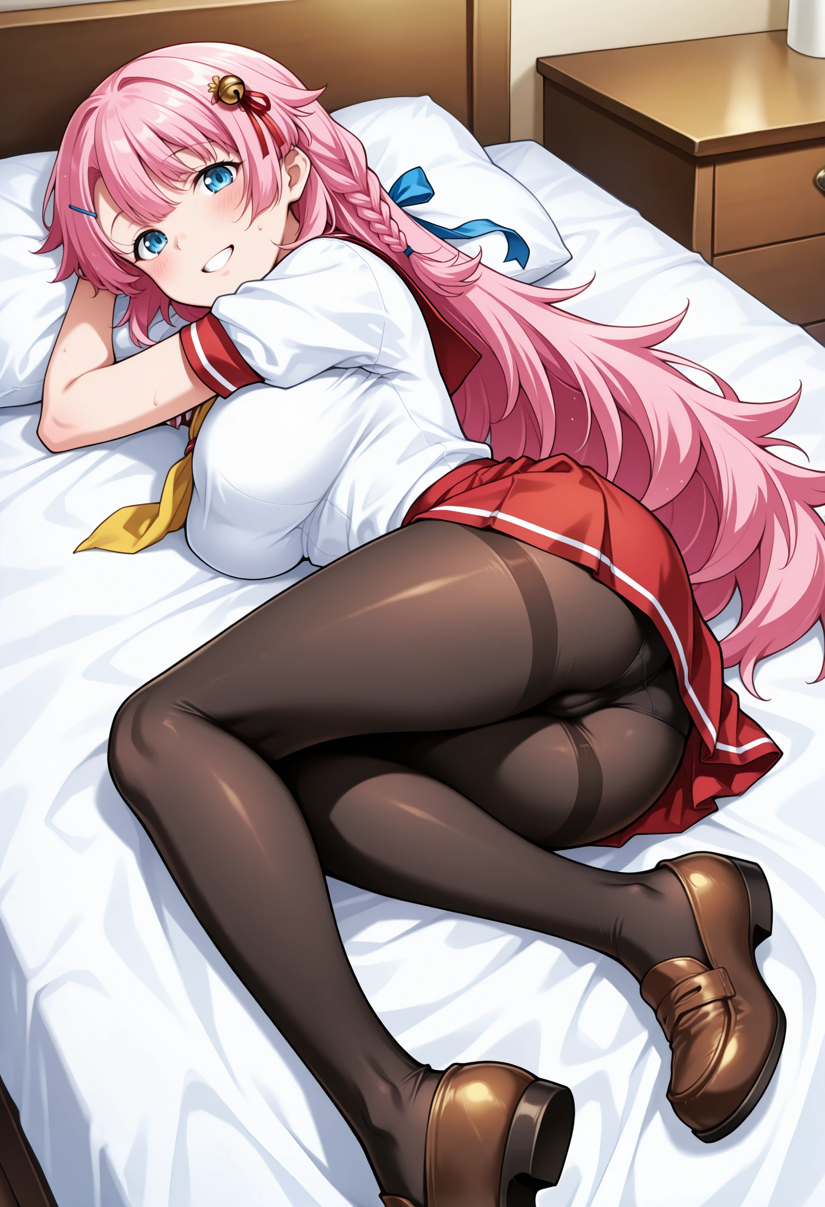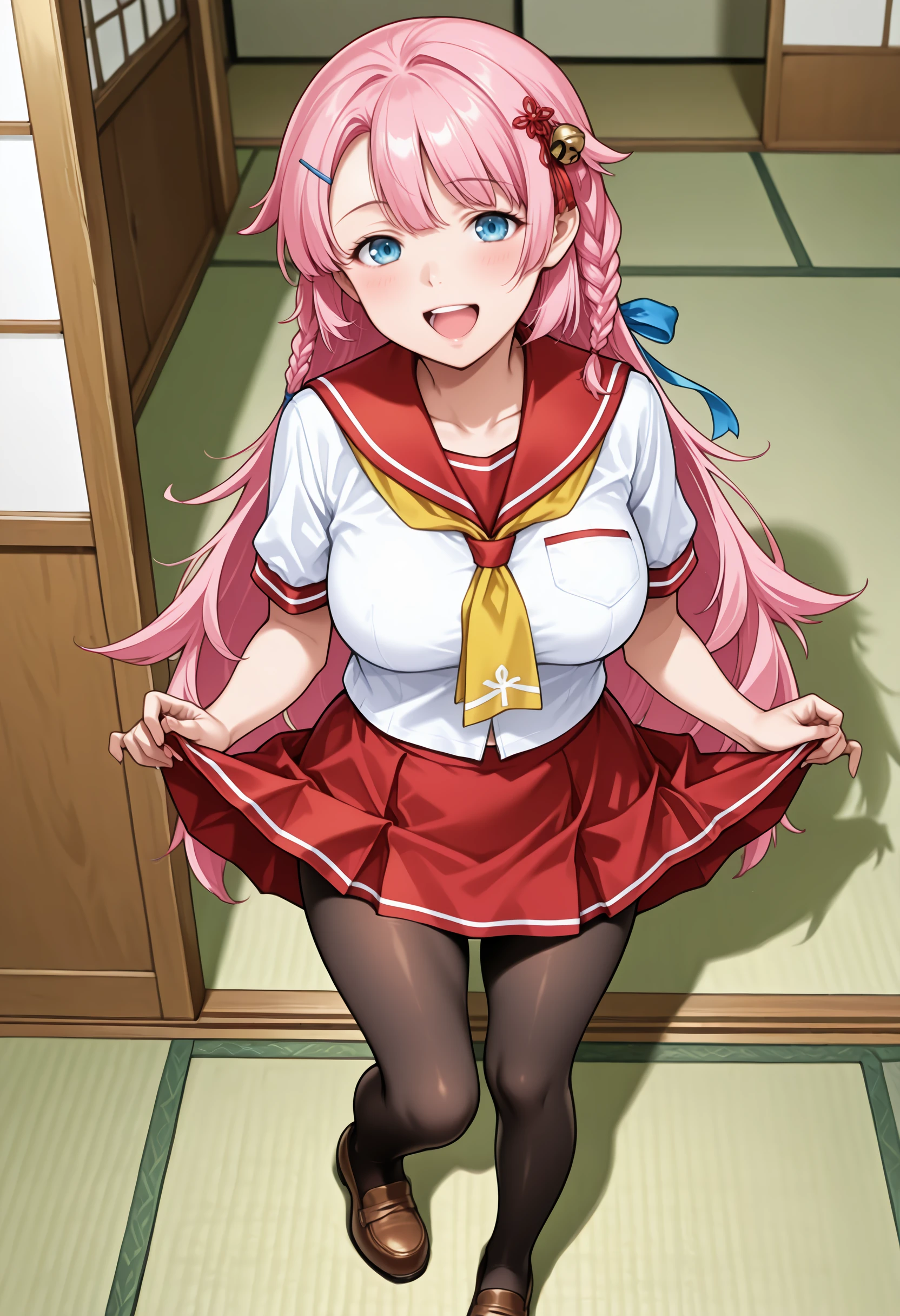Default Outfit: hair ornament, red skirt, school uniform, braid, hair ribbon, red ribbon, blue bow, hair bow, hair bell, serafuku, hairclip, black pantyhose, loafers, brown footwear, yellow neckerchief,