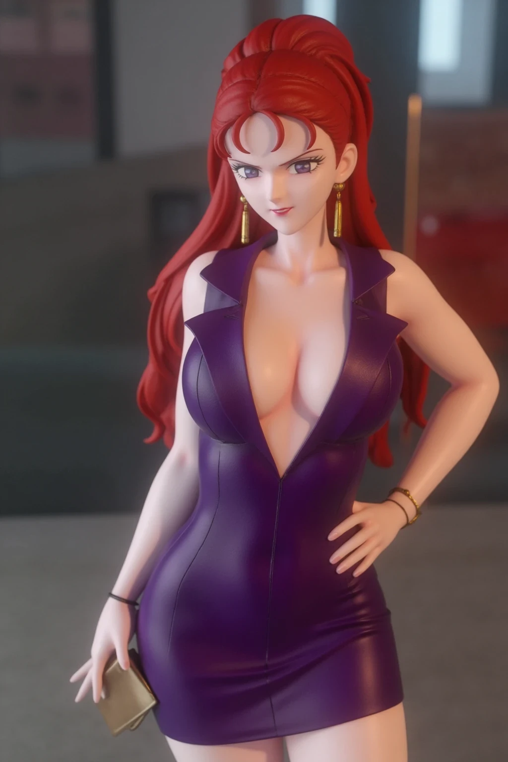 (masterpiece, best quality:1.2), 1girl, solo, _SM_Kaolinite_, red straight hair, forehead, bare shoulders, tight red dress with V-neck, pale pink skin, purple eyes, golden bracelet, gold earrings, white skin, Alone, retro anime, 90s anime style, red classic high heels, red lips makeup, hair slicked back, Ponytail braid, formal dress, LONG EYELASHES, Thick eyelashes,