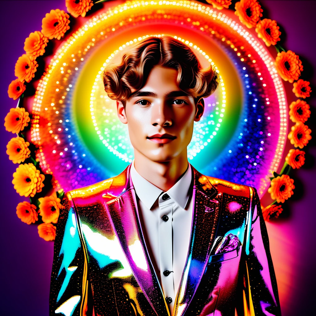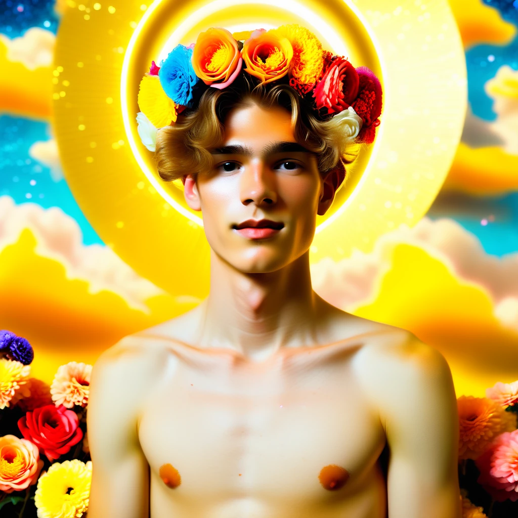 It generates striking portraits of young adult male figures presented like living icons: glowing halos, sparkling glitter, lush flowers and ultra-saturated colors.
