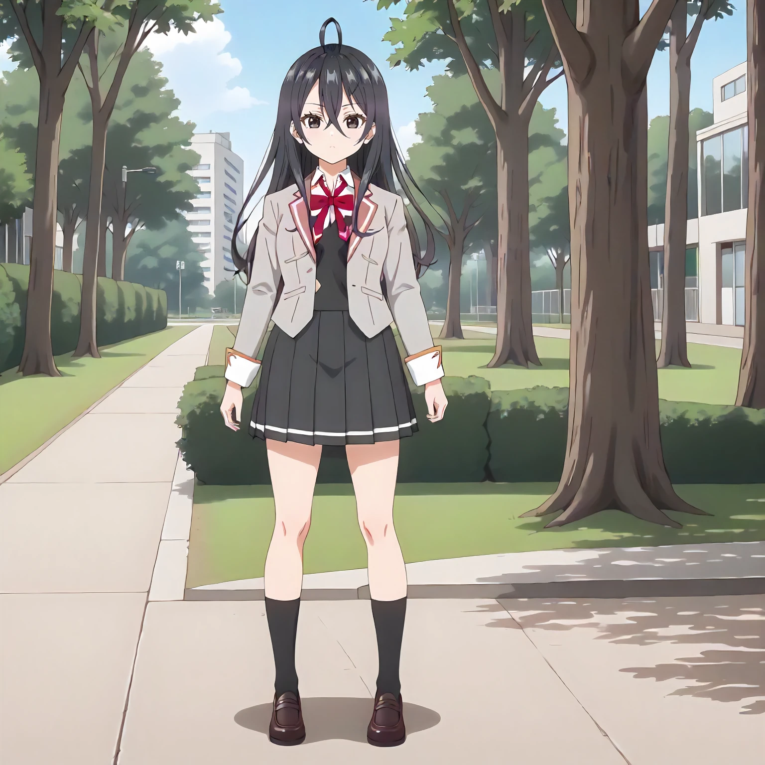 school_uniform,gray jacket,red ribbon tie,black vest, black socks,